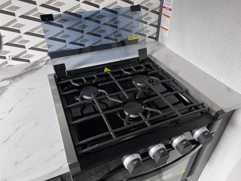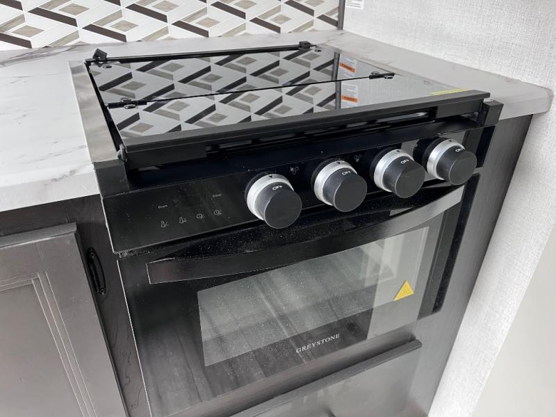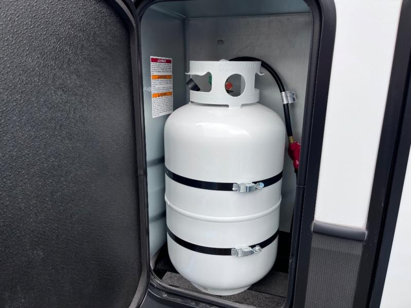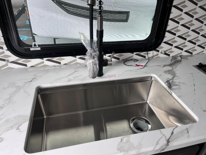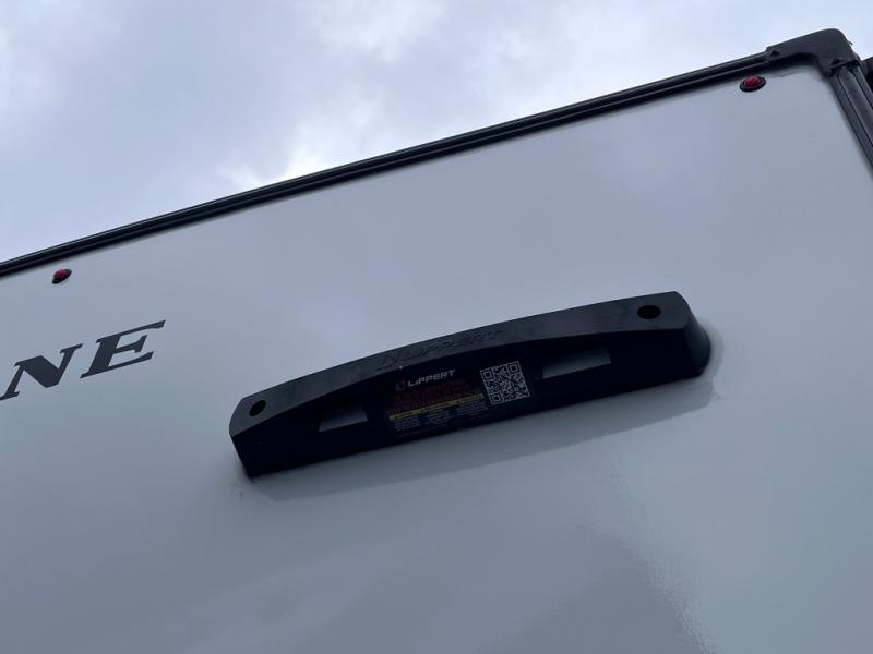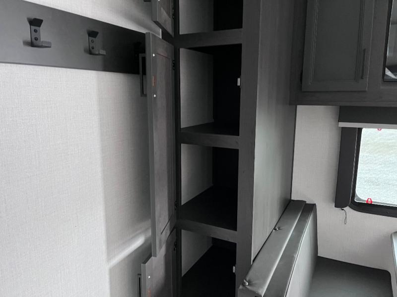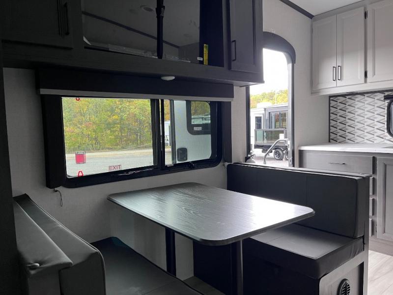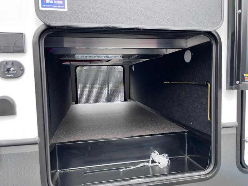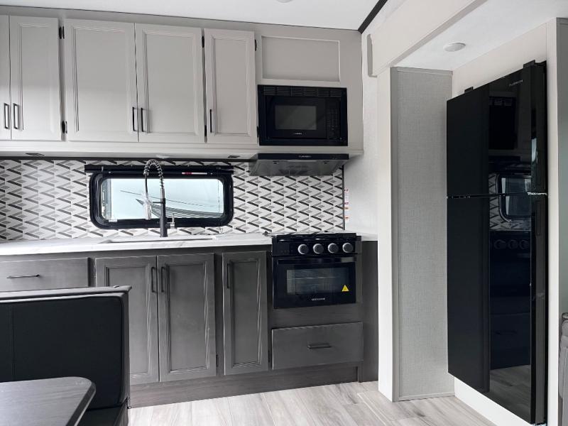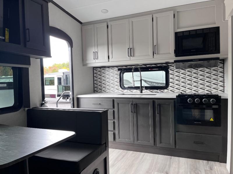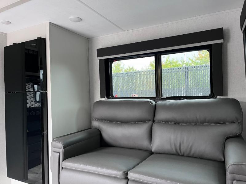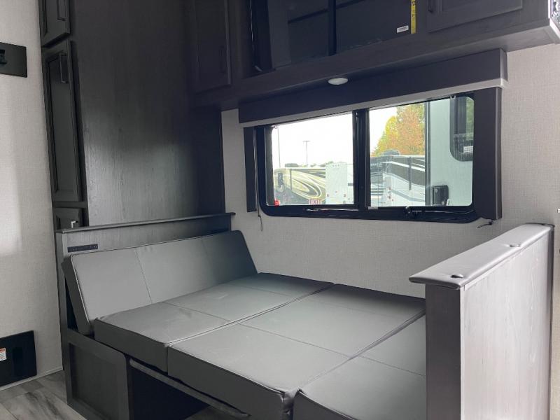 This rear kitchen fifth wheel includes ample counter space to prep meals and feed your crew. There is a tri-fold sleeper sofa slide for added space and a TV right across the sofa for easy viewing, or you can choose the optional theater seating if you don't need the extra sleeping space. Once lunch is ready, you can dine at the booth dinette or head outdoors to sit under the 17' electric awning. The full bath lets you clean up each day, and you'll feel right at home having your own private bedroom up front with a queen bed!