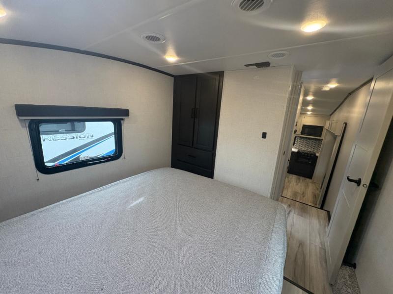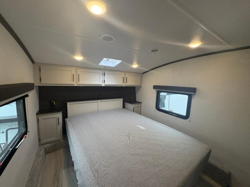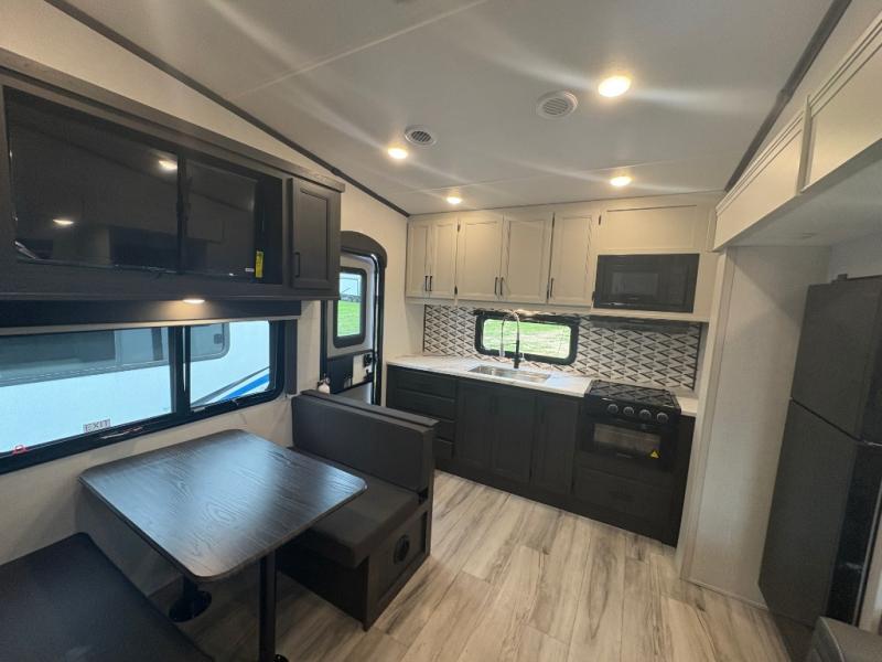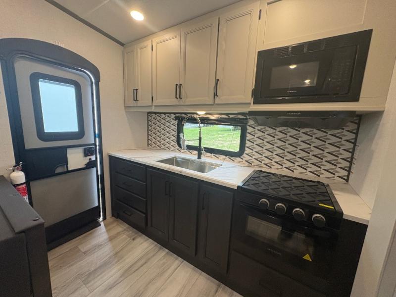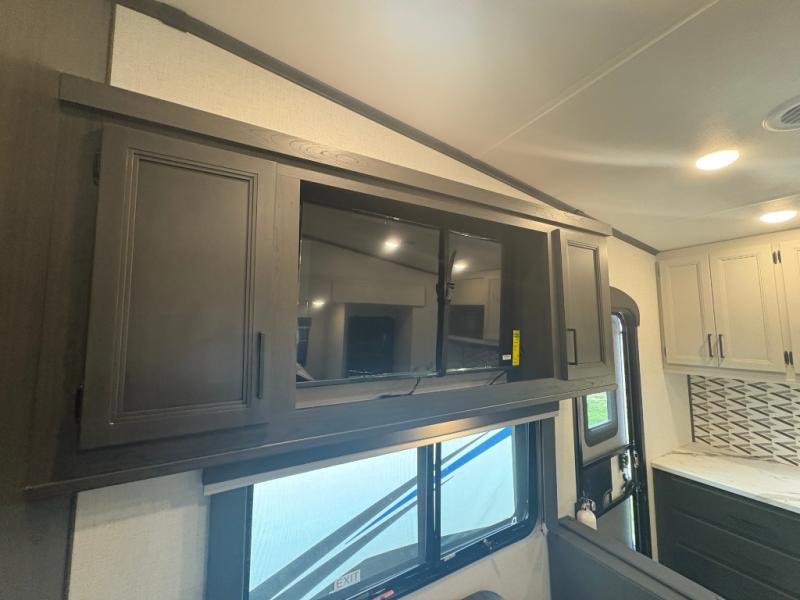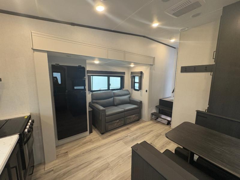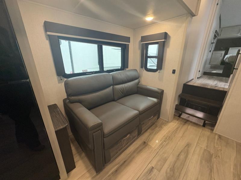 This rear kitchen fifth wheel includes ample counter space to prep meals and feed your crew. There is a tri-fold sleeper sofa slide for added space and a TV right across the sofa for easy viewing, or you can choose the optional theater seating if you don't need the extra sleeping space. Once lunch is ready, you can dine at the booth dinette or head outdoors to sit under the 17' electric awning. The full bath lets you clean up each day, and you'll feel right at home having your own private bedroom up front with a queen bed!