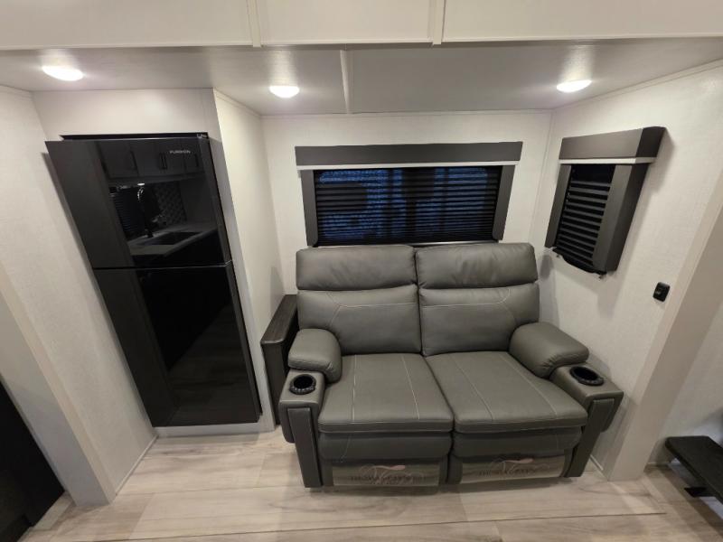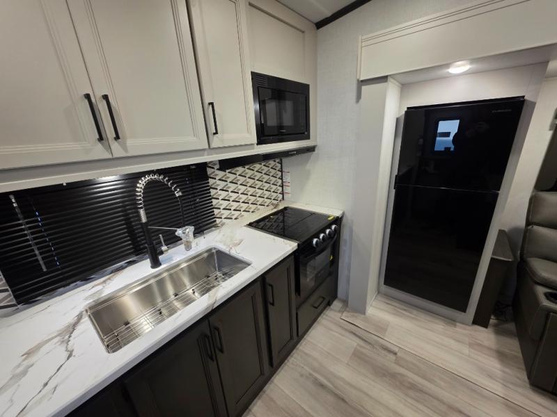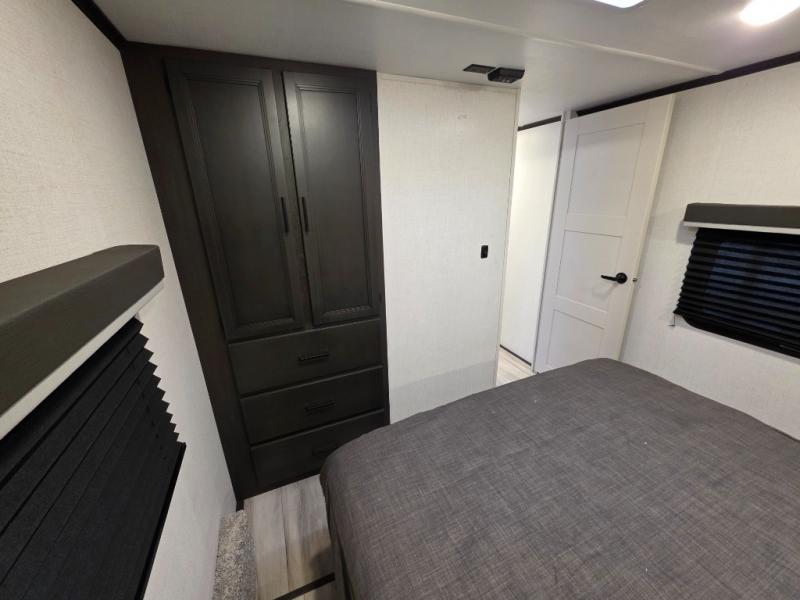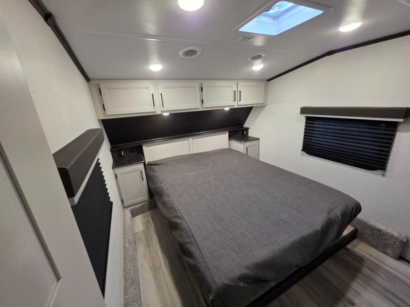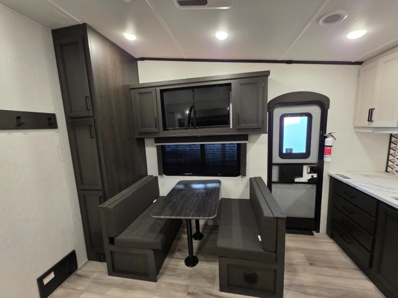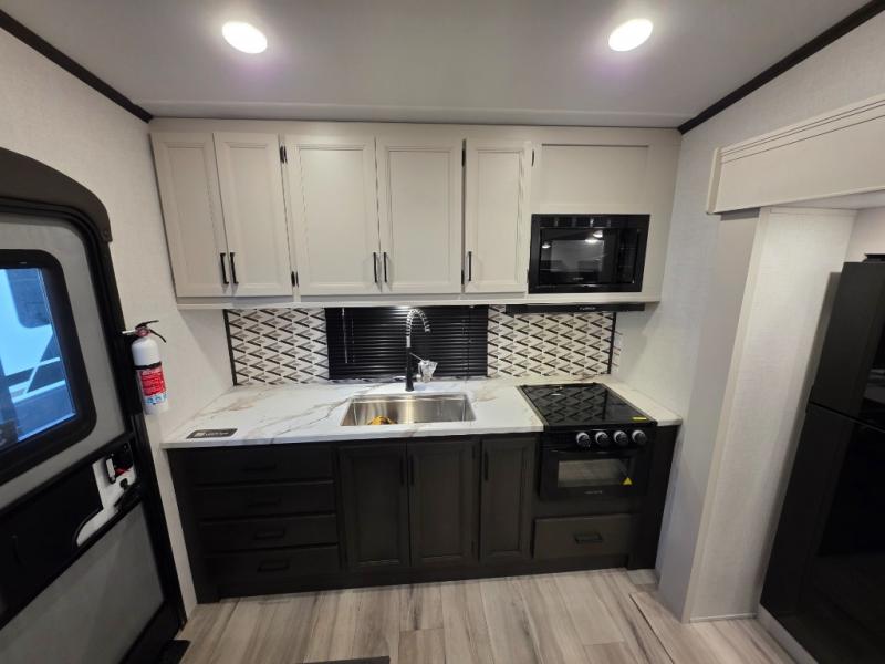 This rear kitchen fifth wheel includes ample counter space to prep meals and feed your crew. There is a tri-fold sleeper sofa slide for added space and a TV right across the sofa for easy viewing, or you can choose the optional theater seating if you don't need the extra sleeping space. Once lunch is ready, you can dine at the booth dinette or head outdoors to sit under the 17' electric awning. The full bath lets you clean up each day, and you'll feel right at home having your own private bedroom up front with a queen bed!