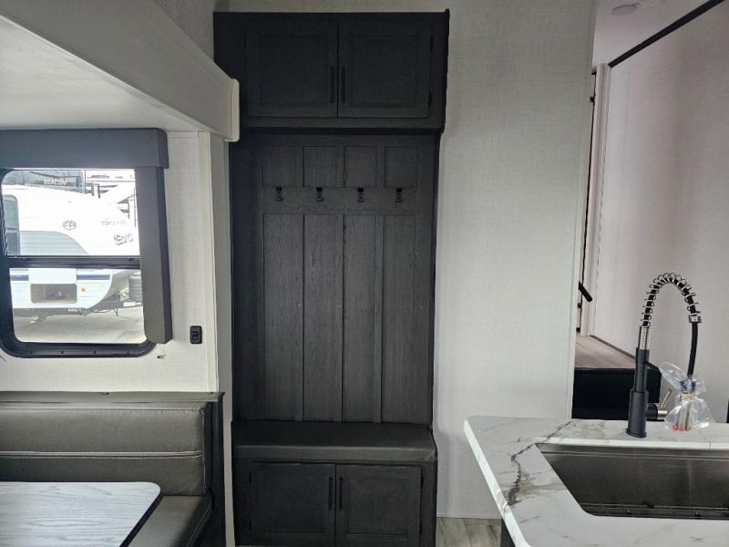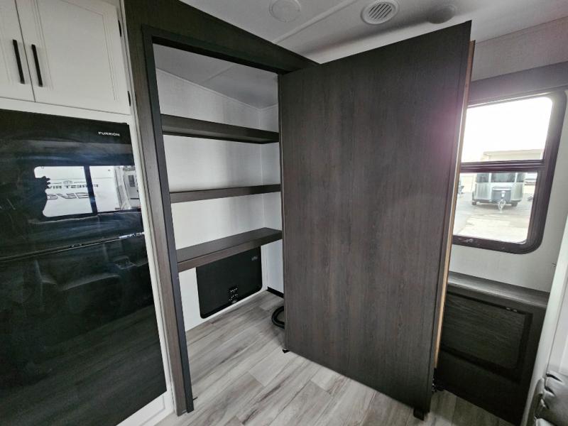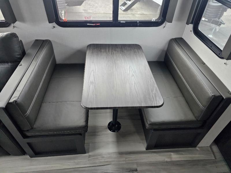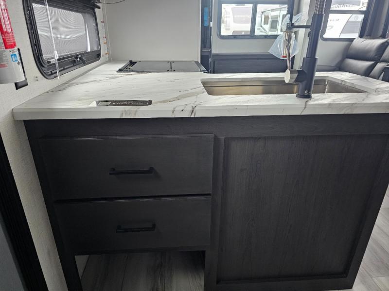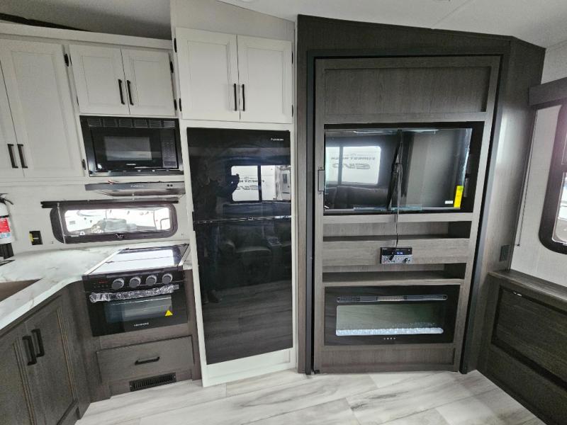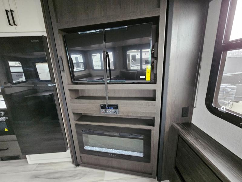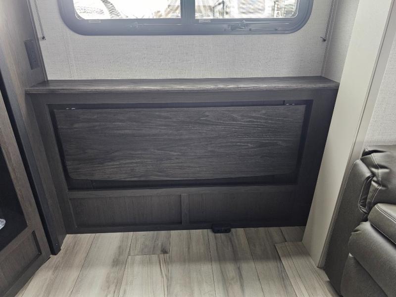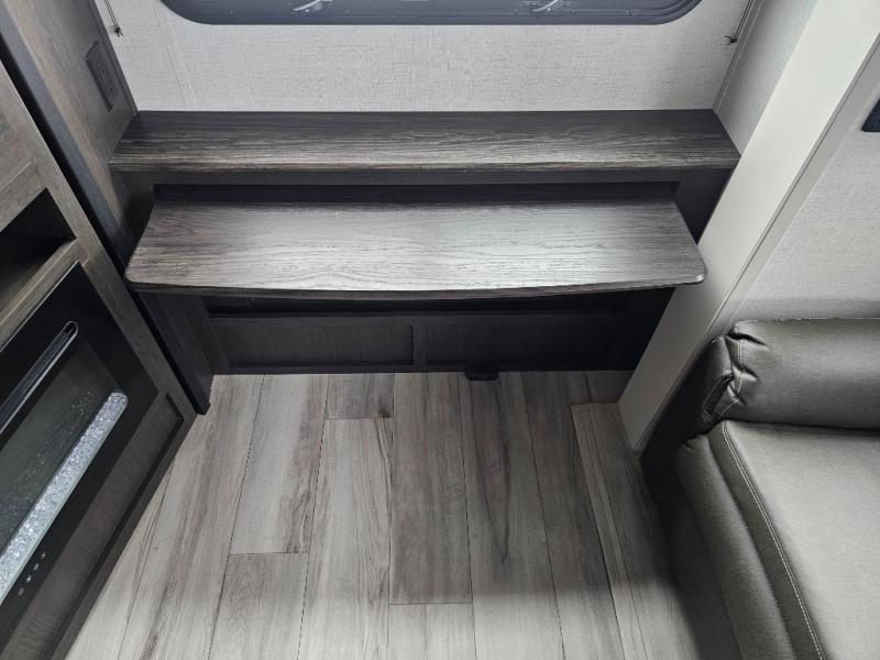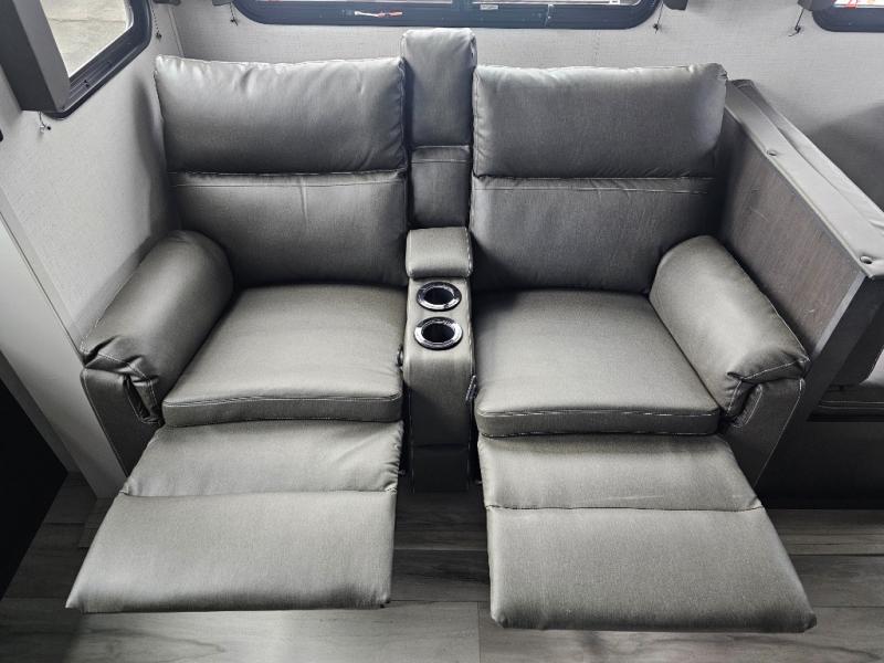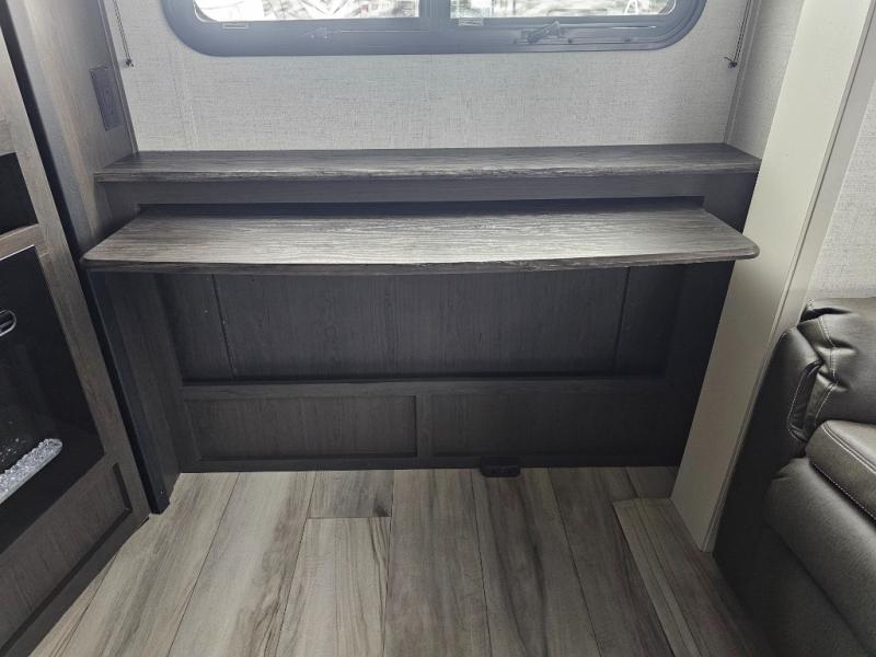 Trips to the lake are made complete in this spacious fifth wheel that can sleep five each night. You'll enjoy your own private bedroom up front that includes a queen bed, a wardrobe, plus bedside wardrobes and nightstands for your things. After you've made dinner on the cooktop, you can dine at the booth dinette. There is additional seating on the tri-fold sofa, and both of these areas can double as sleeping space for guests. If you're wanting a little more comfort, just choose the optional theater seating in place of the sofa. A flip-up desk in the back will let you get some work done if needed, and the hidden walk-in pantry behind the TV/fireplace is a huge convenience!