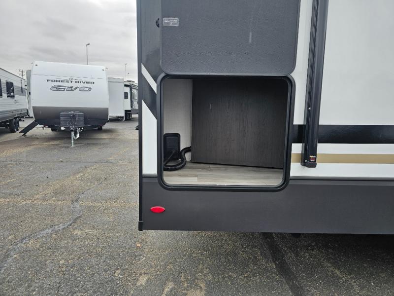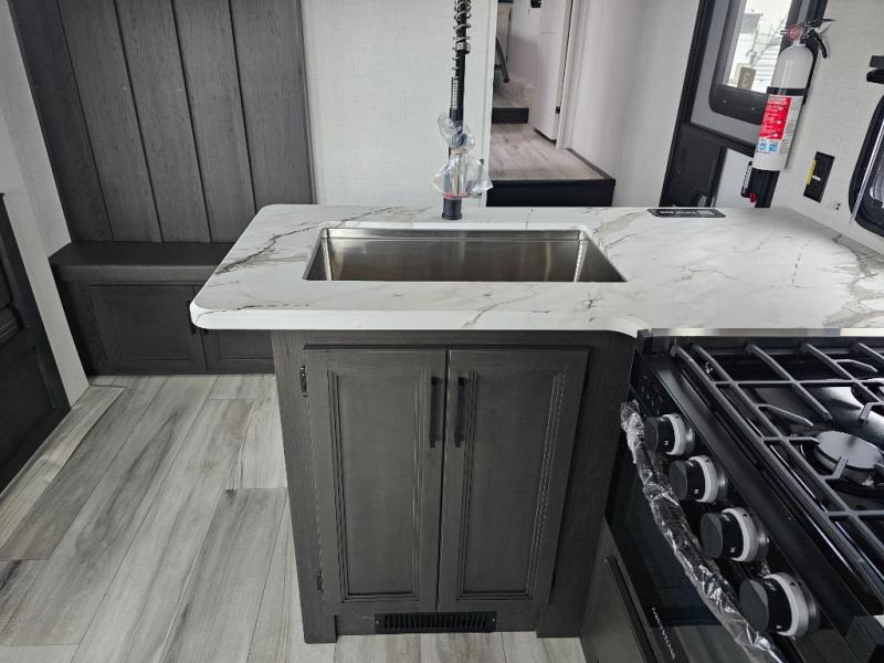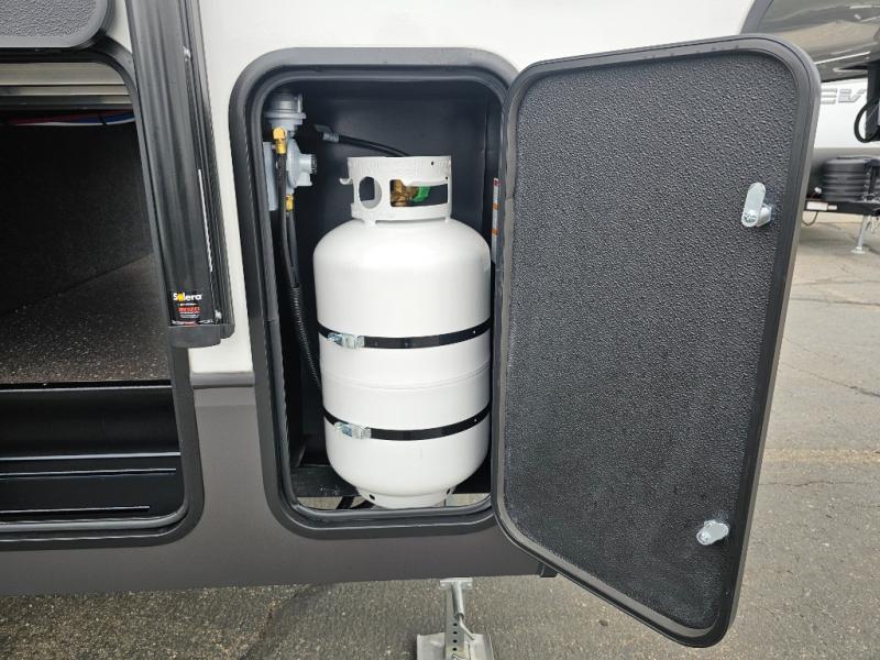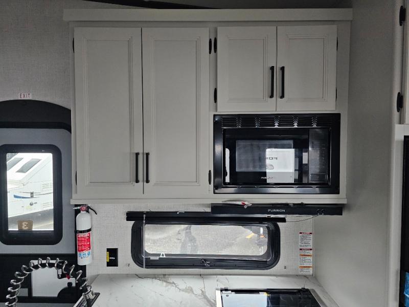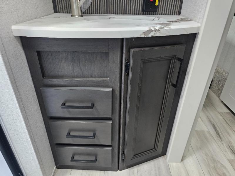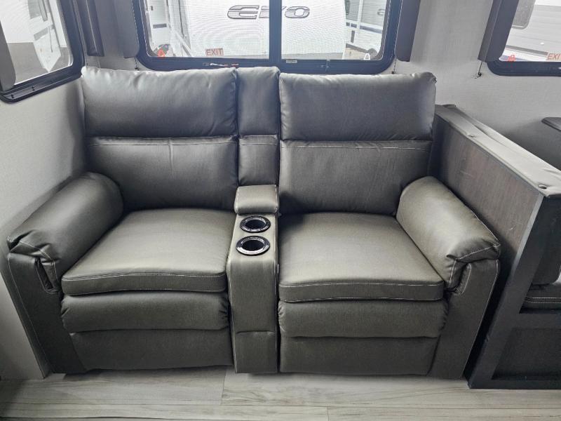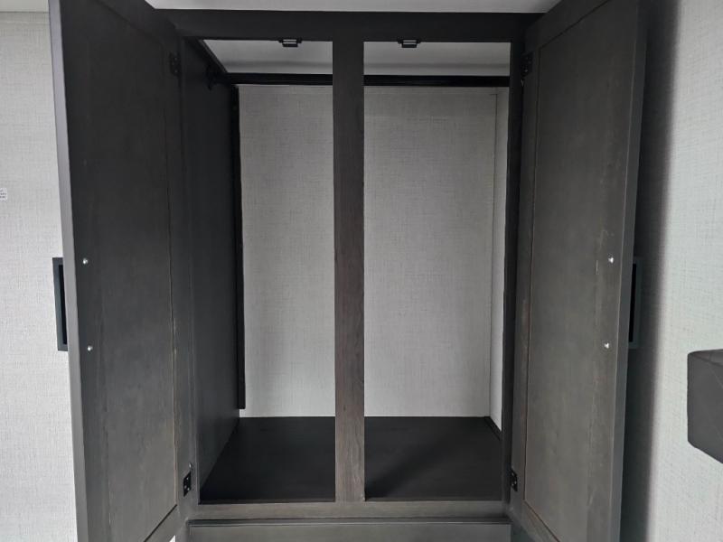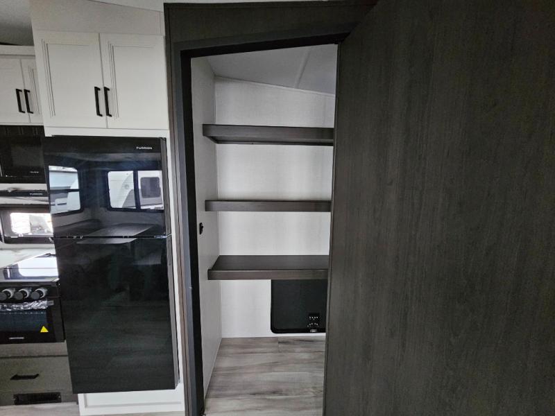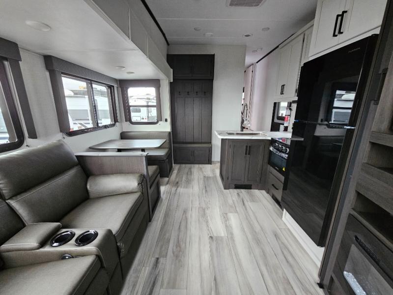 Trips to the lake are made complete in this spacious fifth wheel that can sleep five each night. You'll enjoy your own private bedroom up front that includes a queen bed, a wardrobe, plus bedside wardrobes and nightstands for your things. After you've made dinner on the cooktop, you can dine at the booth dinette. There is additional seating on the tri-fold sofa, and both of these areas can double as sleeping space for guests. If you're wanting a little more comfort, just choose the optional theater seating in place of the sofa. A flip-up desk in the back will let you get some work done if needed, and the hidden walk-in pantry behind the TV/fireplace is a huge convenience!