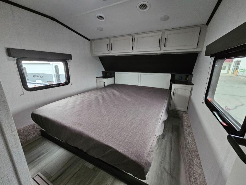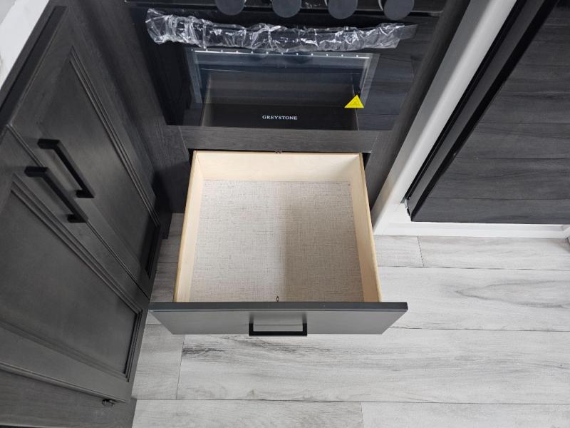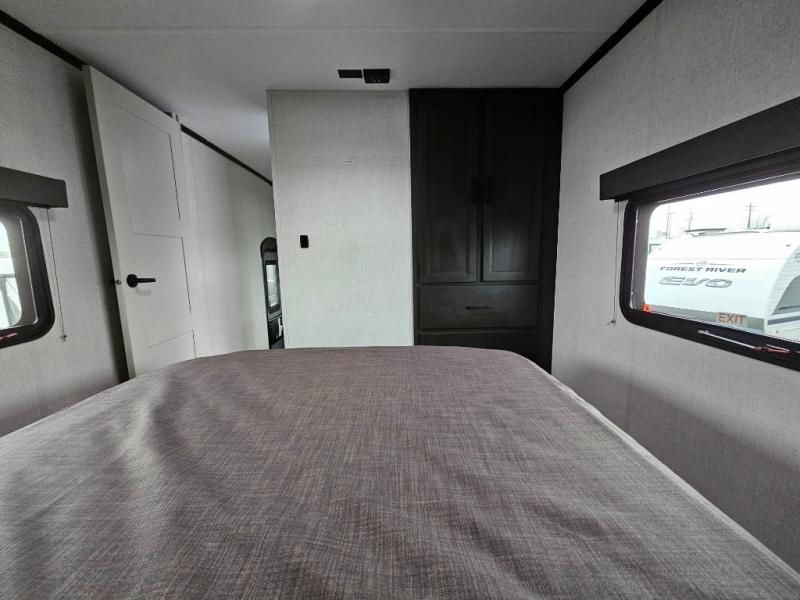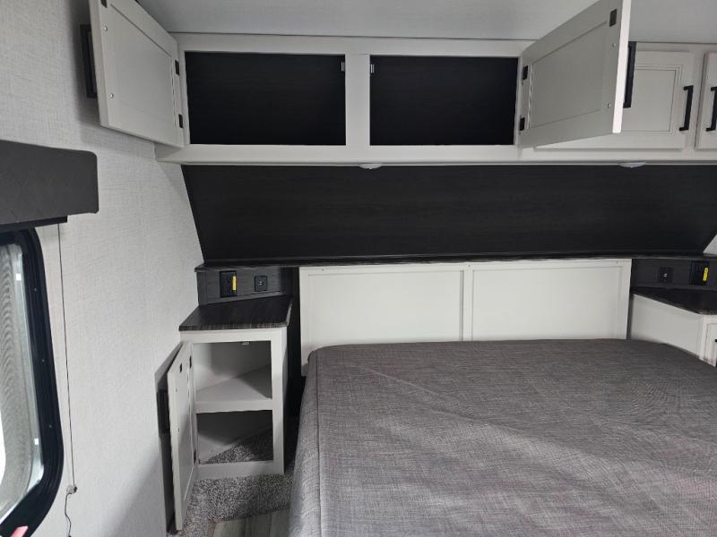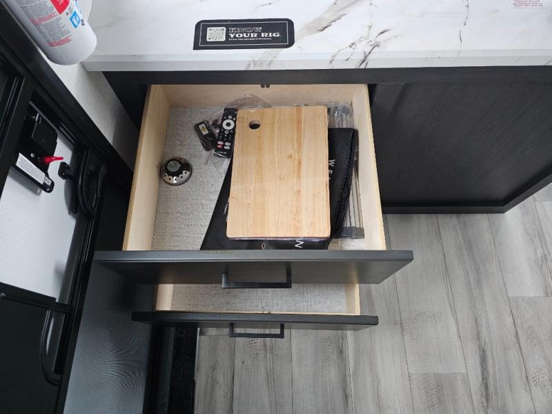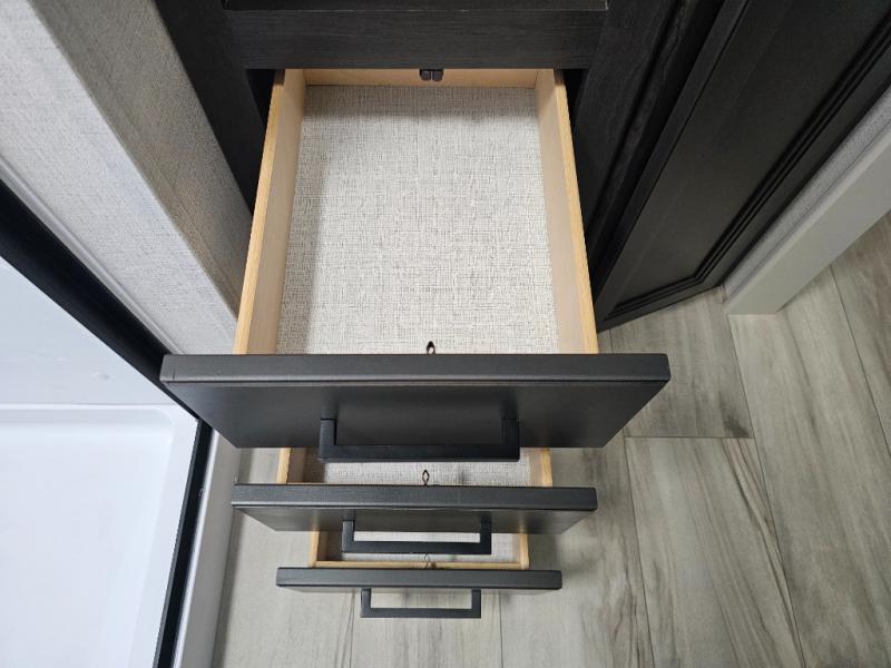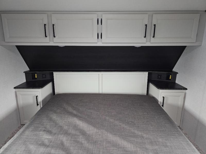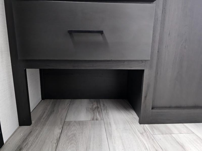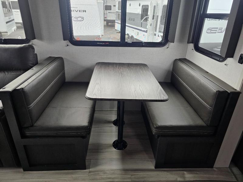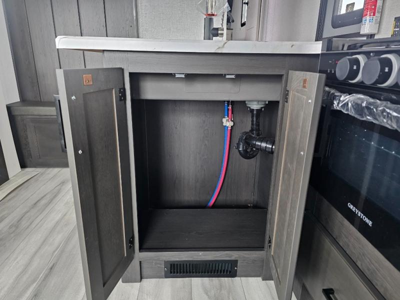Trips to the lake are made complete in this spacious fifth wheel that can sleep five each night. You'll enjoy your own private bedroom up front that includes a queen bed, a wardrobe, plus bedside wardrobes and nightstands for your things. After you've made dinner on the cooktop, you can dine at the booth dinette. There is additional seating on the tri-fold sofa, and both of these areas can double as sleeping space for guests. If you're wanting a little more comfort, just choose the optional theater seating in place of the sofa. A flip-up desk in the back will let you get some work done if needed, and the hidden walk-in pantry behind the TV/fireplace is a huge convenience!