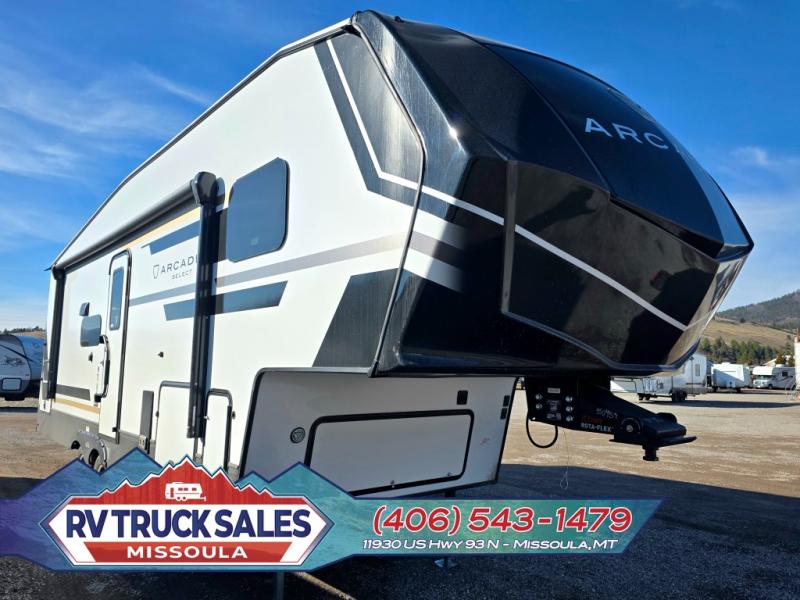 With any Arcadia Select fifth wheel by Keystone you will enjoy easy towability and at-home comforts at an affordable price! The laminated sidewalls with five sided aluminum superstructure will provide a strong foundation so you can enjoy your RV for years to come, plus a one-piece, heated and enclosed polypropylene underbelly means you can camp year around! And an upgraded Roto-Flex hitch pin with will make it easy to tow. Head inside to find tall slides for added space, seamless, pressed countertops, convenient underbed storage, and a large shower with a retractable door and skylight. These fifth wheels also include a Blade Pure A/C system, Girard on-demand tankless water heater, two 30 lb. LP tanks, and more utilities to make your camping experience run smoothly.