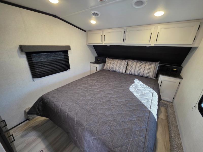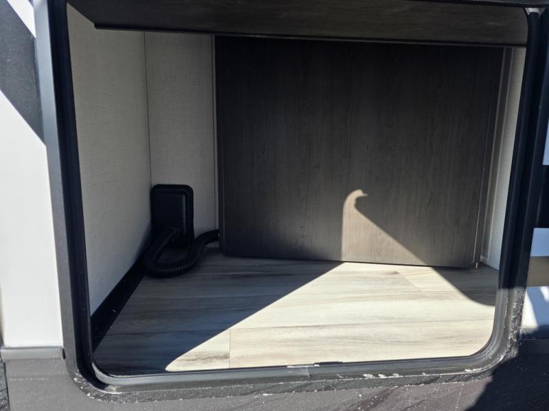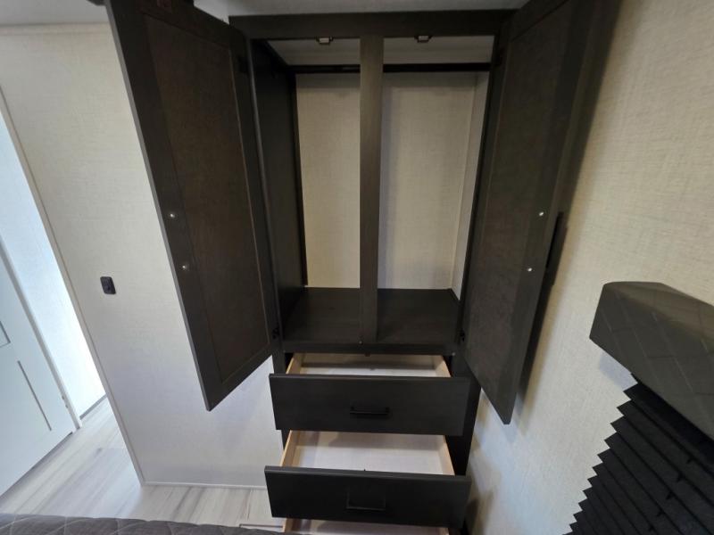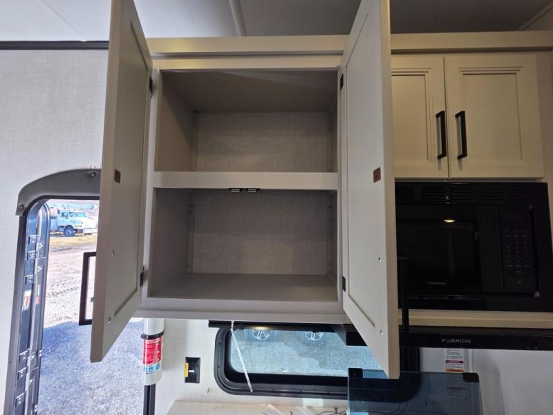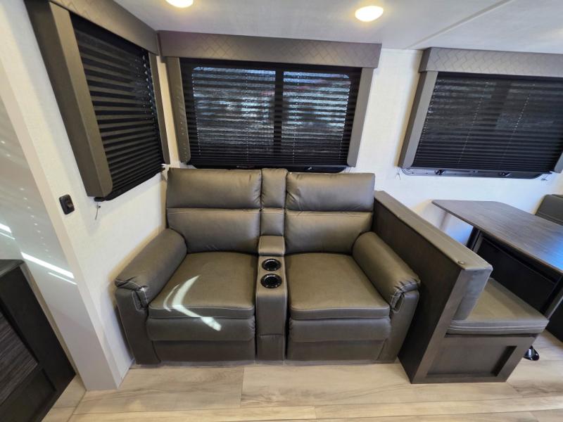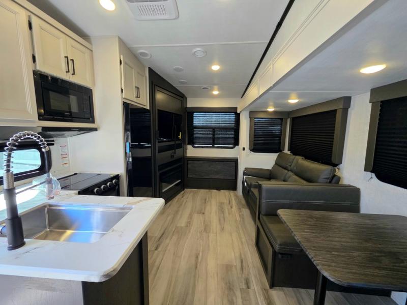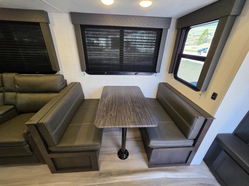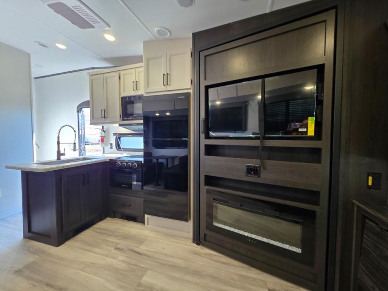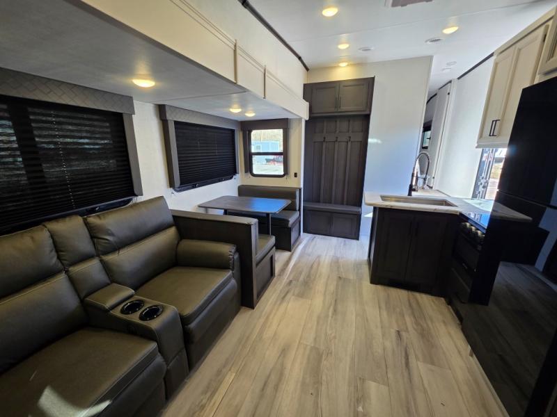 Trips to the lake are made complete in this spacious fifth wheel that can sleep five each night. You'll enjoy your own private bedroom up front that includes a queen bed, a wardrobe, plus bedside wardrobes and nightstands for your things. After you've made dinner on the cooktop, you can dine at the booth dinette. There is additional seating on the tri-fold sofa, and both of these areas can double as sleeping space for guests. If you're wanting a little more comfort, just choose the optional theater seating in place of the sofa. A flip-up desk in the back will let you get some work done if needed, and the hidden walk-in pantry behind the TV/fireplace is a huge convenience!