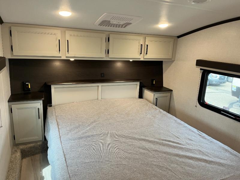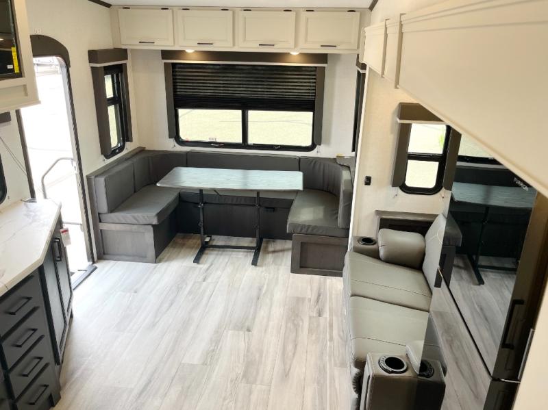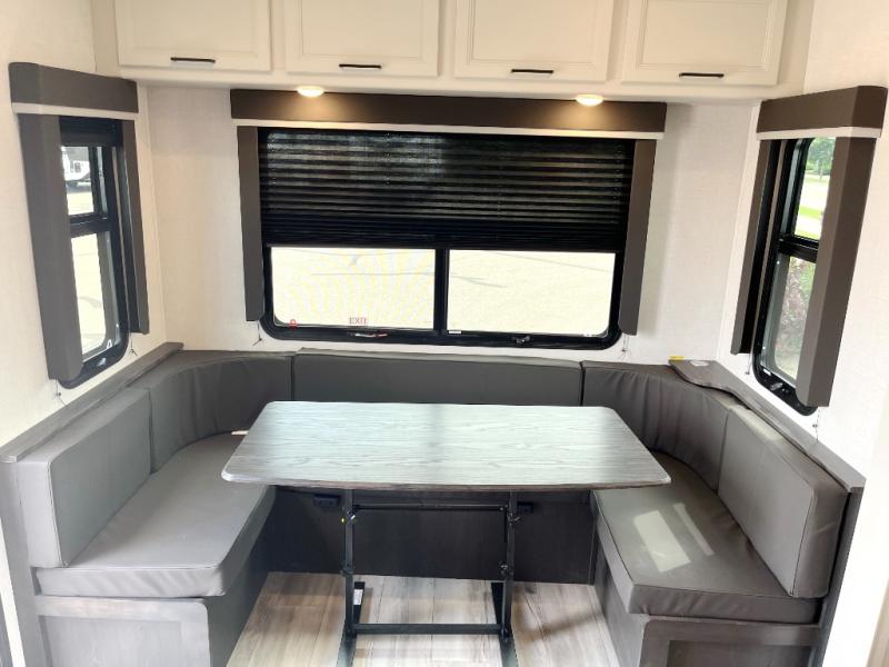 Trips to the lake are made complete in this spacious fifth wheel that can sleep four each night. You'll enjoy your own private bedroom up front that includes a queen bed, a wardrobe, plus bedside wardrobes and nightstands for your things. After you've made dinner on the cooktop, you can dine around the rear U-shaped dinette. There is additional seating on the theater seating, if you're wanting a little more comfort.