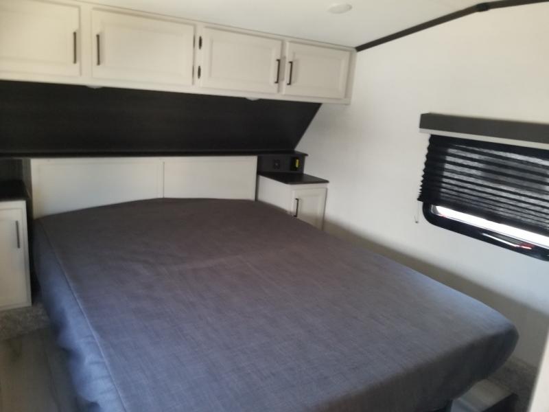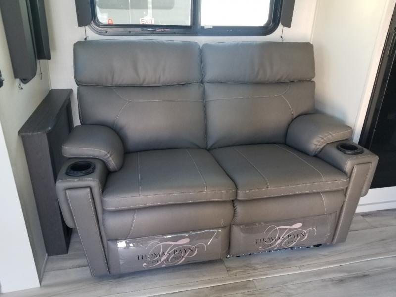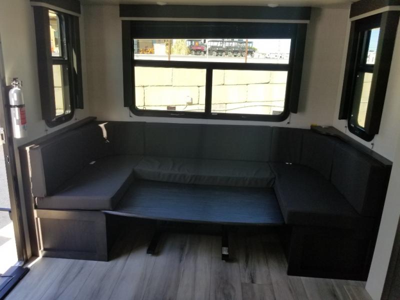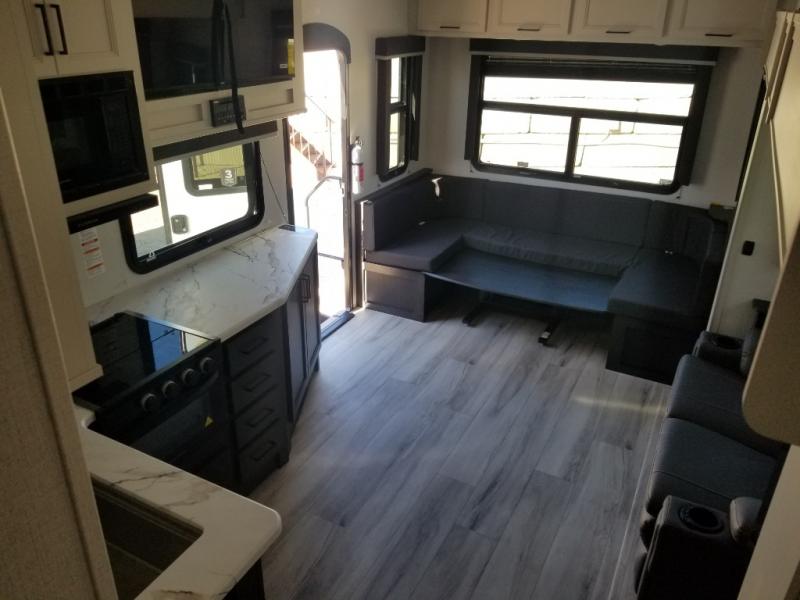 Trips to the lake are made complete in this spacious fifth wheel that can sleep six each night. You'll enjoy your own private bedroom up front that includes a queen bed, a wardrobe, plus bedside wardrobes and nightstands for your things. After you've made dinner on the cooktop, you can dine around the rear U-shaped dinette. There is additional seating on the tri-fold sofa, and both of these areas can double as sleeping space for guests. If you're wanting a little more comfort, just choose the optional theater seating in place of the sofa.