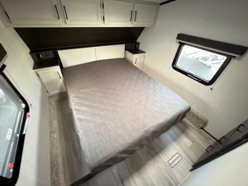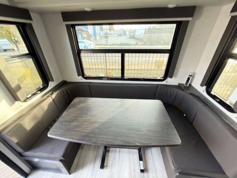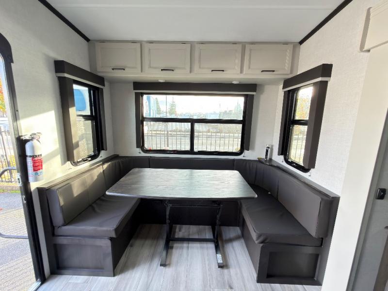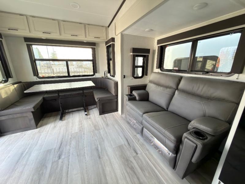 Trips to the lake are made complete in this spacious fifth wheel that can sleep six each night. You'll enjoy your own private bedroom up front that includes a queen bed, a wardrobe, plus bedside wardrobes and nightstands for your things. After you've made dinner on the cooktop, you can dine around the rear U-shaped dinette. There is additional seating on the tri-fold sofa, and both of these areas can double as sleeping space for guests. If you're wanting a little more comfort, just choose the optional theater seating in place of the sofa.