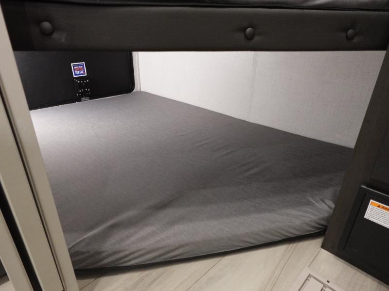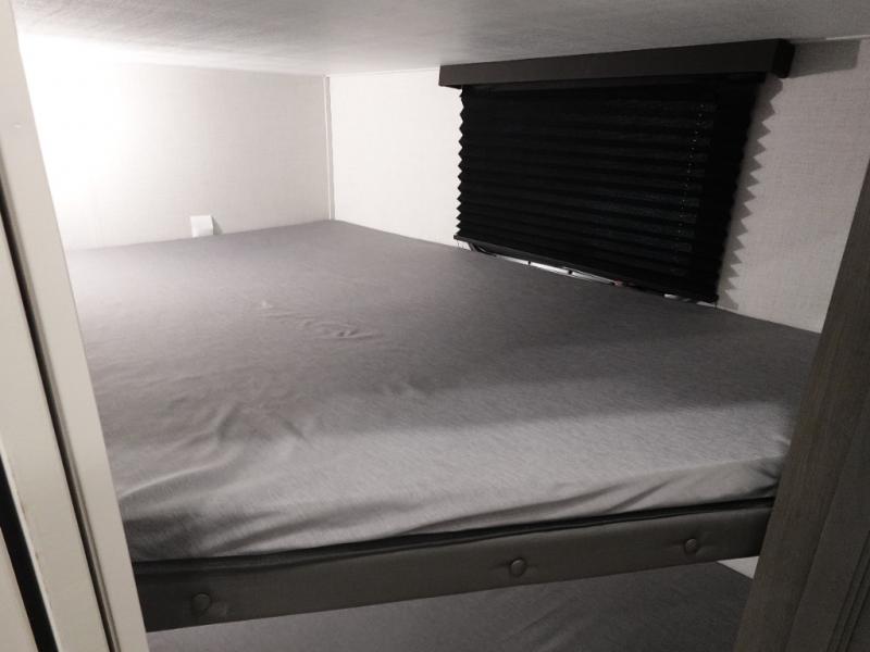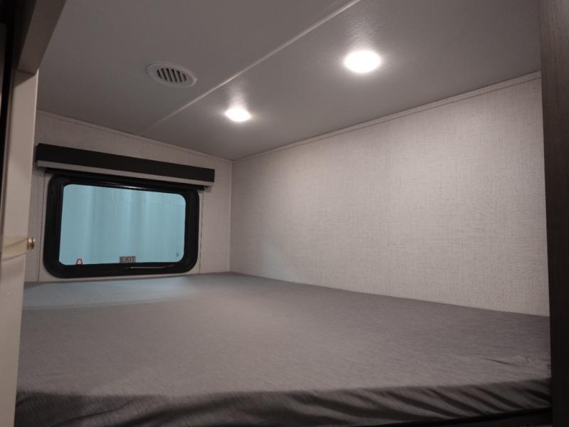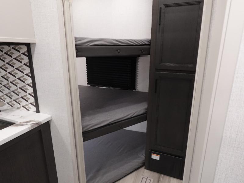 This fifth wheel with an open concept kitchen and living area is sure to feel just like home! You can relax with friends and family around the U-shaped dinette or on the tri-fold sleeper sofa, and there is a TV/radio in this space for entertainment. The rear private bunkhouse includes double-size triple bunks and a wardrobe for your guests' things, and you'll have your own wardrobes up front in the private bedroom. There is also a queen bed here and dual nightstands to keep your phone and glasses close by. And don't overlook the exterior with its 20' electric awning and LCI Solid Steps!