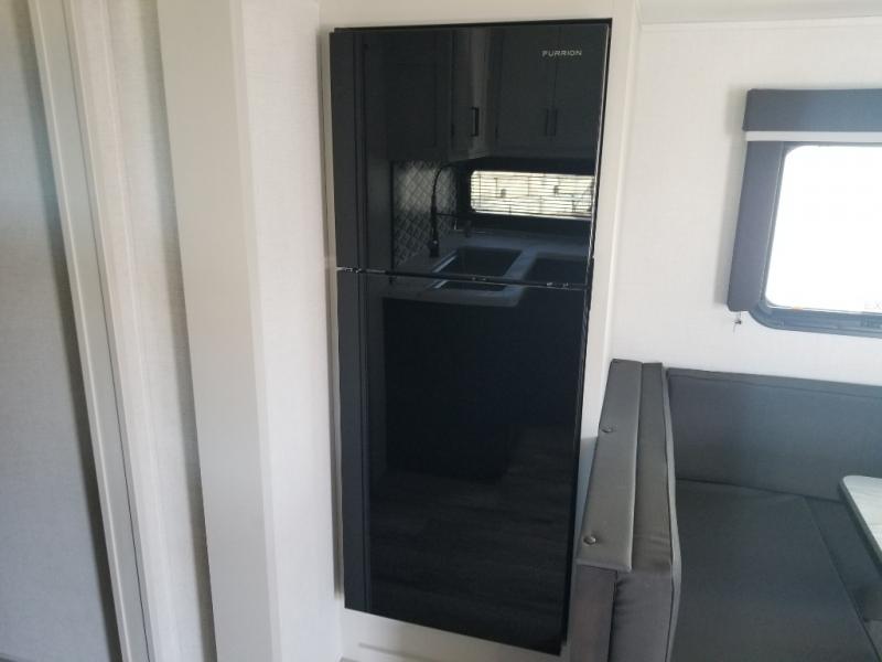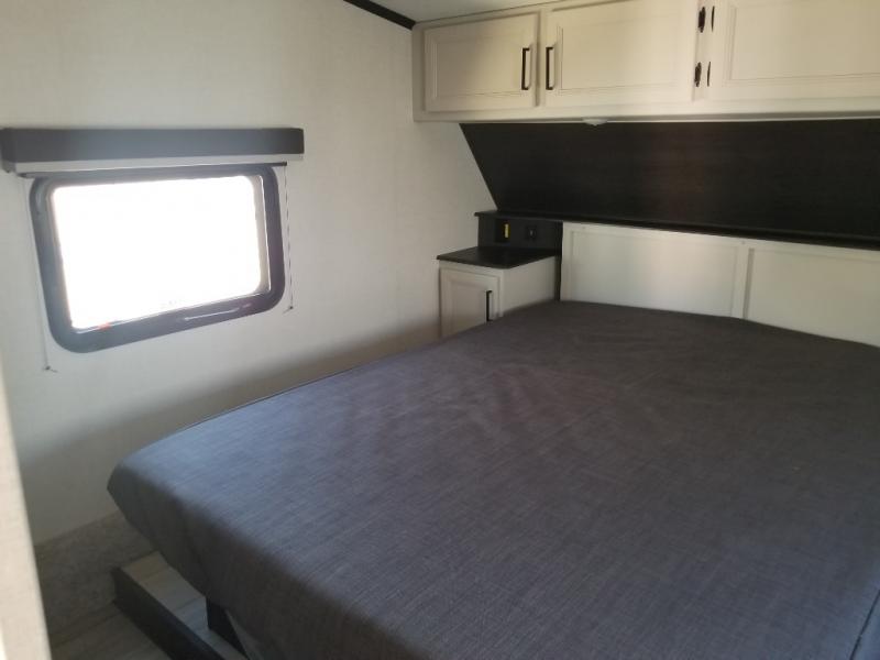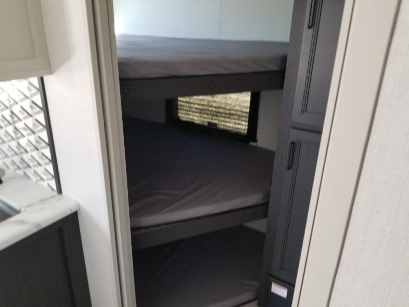 This fifth wheel with an open concept kitchen and living area is sure to feel just like home! You can relax with friends and family around the U-shaped dinette or on the tri-fold sleeper sofa, and there is a TV/radio in this space for entertainment. The rear private bunkhouse includes double-size triple bunks and a wardrobe for your guests' things, and you'll have your own wardrobes up front in the private bedroom. There is also a queen bed here and dual nightstands to keep your phone and glasses close by. And don't overlook the exterior with its 20' electric awning and LCI Solid Steps!