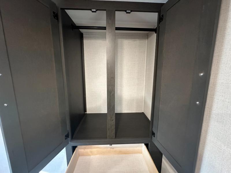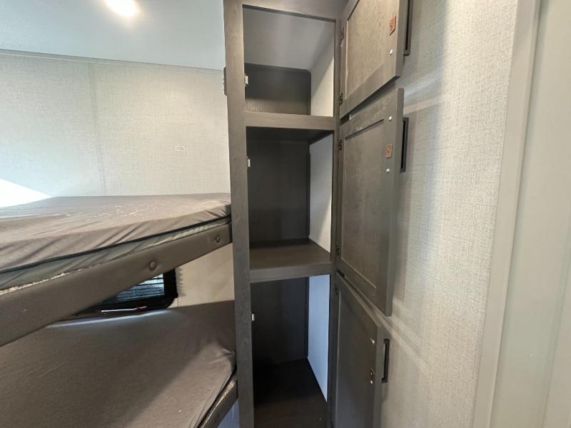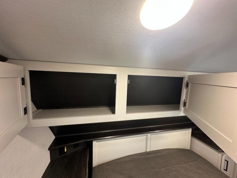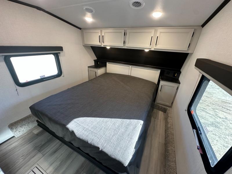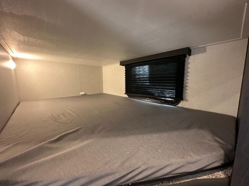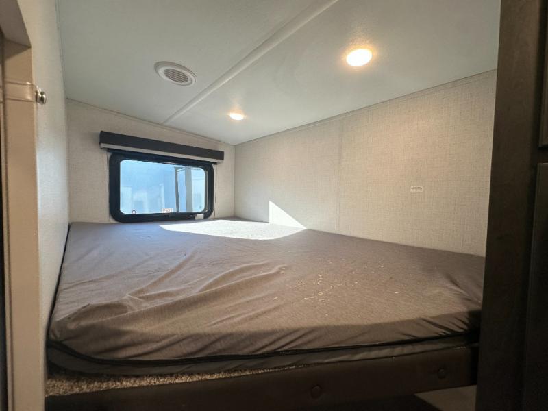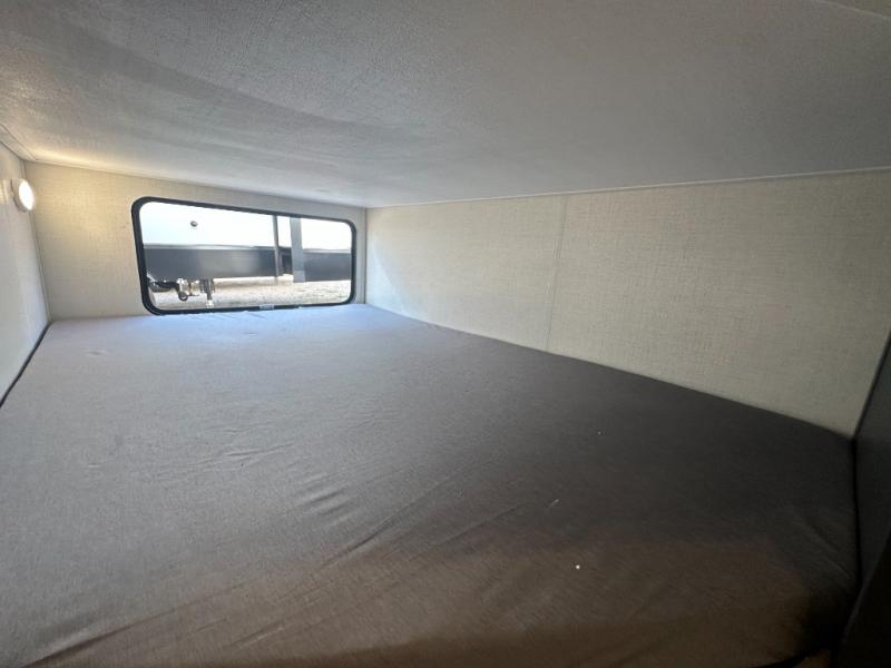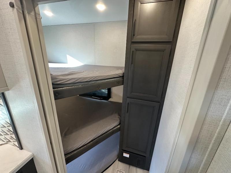 This fifth wheel with an open concept kitchen and living area is sure to feel just like home! You can relax with friends and family around the U-shaped dinette or on the tri-fold sleeper sofa, and there is a TV/radio in this space for entertainment. The rear private bunkhouse includes double-size triple bunks and a wardrobe for your guests' things, and you'll have your own wardrobes up front in the private bedroom. There is also a queen bed here and dual nightstands to keep your phone and glasses close by. And don't overlook the exterior with its 20' electric awning and LCI Solid Steps!