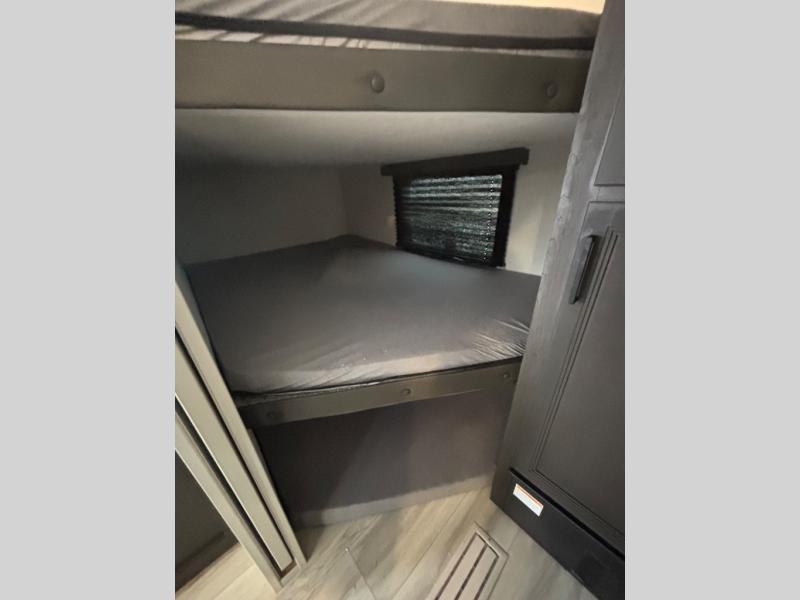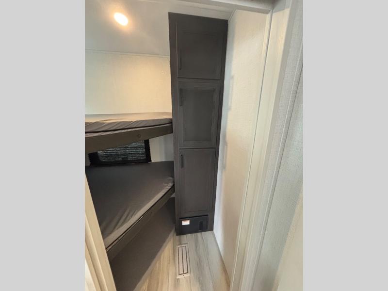 This fifth wheel with an open concept kitchen and living area is sure to feel just like home! You can relax with friends and family around the U-shaped dinette or on the tri-fold sleeper sofa, and there is a TV/radio in this space for entertainment. The rear private bunkhouse includes double-size triple bunks and a wardrobe for your guests' things, and you'll have your own wardrobes up front in the private bedroom. There is also a queen bed here and dual nightstands to keep your phone and glasses close by. And don't overlook the exterior with its 20' electric awning and LCI Solid Steps!