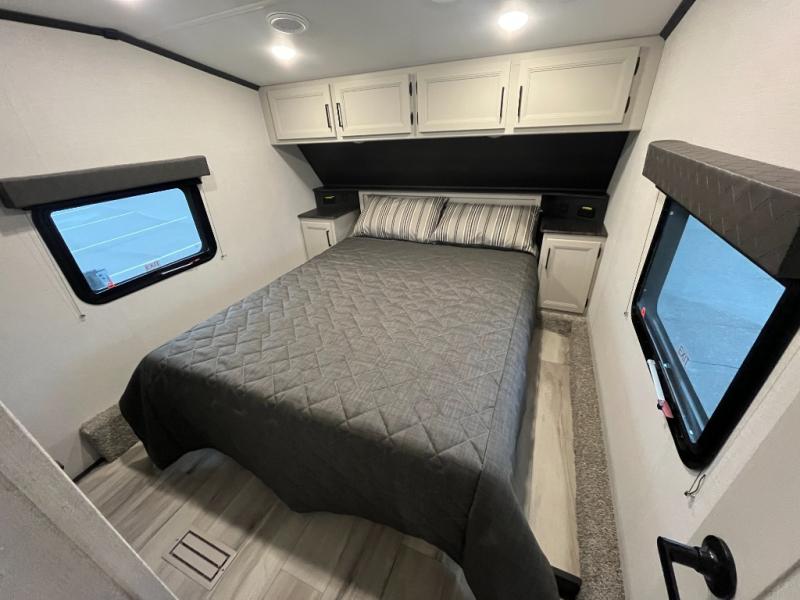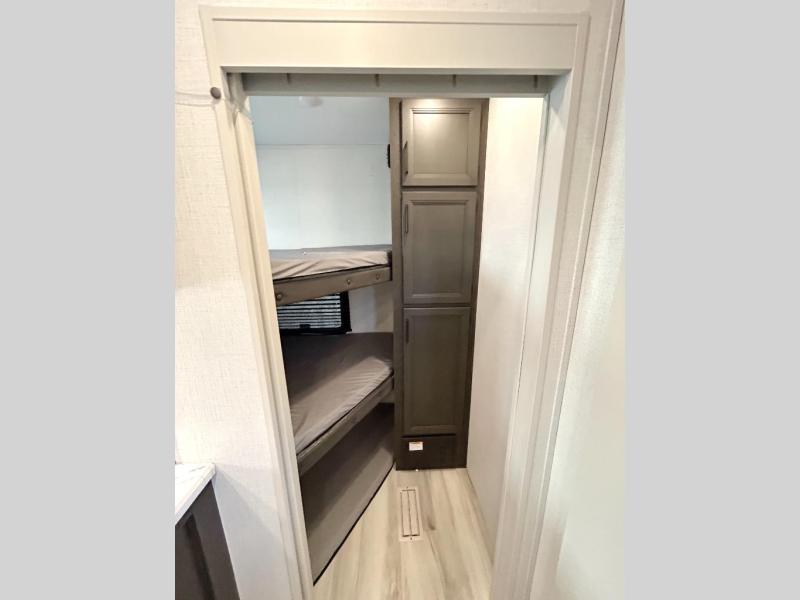 This fifth wheel with an open concept kitchen and living area is sure to feel just like home! You can relax with friends and family around the U-shaped dinette or on the tri-fold sleeper sofa, and there is a TV/radio in this space for entertainment. The rear private bunkhouse includes double-size triple bunks and a wardrobe for your guests' things, and you'll have your own wardrobes up front in the private bedroom. There is also a queen bed here and dual nightstands to keep your phone and glasses close by. And don't overlook the exterior with its 20' electric awning and LCI Solid Steps!