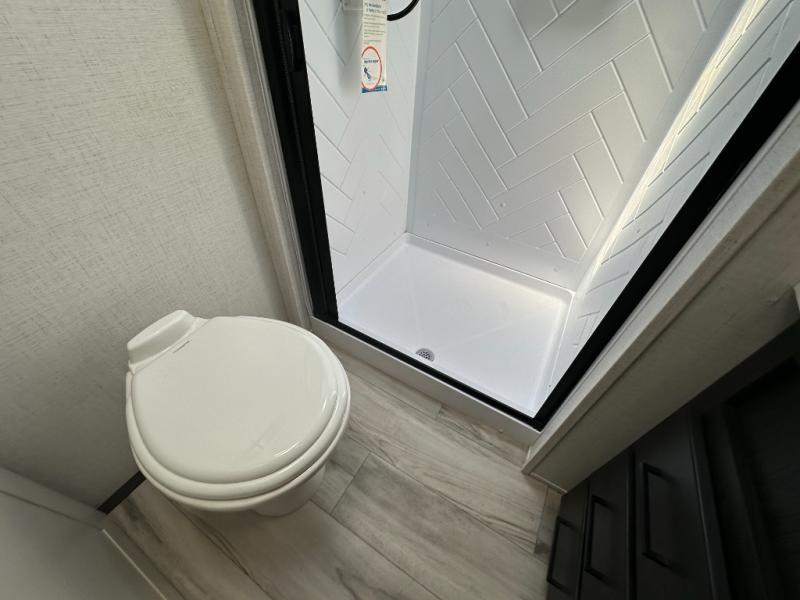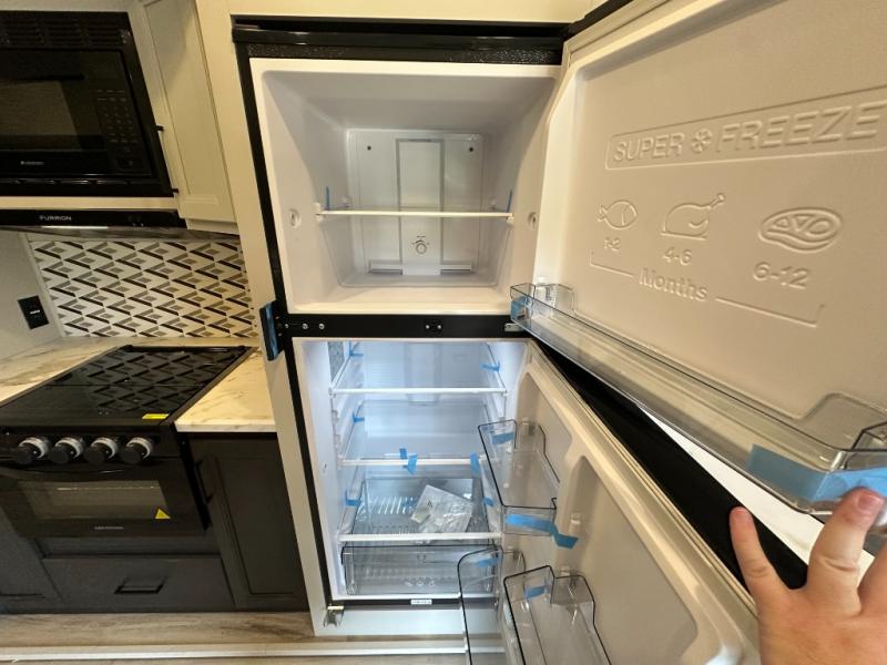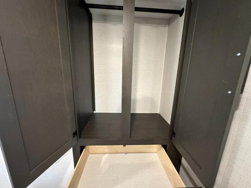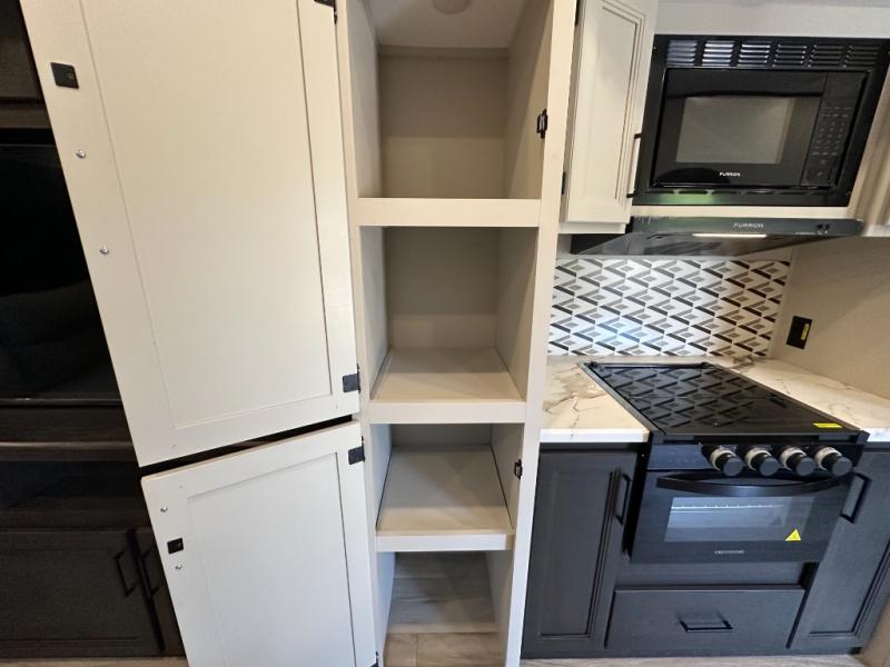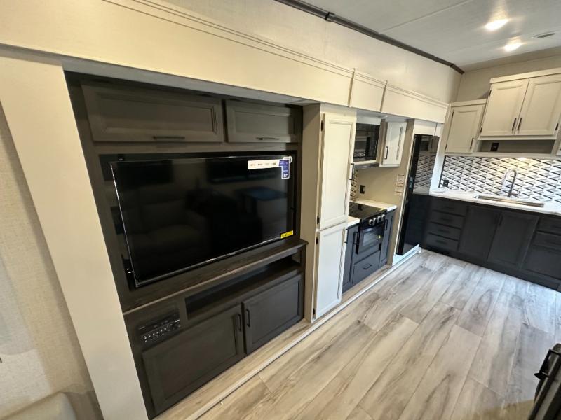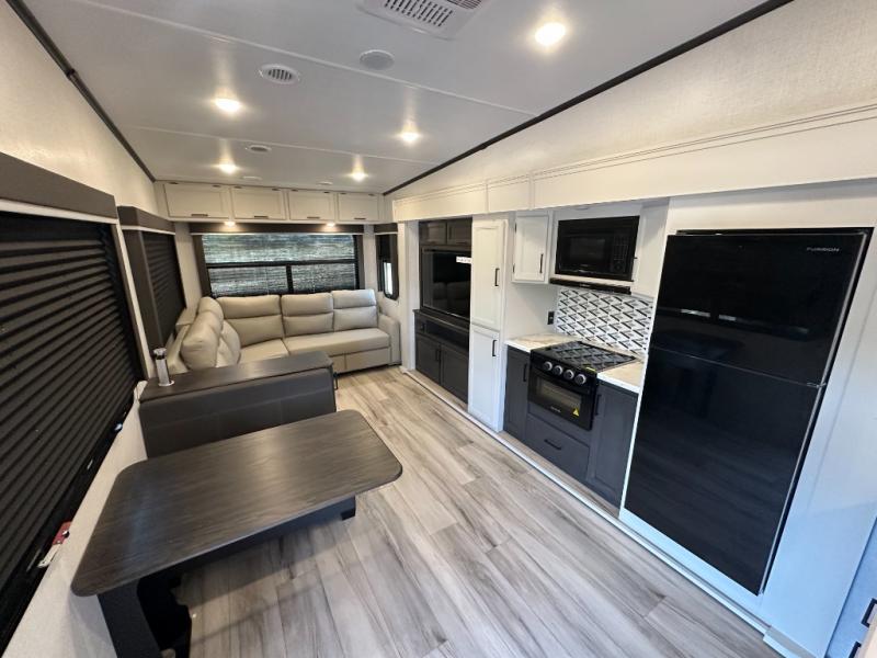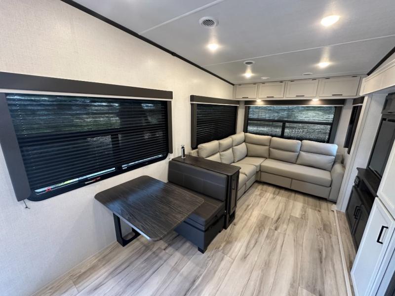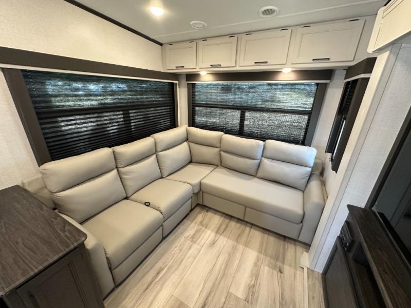 This fifth wheel will be the best RV vehicle for you and your family. Built to offer the ultimate comfort, this fifth wheel has a spacious living area that boasts a tri-fold sofa and sofa with recliners, perfect to rest while enjoying your tour favorites shows in the fabulous entertainment center. You can cook like a Michelin star chef in the incredible kitchen, fitted with a convection microwave, refrigerator, and three-burner range. Also, the overhead cabinets and pantry will allow you to keep all your food and spices organized on the go, and when your meal is done, you can enjoy it in the comfortable dinette. Convenience is our top priority; that is why the full bathroom is equipped with everything needed to take a nice shower. Finally, retreat to the comfortable queen bed, ideal for a deserved good night's rest.