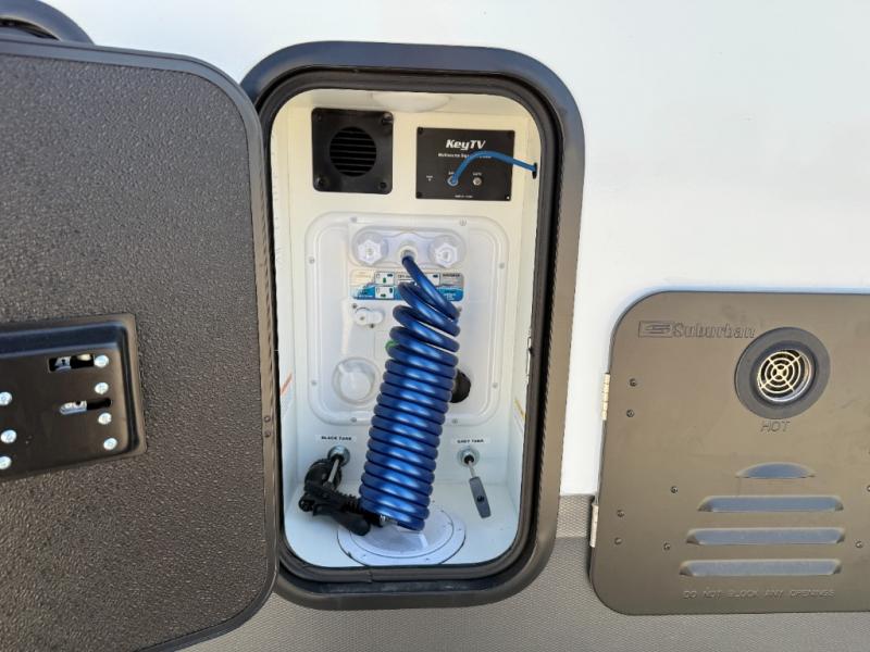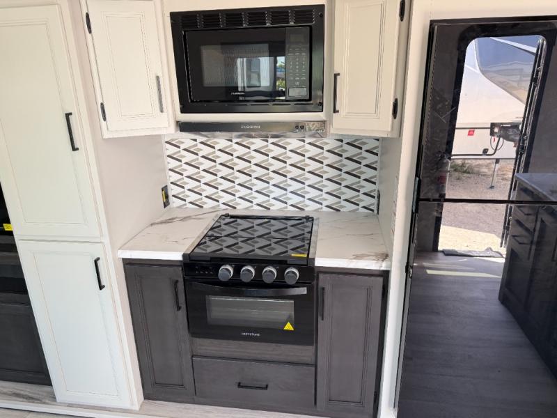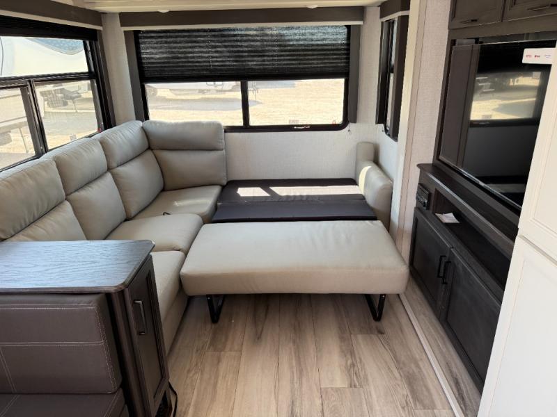 This fifth wheel will be the best RV vehicle for you and your family. Built to offer the ultimate comfort, this fifth wheel has a spacious living area that boasts a tri-fold sofa and sofa with recliners, perfect to rest while enjoying your tour favorites shows in the fabulous entertainment center. You can cook like a Michelin star chef in the incredible kitchen, fitted with a convection microwave, refrigerator, and three-burner range. Also, the overhead cabinets and pantry will allow you to keep all your food and spices organized on the go, and when your meal is done, you can enjoy it in the comfortable dinette. Convenience is our top priority; that is why the full bathroom is equipped with everything needed to take a nice shower. Finally, retreat to the comfortable queen bed, ideal for a deserved good night's rest.