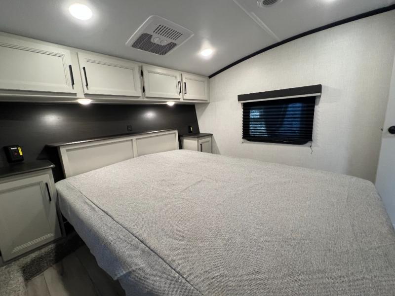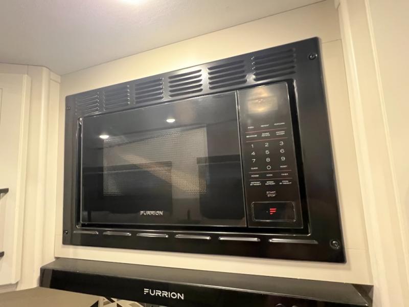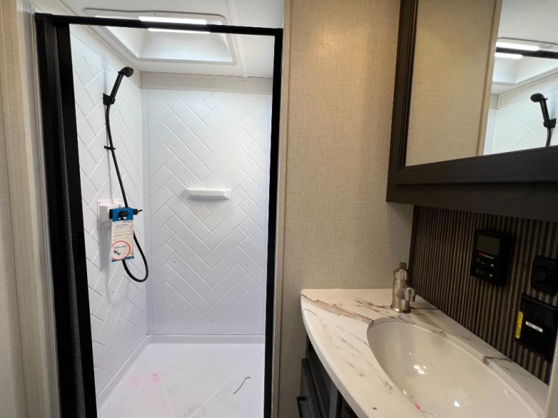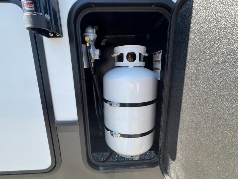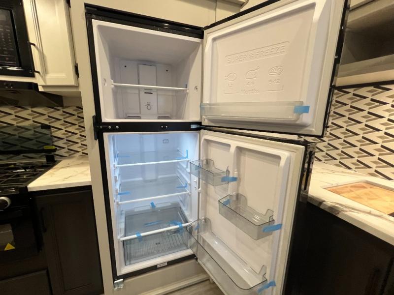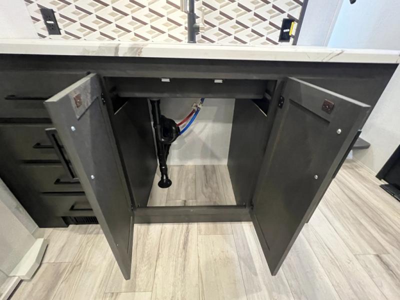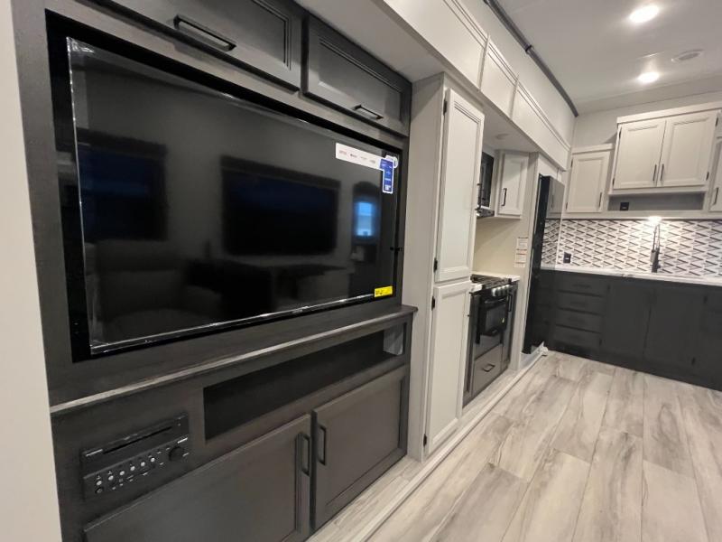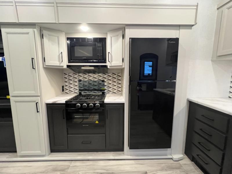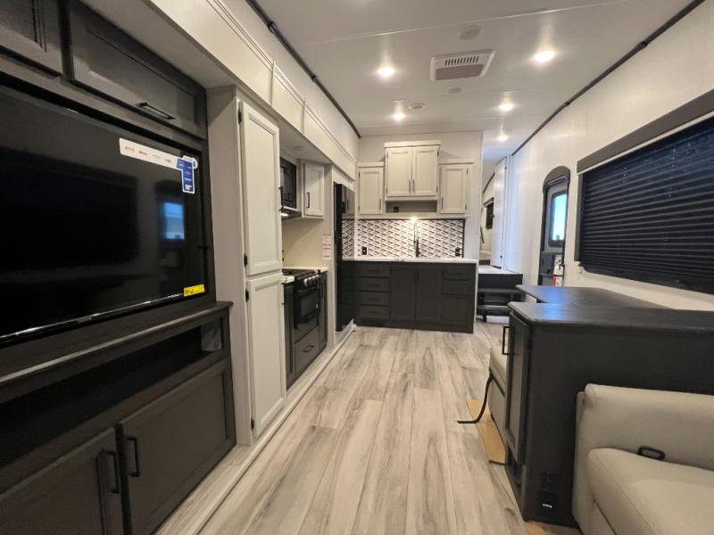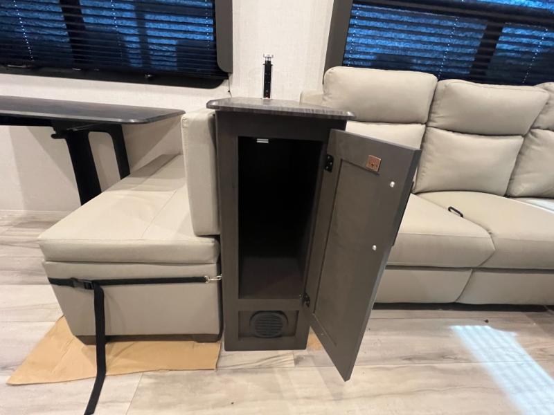 This fifth wheel will be the best RV vehicle for you and your family. Built to offer the ultimate comfort, this fifth wheel has a spacious living area that boasts a tri-fold sofa and sofa with recliners, perfect to rest while enjoying your tour favorites shows in the fabulous entertainment center. You can cook like a Michelin star chef in the incredible kitchen, fitted with a convection microwave, refrigerator, and three-burner range. Also, the overhead cabinets and pantry will allow you to keep all your food and spices organized on the go, and when your meal is done, you can enjoy it in the comfortable dinette. Convenience is our top priority; that is why the full bathroom is equipped with everything needed to take a nice shower. Finally, retreat to the comfortable queen bed, ideal for a deserved good night's rest.