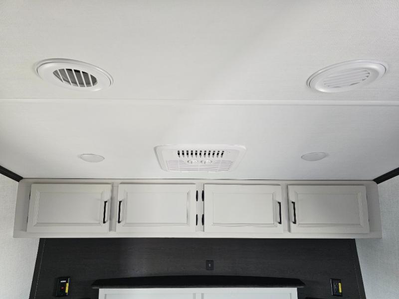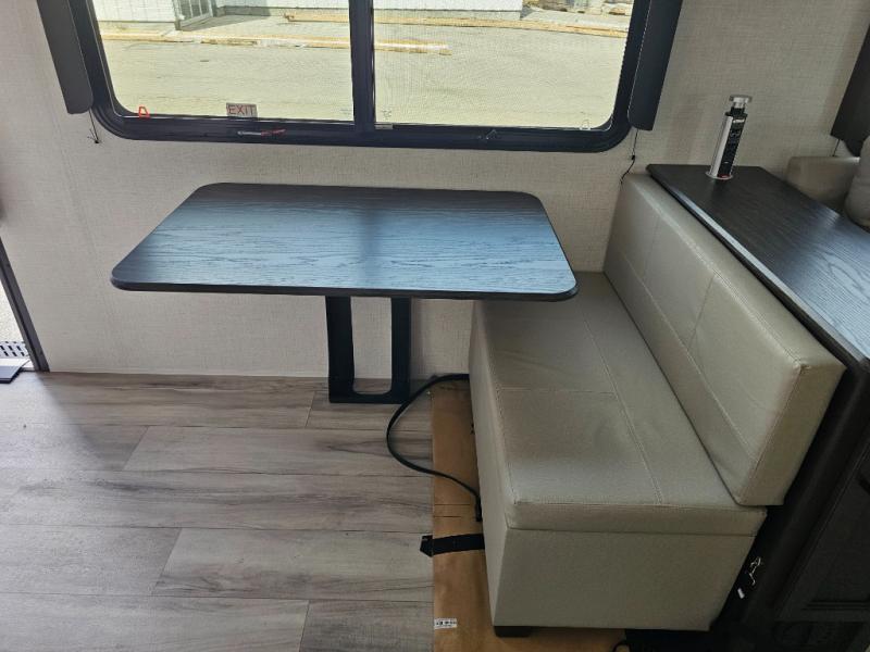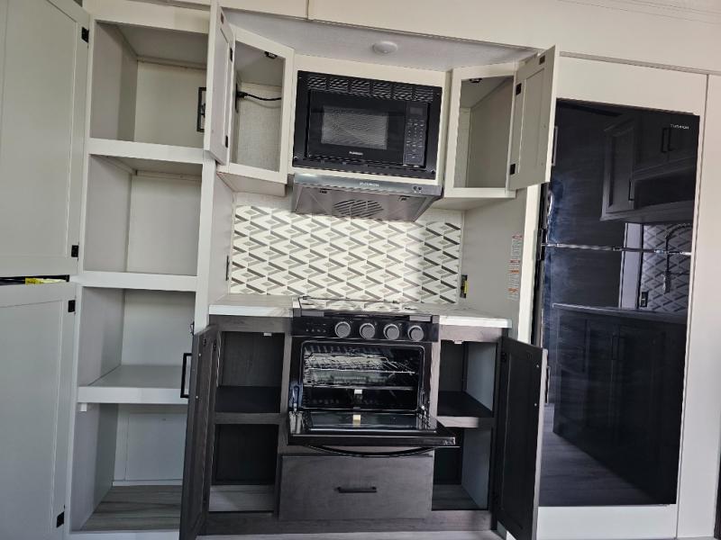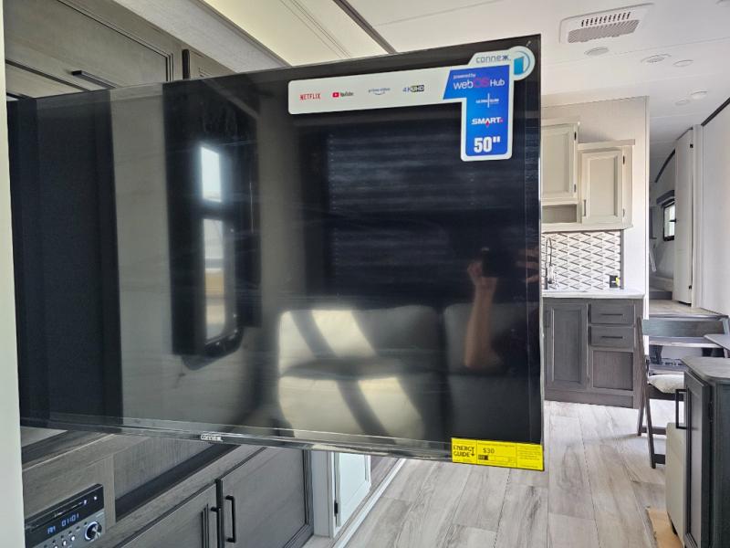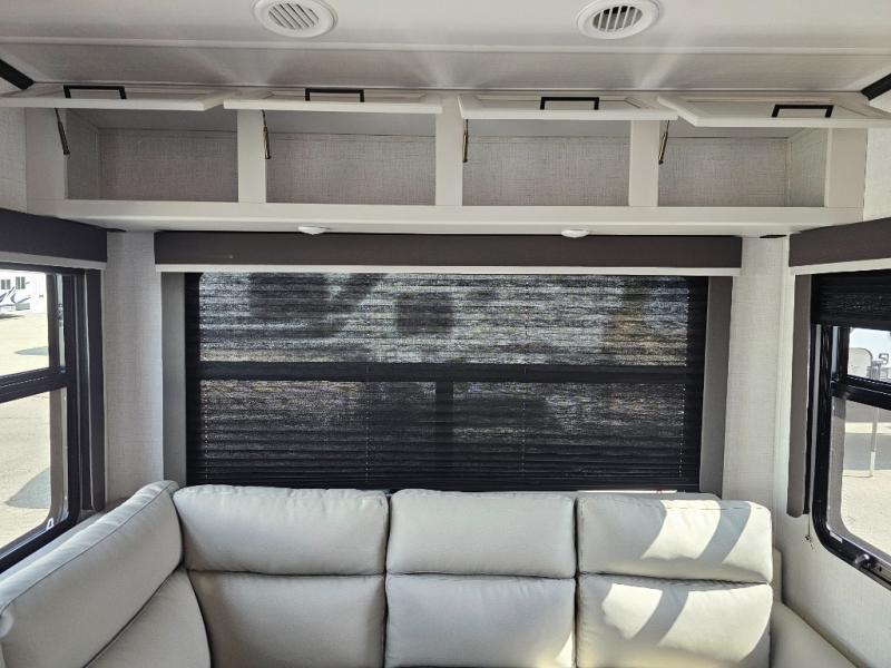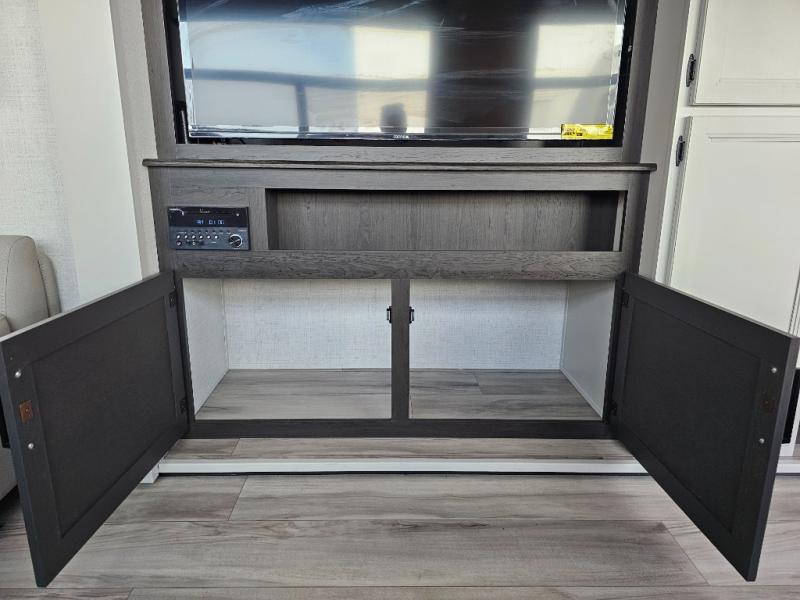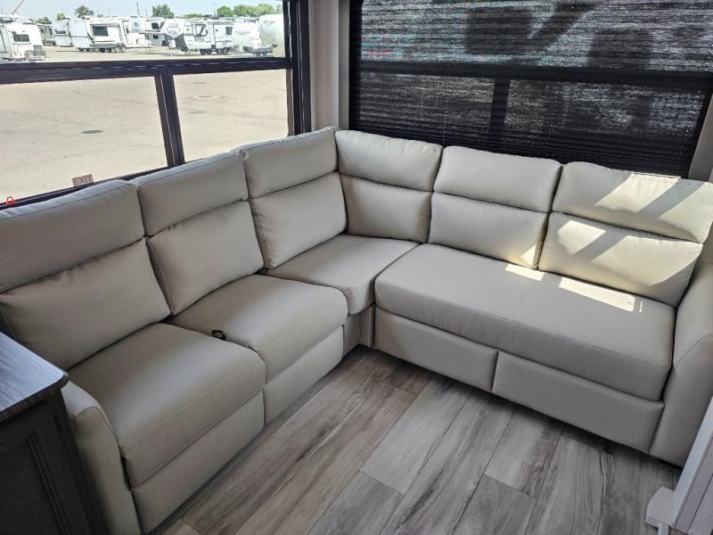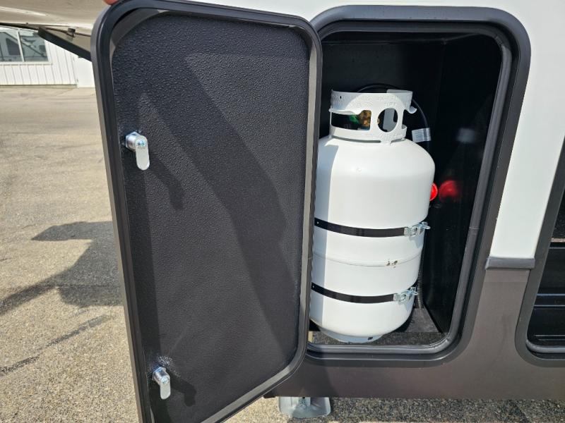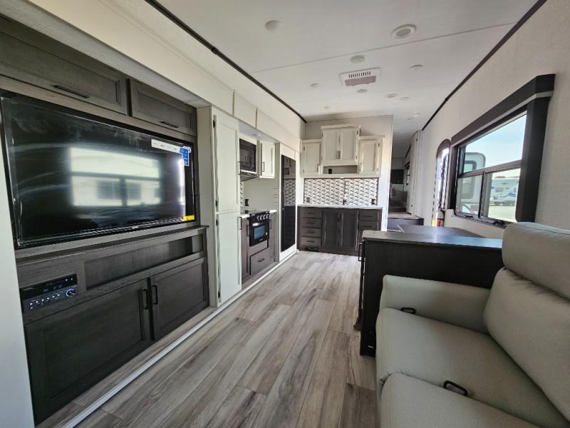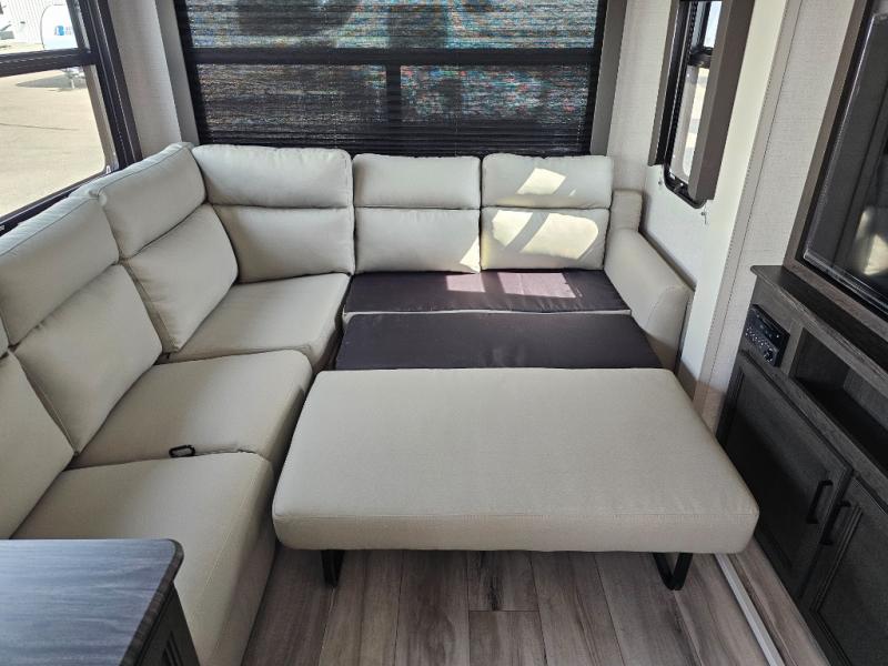 This fifth wheel will be the best RV vehicle for you and your family. Built to offer the ultimate comfort, this fifth wheel has a spacious living area that boasts a tri-fold sofa and sofa with recliners, perfect to rest while enjoying your tour favorites shows in the fabulous entertainment center. You can cook like a Michelin star chef in the incredible kitchen, fitted with a convection microwave, refrigerator, and three-burner range. Also, the overhead cabinets and pantry will allow you to keep all your food and spices organized on the go, and when your meal is done, you can enjoy it in the comfortable dinette. Convenience is our top priority; that is why the full bathroom is equipped with everything needed to take a nice shower. Finally, retreat to the comfortable queen bed, ideal for a deserved good night's rest.
