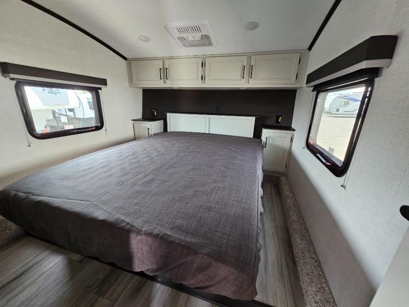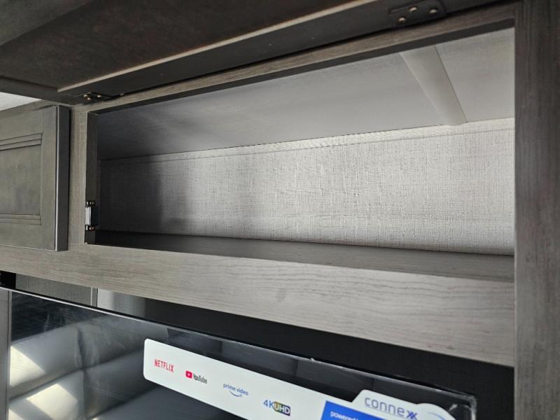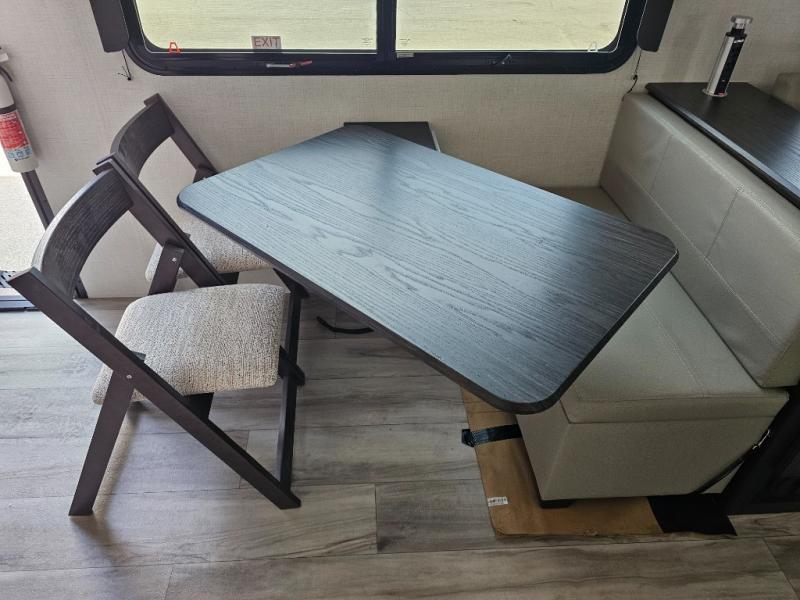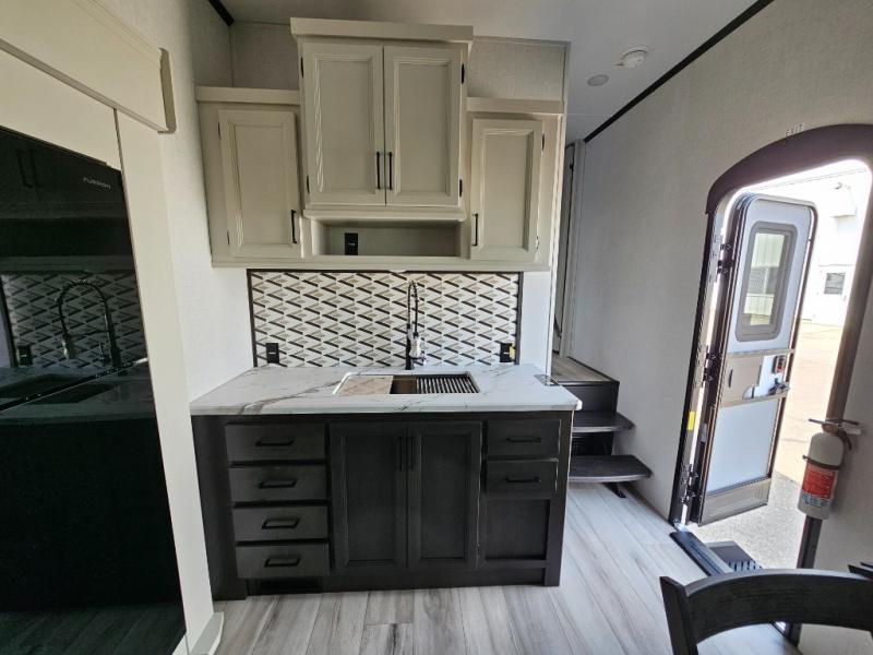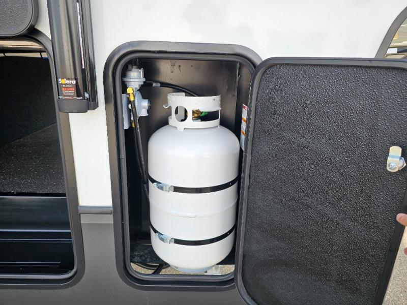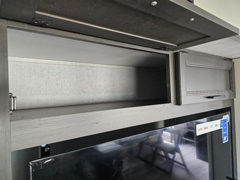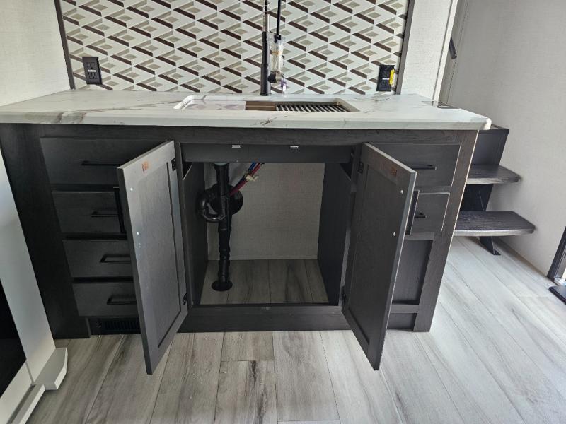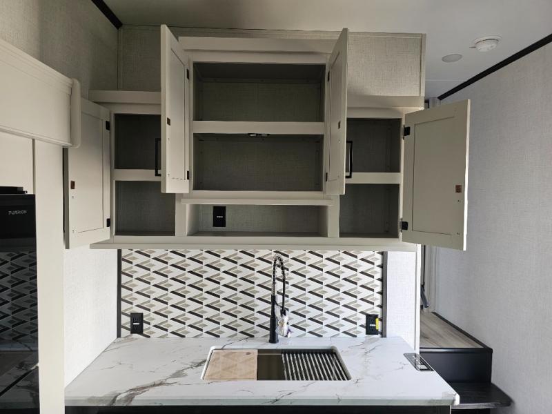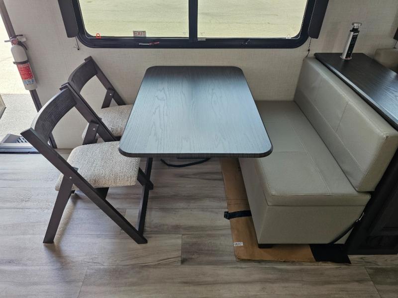 This fifth wheel will be the best RV vehicle for you and your family. Built to offer the ultimate comfort, this fifth wheel has a spacious living area that boasts a tri-fold sofa and sofa with recliners, perfect to rest while enjoying your tour favorites shows in the fabulous entertainment center. You can cook like a Michelin star chef in the incredible kitchen, fitted with a convection microwave, refrigerator, and three-burner range. Also, the overhead cabinets and pantry will allow you to keep all your food and spices organized on the go, and when your meal is done, you can enjoy it in the comfortable dinette. Convenience is our top priority; that is why the full bathroom is equipped with everything needed to take a nice shower. Finally, retreat to the comfortable queen bed, ideal for a deserved good night's rest.