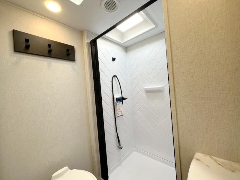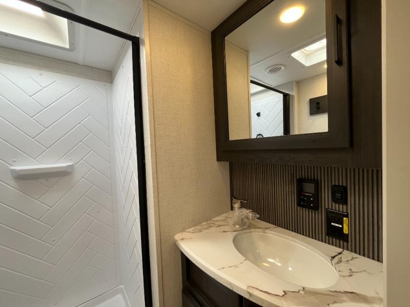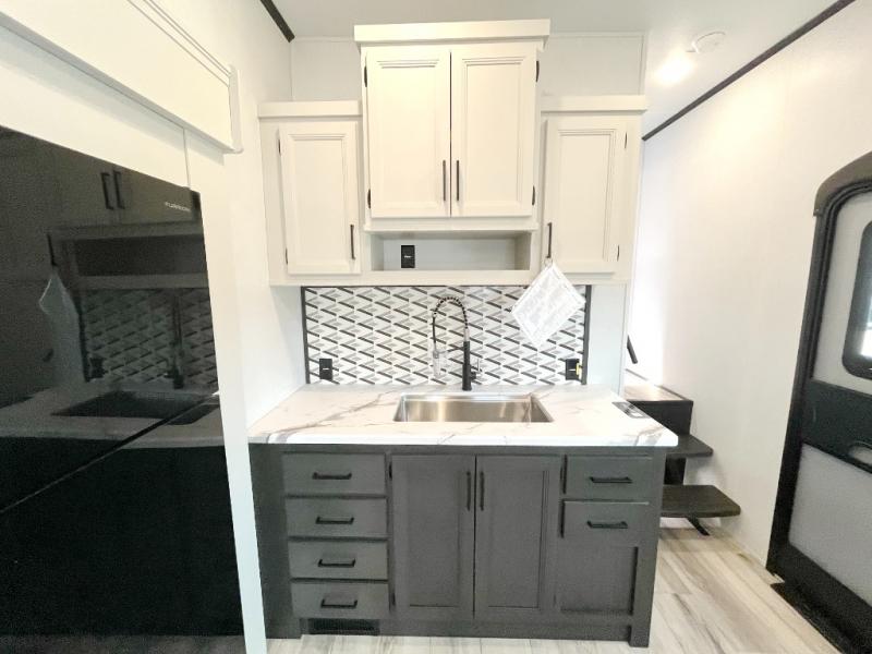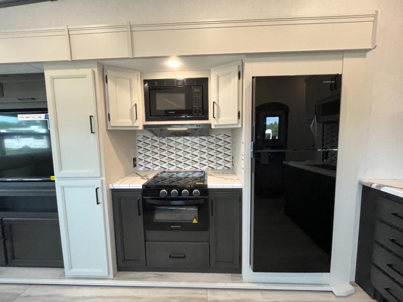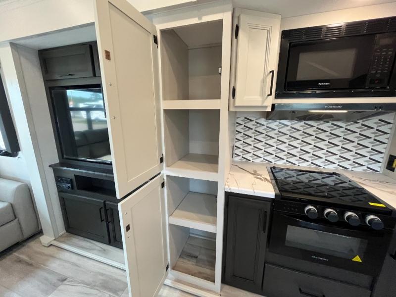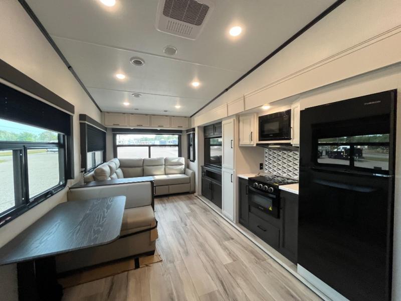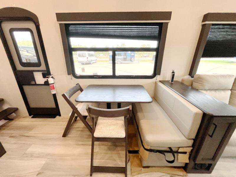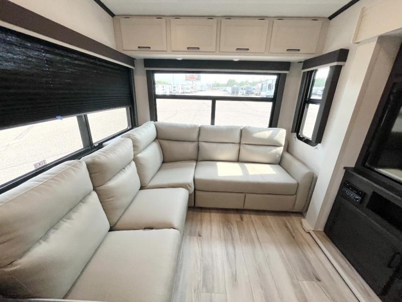 This fifth wheel will be the best RV vehicle for you and your family. Built to offer the ultimate comfort, this fifth wheel has a spacious living area that boasts a tri-fold sofa and sofa with recliners, perfect to rest while enjoying your tour favorites shows in the fabulous entertainment center. You can cook like a Michelin star chef in the incredible kitchen, fitted with a convection microwave, refrigerator, and three-burner range. Also, the overhead cabinets and pantry will allow you to keep all your food and spices organized on the go, and when your meal is done, you can enjoy it in the comfortable dinette. Convenience is our top priority; that is why the full bathroom is equipped with everything needed to take a nice shower. Finally, retreat to the comfortable queen bed, ideal for a deserved good night's rest.