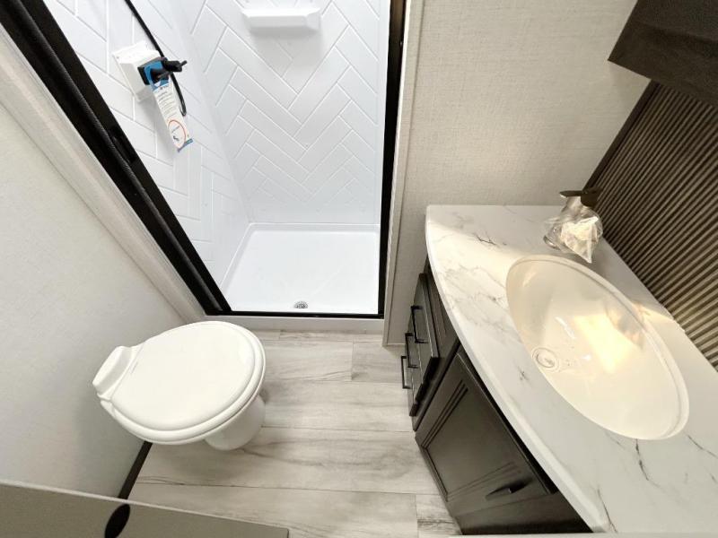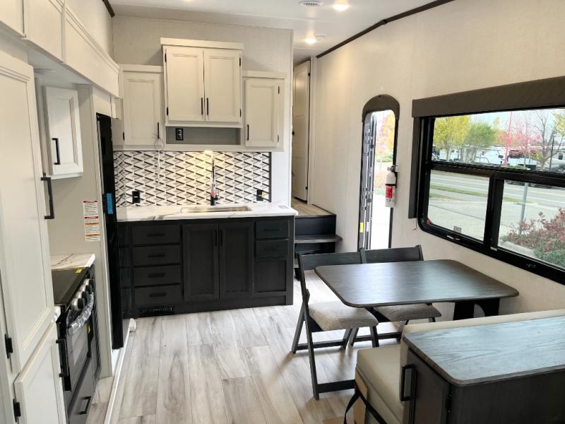 This fifth wheel will be the best RV vehicle for you and your family. Built to offer the ultimate comfort, this fifth wheel has a spacious living area that boasts a tri-fold sofa and sofa with recliners, perfect to rest while enjoying your tour favorites shows in the fabulous entertainment center. You can cook like a Michelin star chef in the incredible kitchen, fitted with a convection microwave, refrigerator, and three-burner range. Also, the overhead cabinets and pantry will allow you to keep all your food and spices organized on the go, and when your meal is done, you can enjoy it in the comfortable dinette. Convenience is our top priority; that is why the full bathroom is equipped with everything needed to take a nice shower. Finally, retreat to the comfortable queen bed, ideal for a deserved good night's rest.