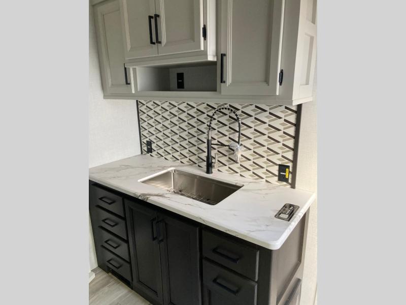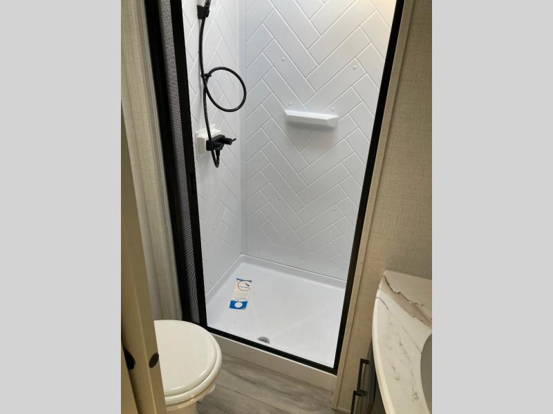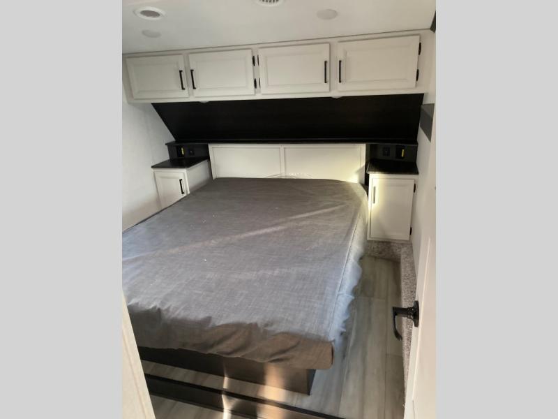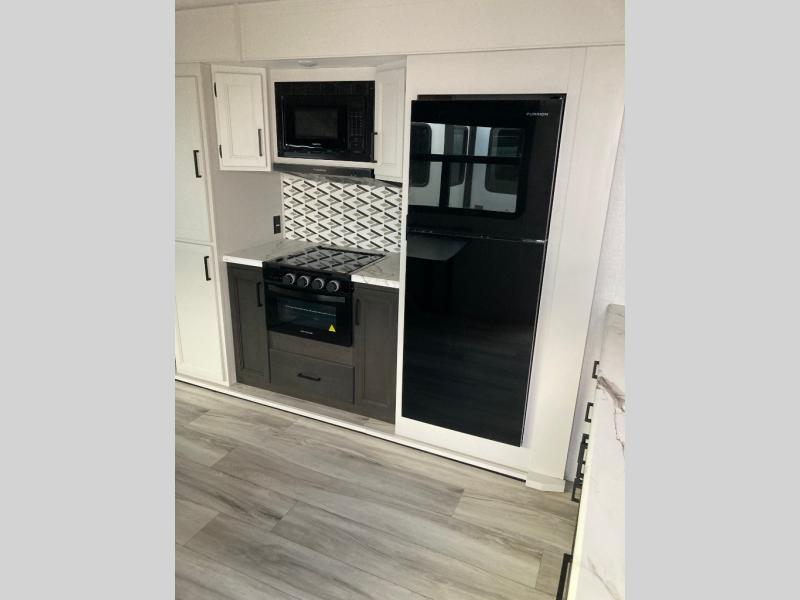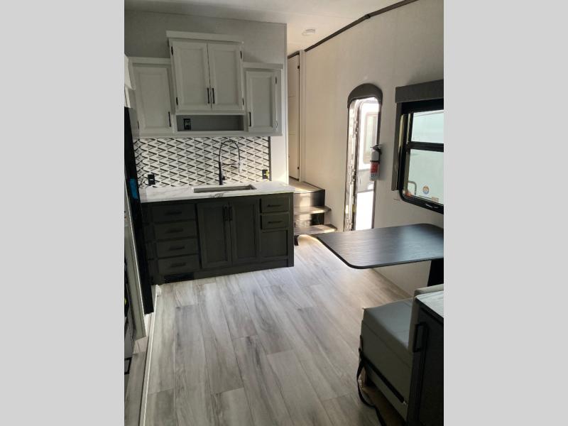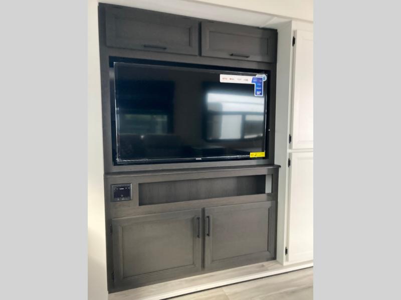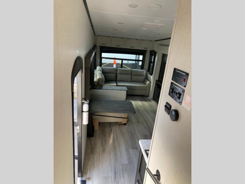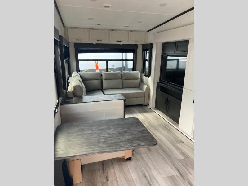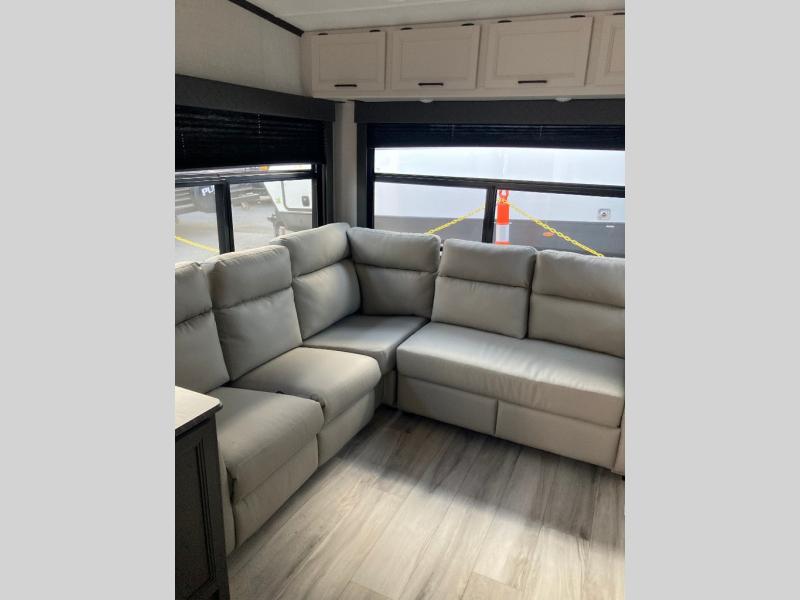 This fifth wheel will be the best RV vehicle for you and your family. Built to offer the ultimate comfort, this fifth wheel has a spacious living area that boasts a tri-fold sofa and sofa with recliners, perfect to rest while enjoying your tour favorites shows in the fabulous entertainment center. You can cook like a Michelin star chef in the incredible kitchen, fitted with a convection microwave, refrigerator, and three-burner range. Also, the overhead cabinets and pantry will allow you to keep all your food and spices organized on the go, and when your meal is done, you can enjoy it in the comfortable dinette. Convenience is our top priority; that is why the full bathroom is equipped with everything needed to take a nice shower. Finally, retreat to the comfortable queen bed, ideal for a deserved good night's rest.