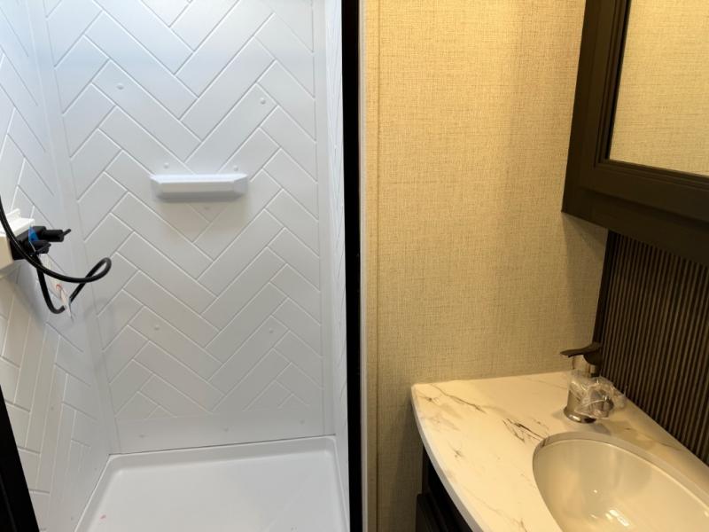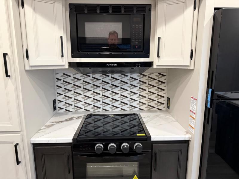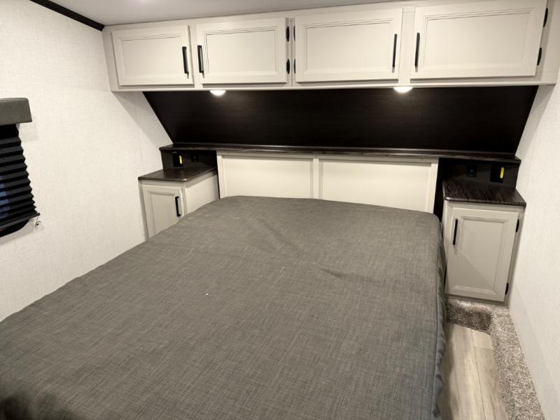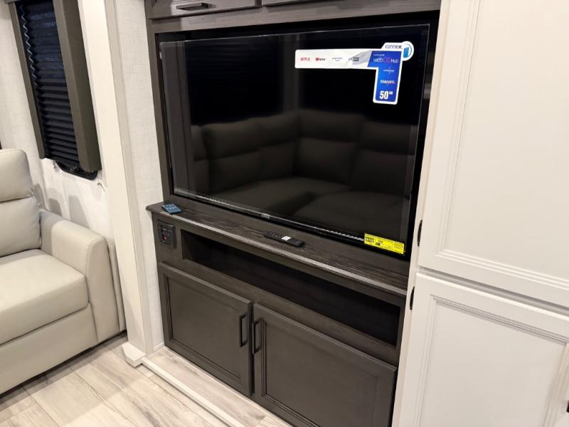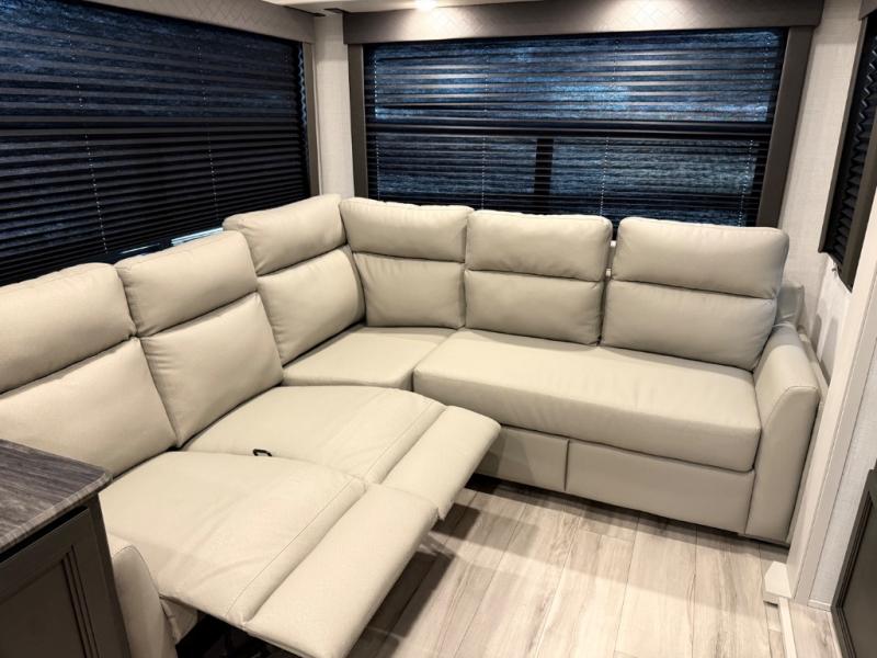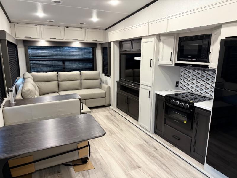 This fifth wheel will be the best RV vehicle for you and your family. Built to offer the ultimate comfort, this fifth wheel has a spacious living area that boasts a tri-fold sofa and sofa with recliners, perfect to rest while enjoying your tour favorites shows in the fabulous entertainment center. You can cook like a Michelin star chef in the incredible kitchen, fitted with a convection microwave, refrigerator, and three-burner range. Also, the overhead cabinets and pantry will allow you to keep all your food and spices organized on the go, and when your meal is done, you can enjoy it in the comfortable dinette. Convenience is our top priority; that is why the full bathroom is equipped with everything needed to take a nice shower. Finally, retreat to the comfortable queen bed, ideal for a deserved good night's rest.