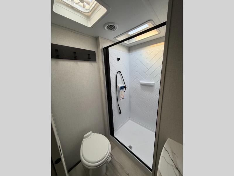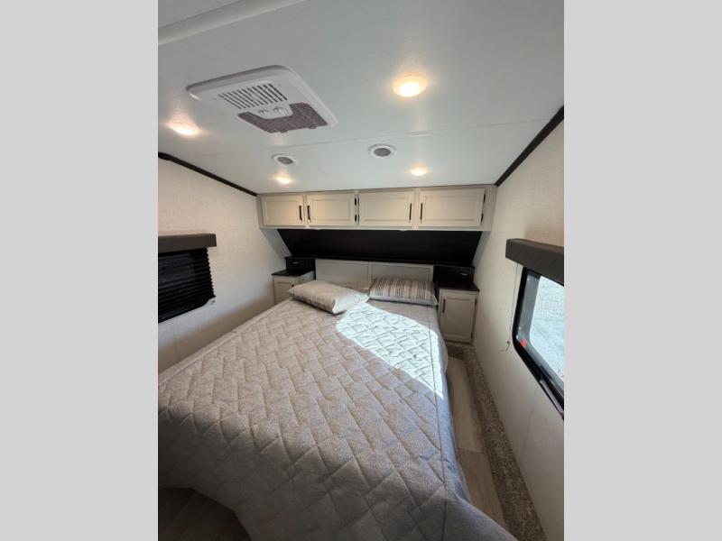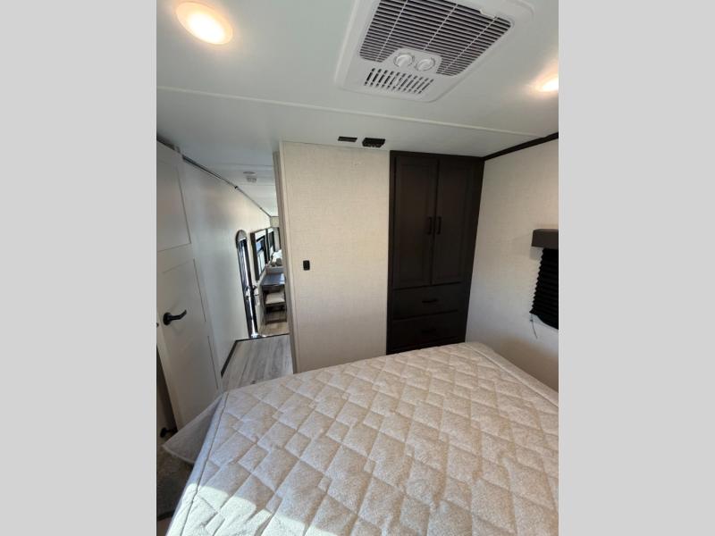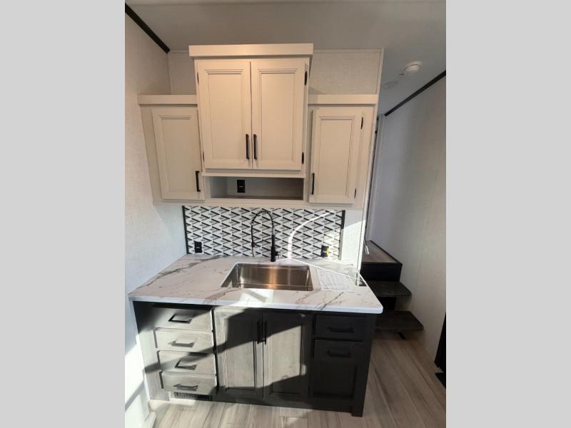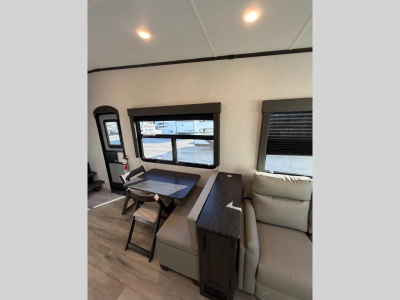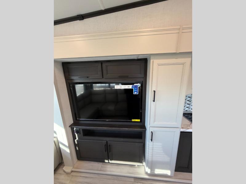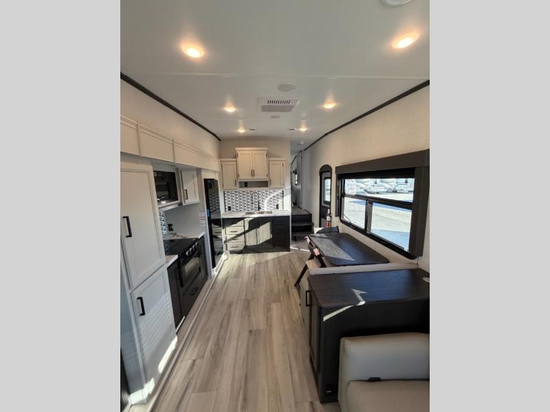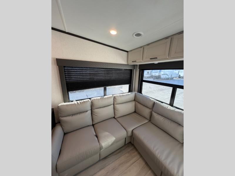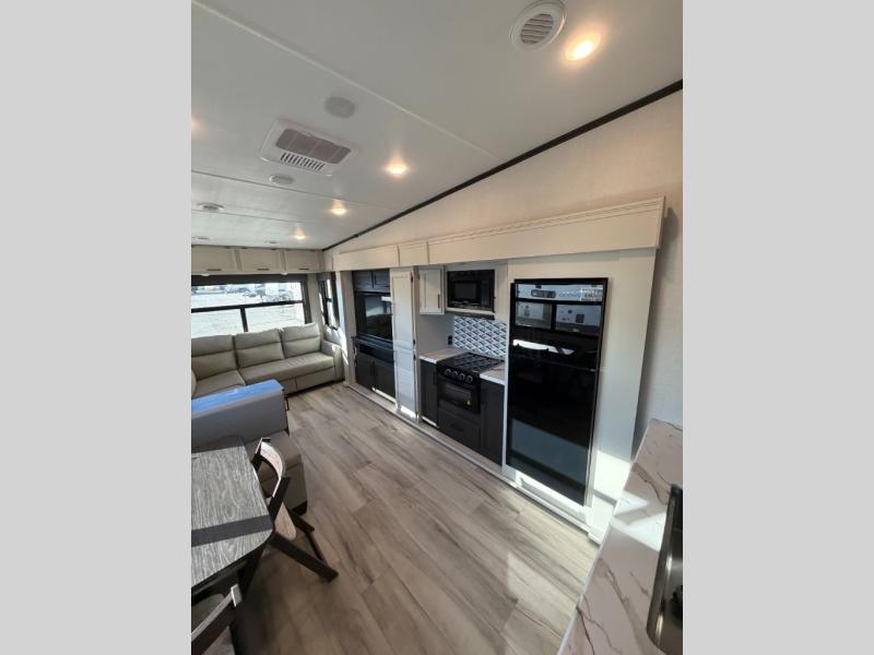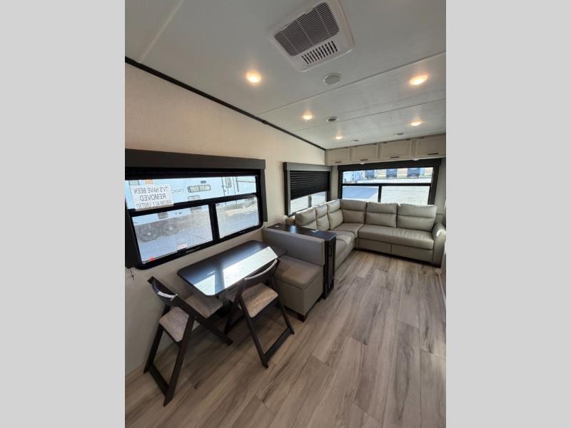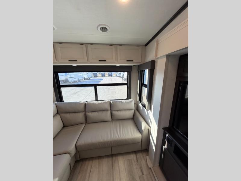 This fifth wheel will be the best RV vehicle for you and your family. Built to offer the ultimate comfort, this fifth wheel has a spacious living area that boasts a tri-fold sofa and sofa with recliners, perfect to rest while enjoying your tour favorites shows in the fabulous entertainment center. You can cook like a Michelin star chef in the incredible kitchen, fitted with a convection microwave, refrigerator, and three-burner range. Also, the overhead cabinets and pantry will allow you to keep all your food and spices organized on the go, and when your meal is done, you can enjoy it in the comfortable dinette. Convenience is our top priority; that is why the full bathroom is equipped with everything needed to take a nice shower. Finally, retreat to the comfortable queen bed, ideal for a deserved good night's rest.