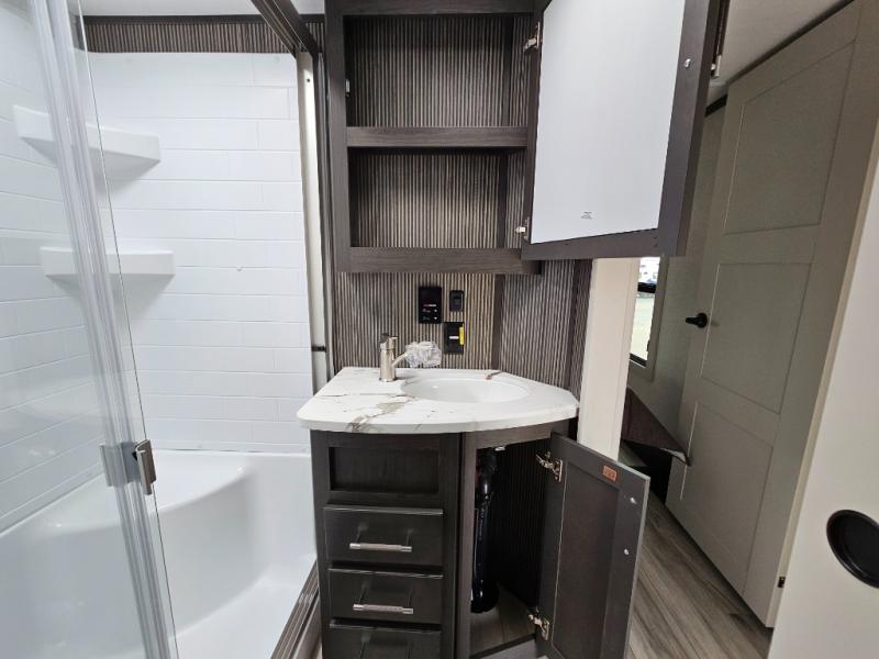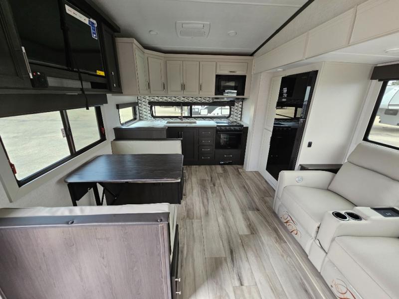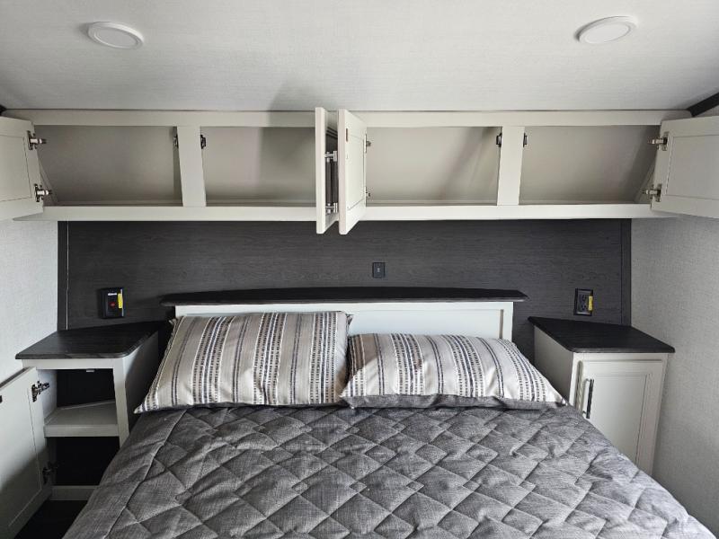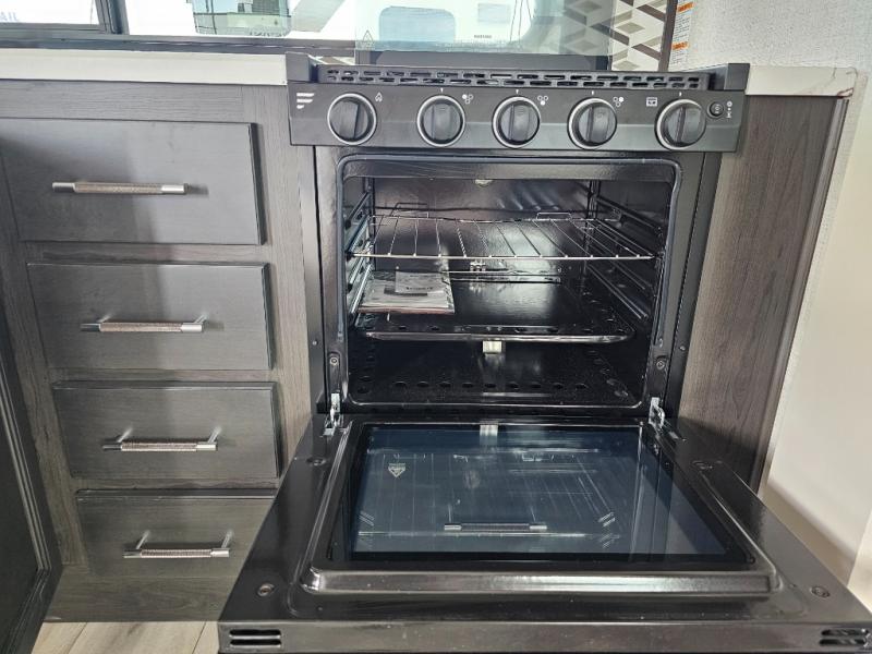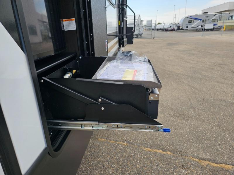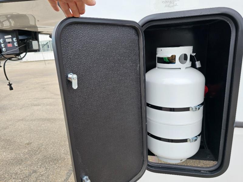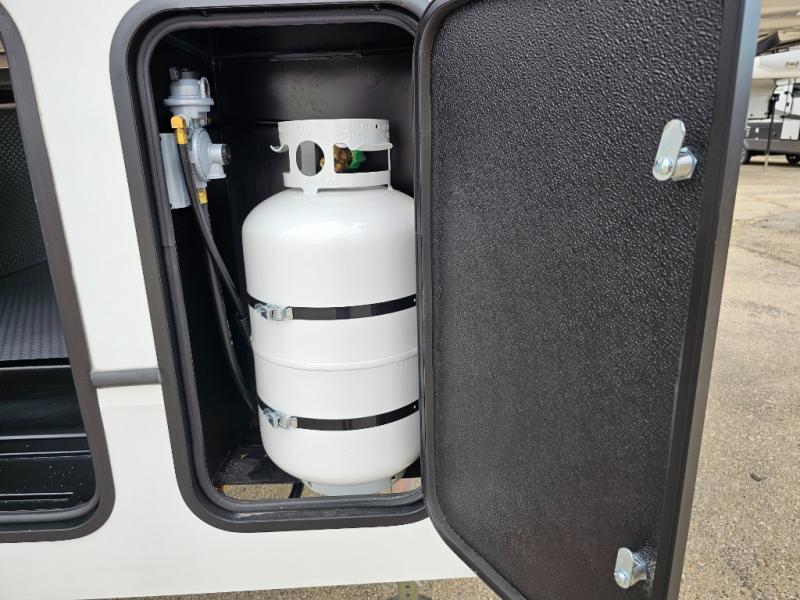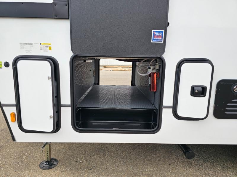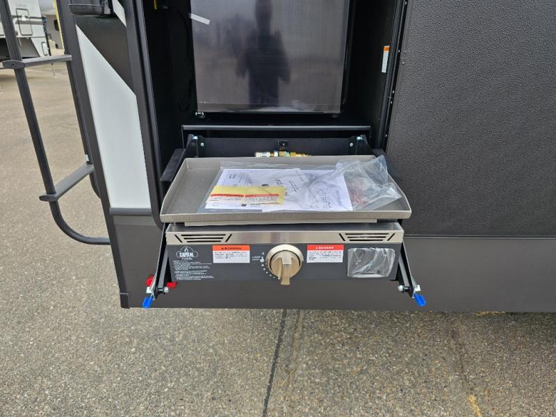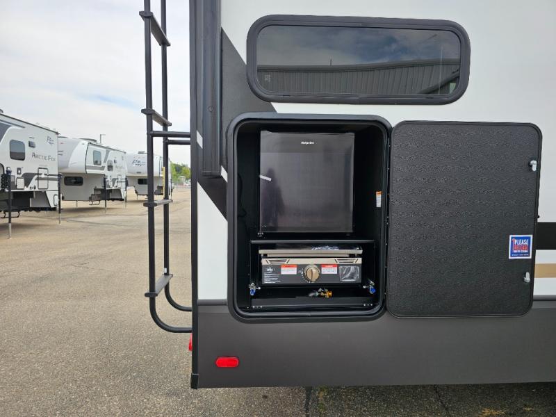 This rear kitchen fifth wheel is packed with features to make each trip memorable! Once you've arrived at the campground and set up the 21' electric awning, you can start lunch on the Grill-N-Chill outdoor kitchen before heading inside. If the weather isn't cooperating, you'll find a 21" Furrion range in the rear kitchen to whip up a meal. There is also a pantry and 12V "Solar Friendly" refrigerator for food storage. The theater seating will provide a place for you to relax in the evenings, and the full bath with a spacious shower means you can clean up before bed. Speaking of bedtime, the front private bedroom includes a queen bed for a great night's rest. There are also dual nightstands and a wardrobe slide to keep your space tidy!