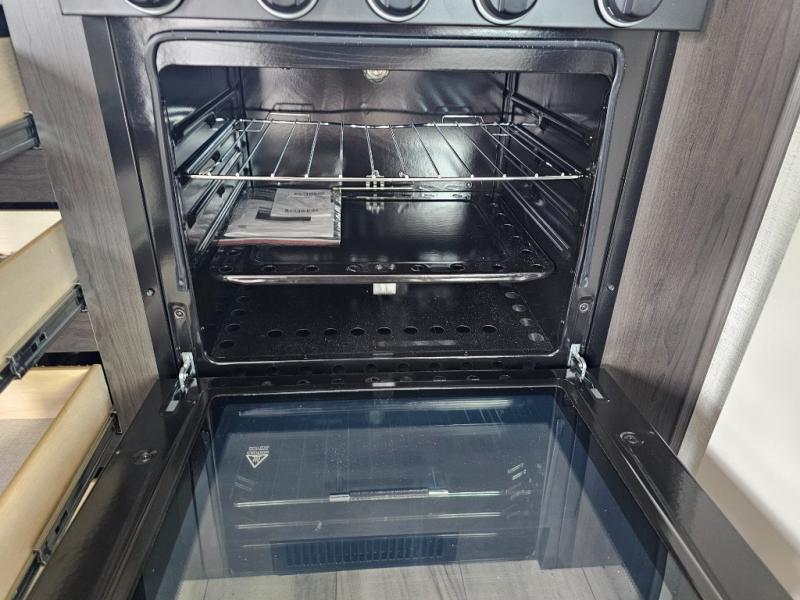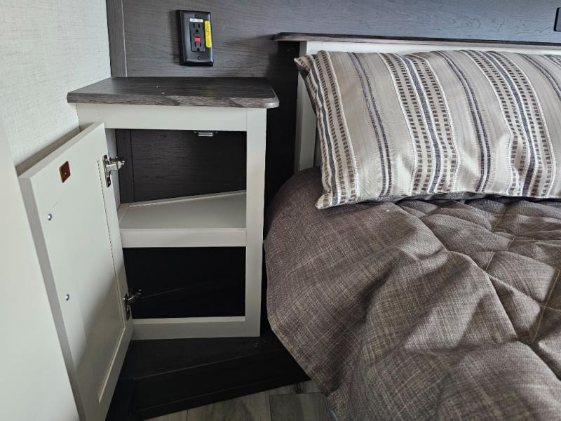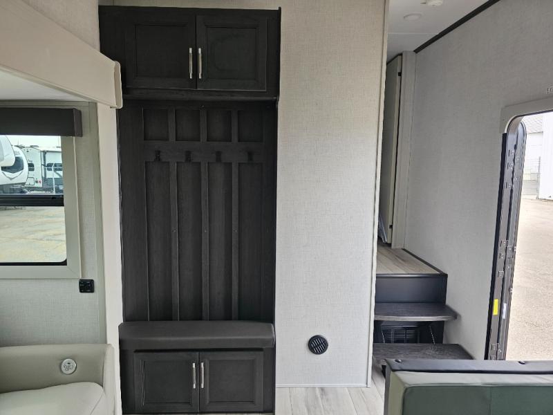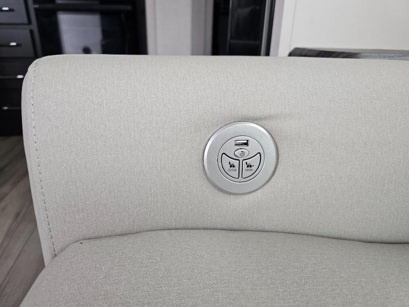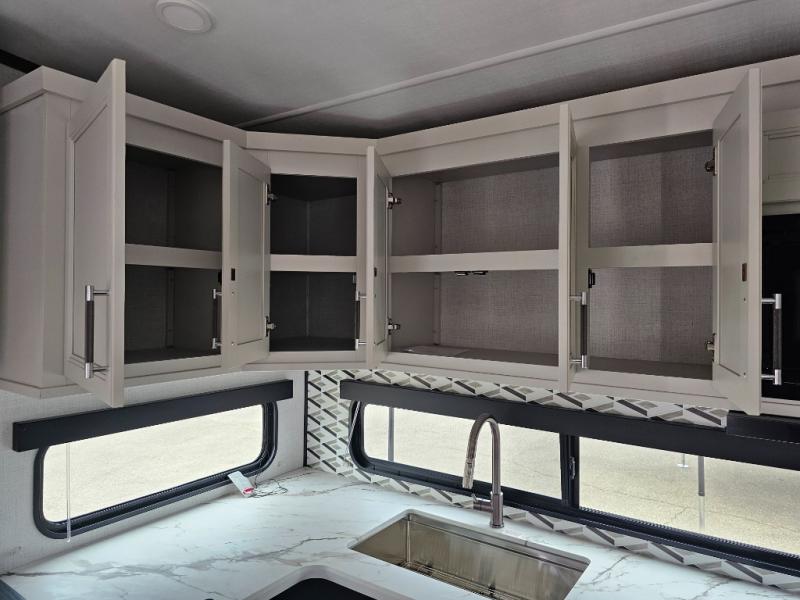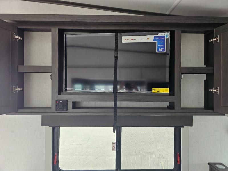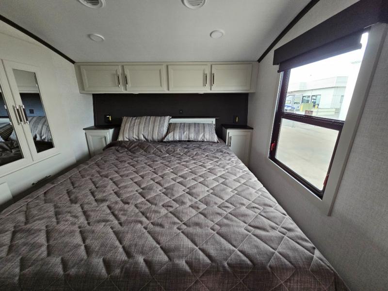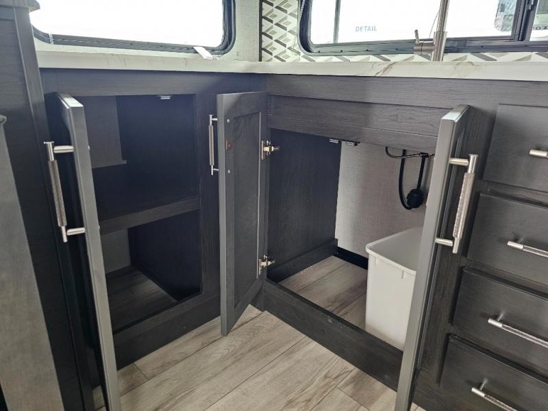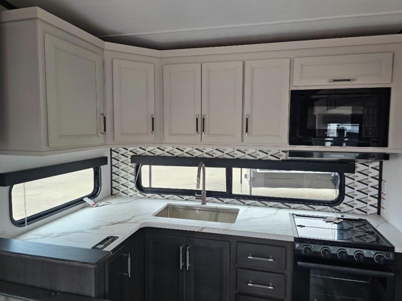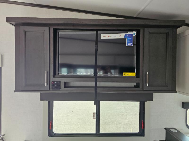 This rear kitchen fifth wheel is packed with features to make each trip memorable! Once you've arrived at the campground and set up the 21' electric awning, you can start lunch on the Grill-N-Chill outdoor kitchen before heading inside. If the weather isn't cooperating, you'll find a 21" Furrion range in the rear kitchen to whip up a meal. There is also a pantry and 12V "Solar Friendly" refrigerator for food storage. The theater seating will provide a place for you to relax in the evenings, and the full bath with a spacious shower means you can clean up before bed. Speaking of bedtime, the front private bedroom includes a queen bed for a great night's rest. There are also dual nightstands and a wardrobe slide to keep your space tidy!