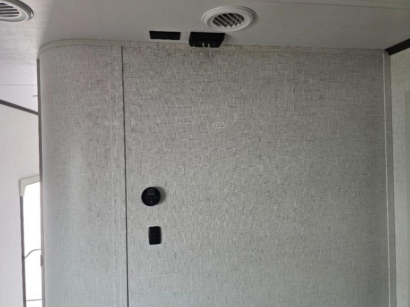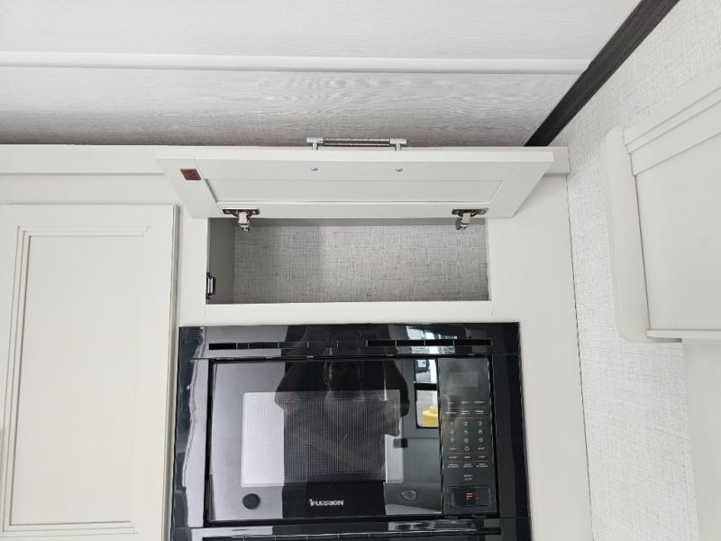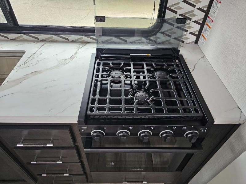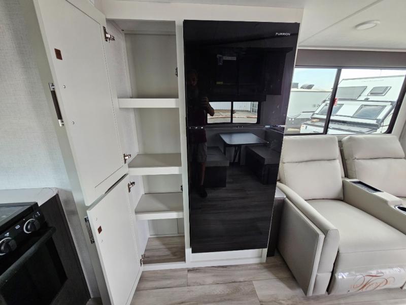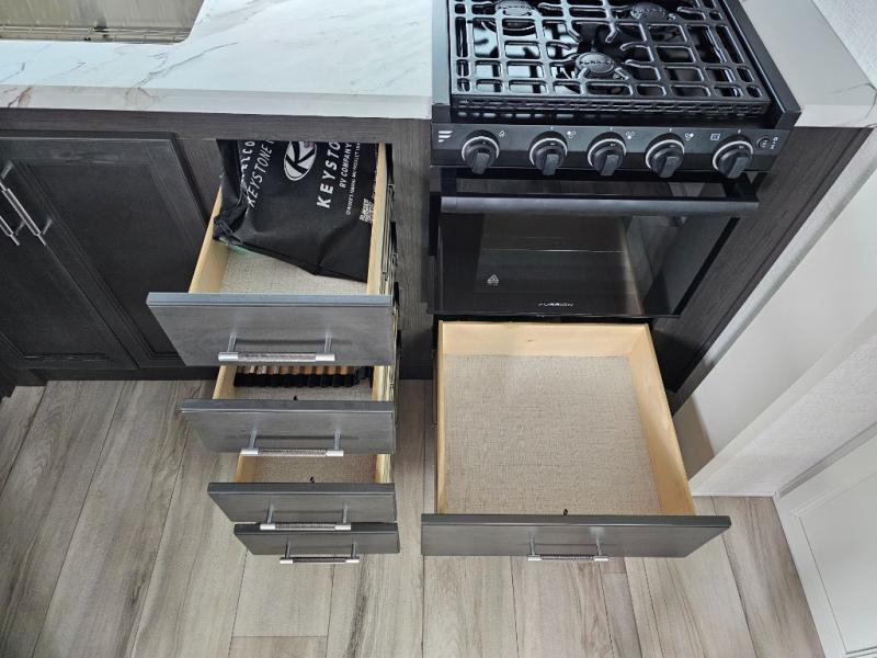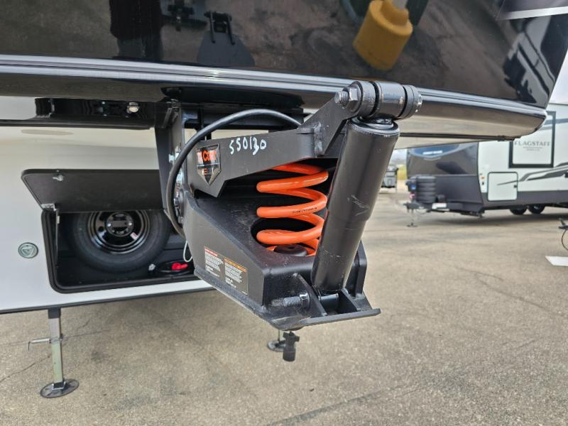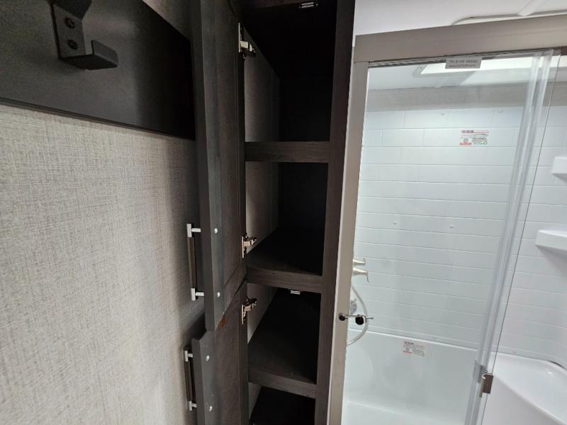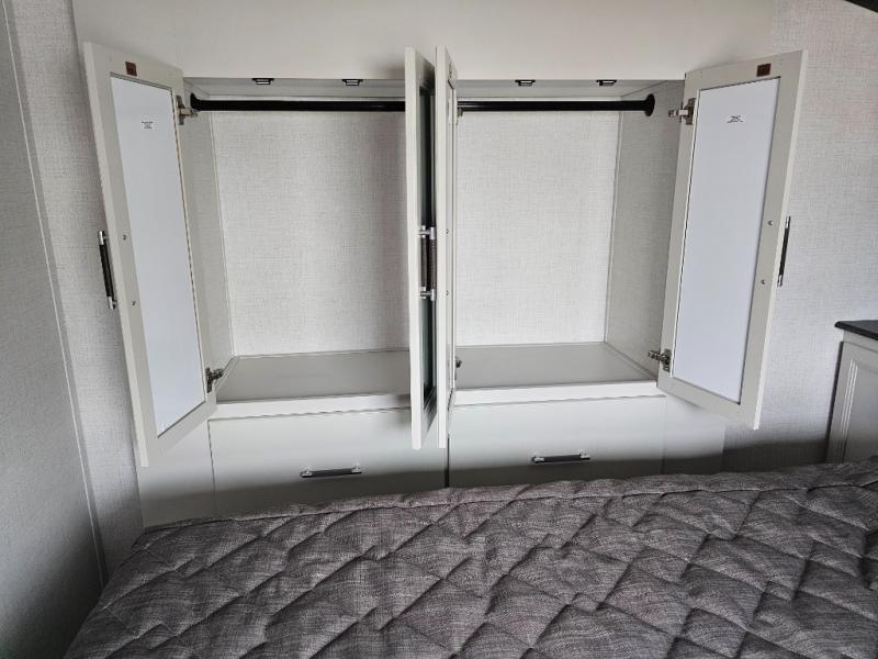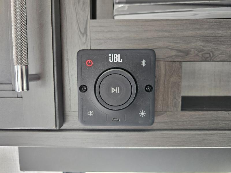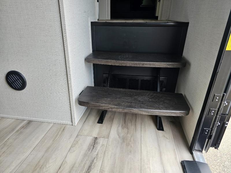 This rear kitchen fifth wheel is packed with features to make each trip memorable! Once you've arrived at the campground and set up the 21' electric awning, you can start lunch on the Grill-N-Chill outdoor kitchen before heading inside. If the weather isn't cooperating, you'll find a 21" Furrion range in the rear kitchen to whip up a meal. There is also a pantry and 12V "Solar Friendly" refrigerator for food storage. The theater seating will provide a place for you to relax in the evenings, and the full bath with a spacious shower means you can clean up before bed. Speaking of bedtime, the front private bedroom includes a queen bed for a great night's rest. There are also dual nightstands and a wardrobe slide to keep your space tidy!