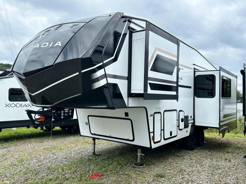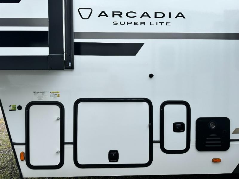 With any Arcadia Super Lite fifth wheel by Keystone, you will enjoy easy-to-tow lengths, unmatched storage, and plenty of windows to let the outdoor views in. The structural I-beam frame will provide a strong foundation to your RV, and the Full pass-through storage for all your equipment and camping gear. You will be able to camp in cold and hot climates thanks to the Peak Weather Package that includes a heated and enclosed underbelly, two Furrion A/C for cool temperatures in the summer, and Keystone's exclusive HyperDeck floor that adds an additional layer of insulation to your floor. The interior will make you feel at home with residential hardware, seamless pressed countertops, black roller shades, and ample storage space. Sometimes the best things come in smaller packages; choose a Arcadia Super Lite today!