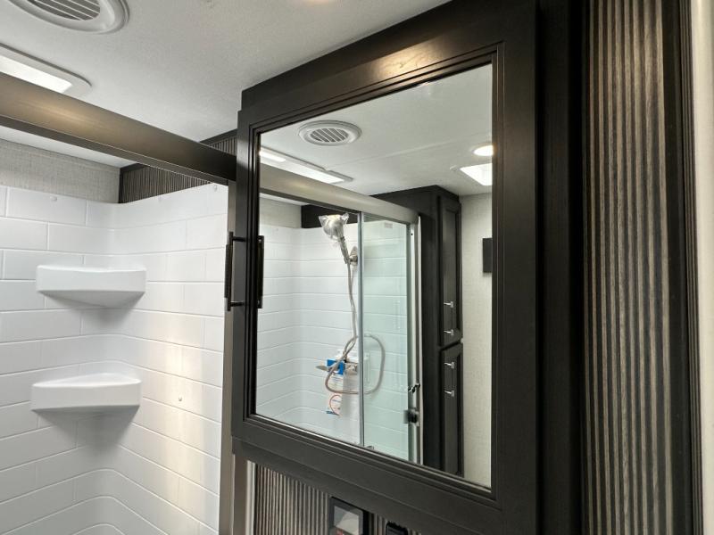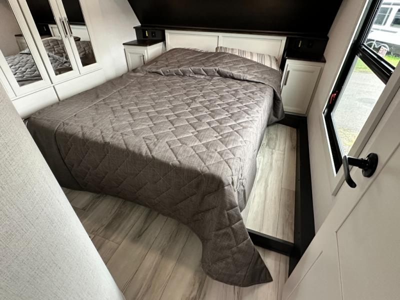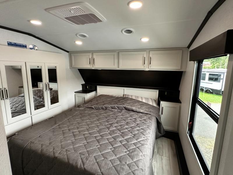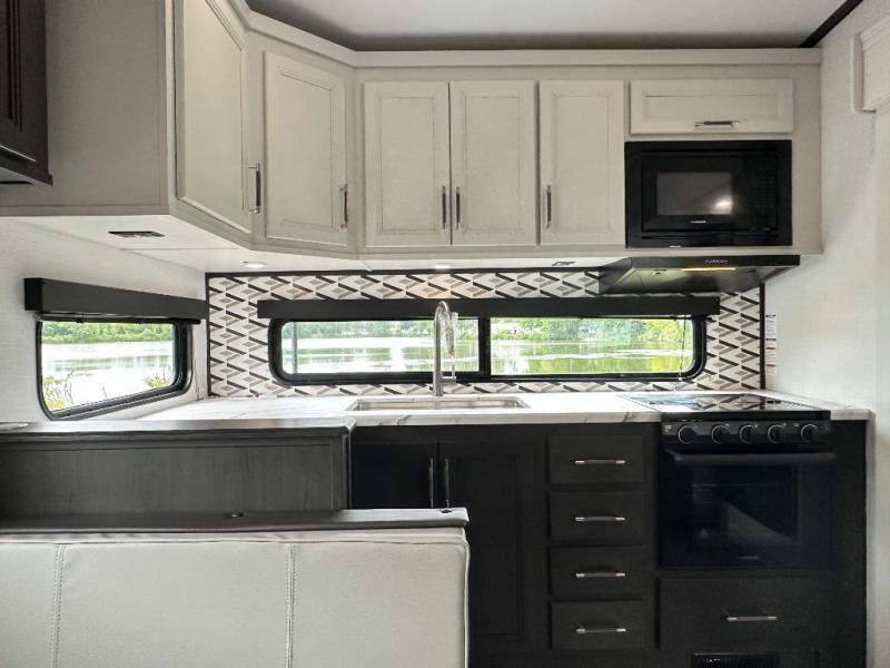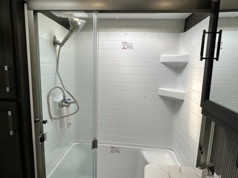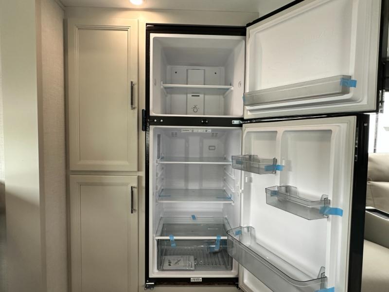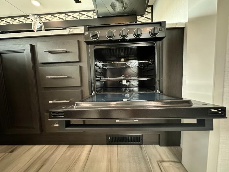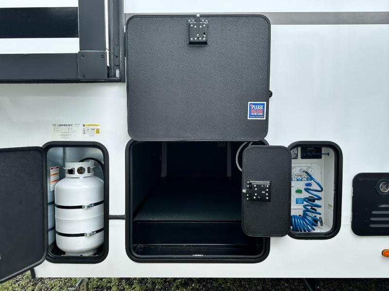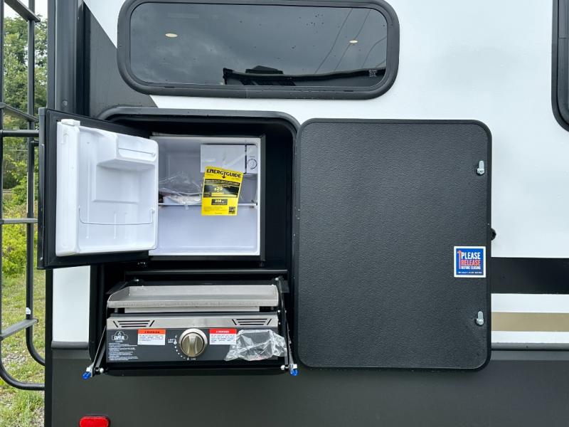 This rear kitchen fifth wheel is packed with features to make each trip memorable! Once you've arrived at the campground and set up the 21' electric awning, you can start lunch on the Grill-N-Chill outdoor kitchen before heading inside. If the weather isn't cooperating, you'll find a 21" Furrion range in the rear kitchen to whip up a meal. There is also a pantry and 12V "Solar Friendly" refrigerator for food storage. The theater seating will provide a place for you to relax in the evenings, and the full bath with a spacious shower means you can clean up before bed. Speaking of bedtime, the front private bedroom includes a queen bed for a great night's rest. There are also dual nightstands and a wardrobe slide to keep your space tidy!