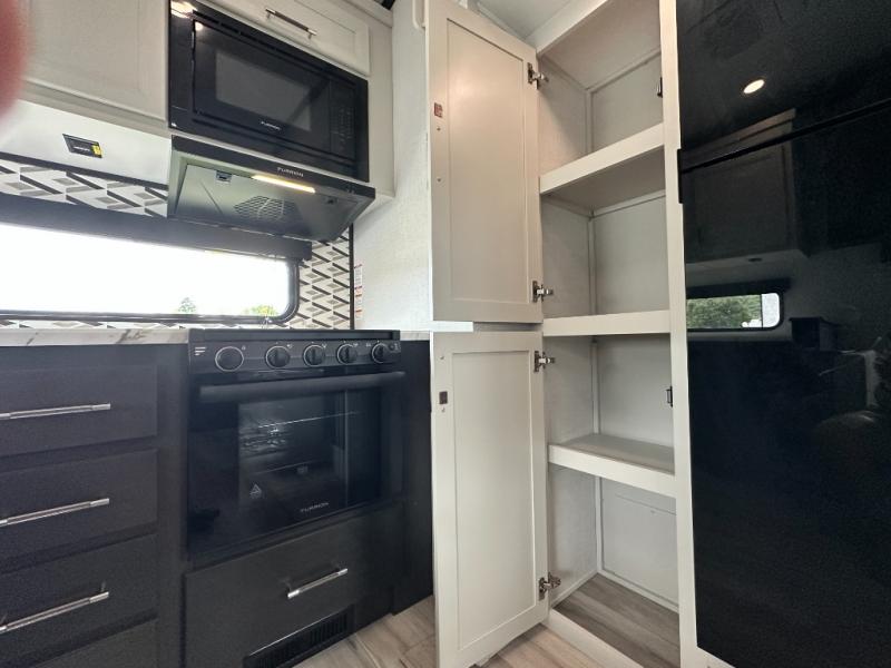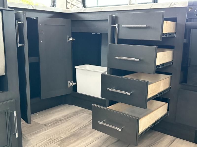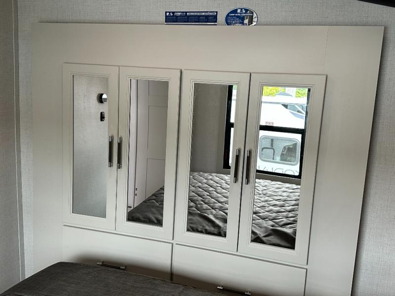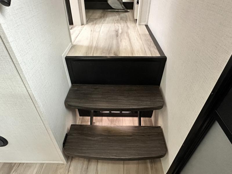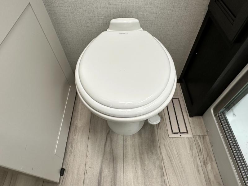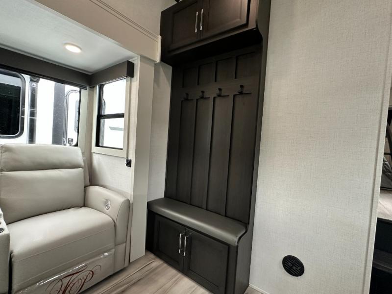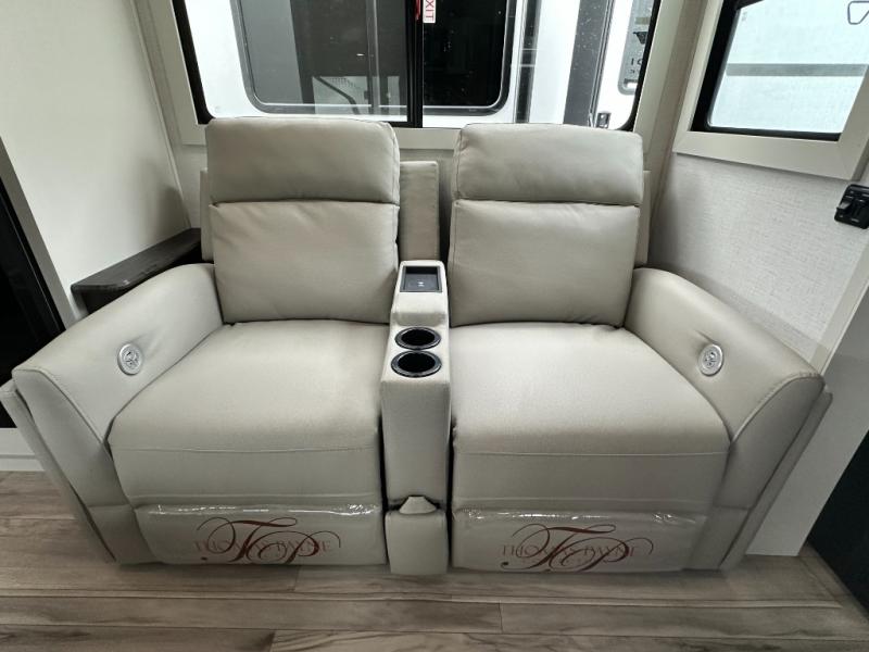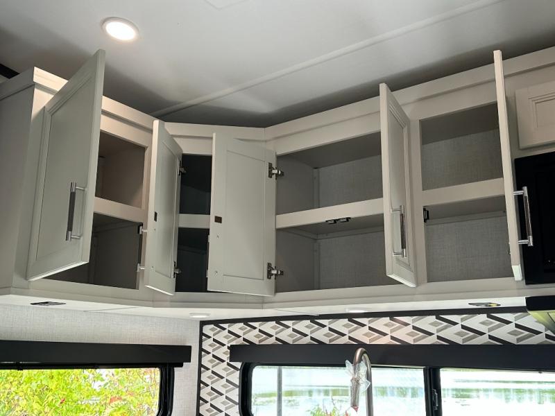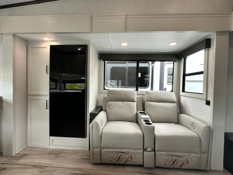 This rear kitchen fifth wheel is packed with features to make each trip memorable! Once you've arrived at the campground and set up the 21' electric awning, you can start lunch on the Grill-N-Chill outdoor kitchen before heading inside. If the weather isn't cooperating, you'll find a 21" Furrion range in the rear kitchen to whip up a meal. There is also a pantry and 12V "Solar Friendly" refrigerator for food storage. The theater seating will provide a place for you to relax in the evenings, and the full bath with a spacious shower means you can clean up before bed. Speaking of bedtime, the front private bedroom includes a queen bed for a great night's rest. There are also dual nightstands and a wardrobe slide to keep your space tidy!
