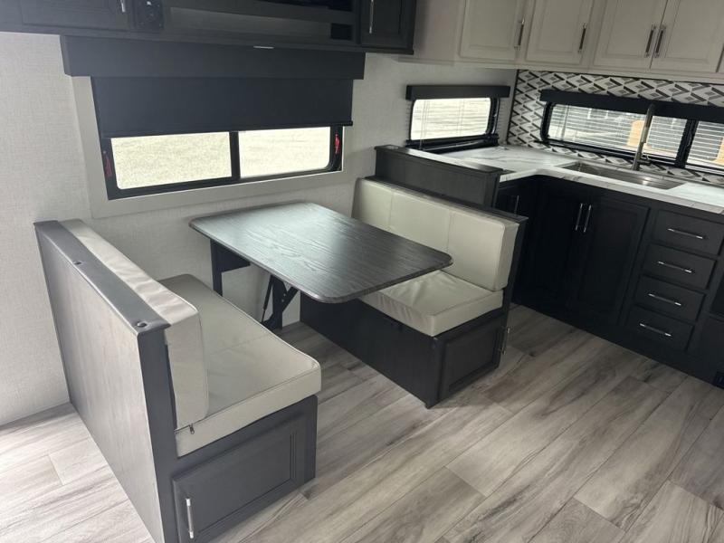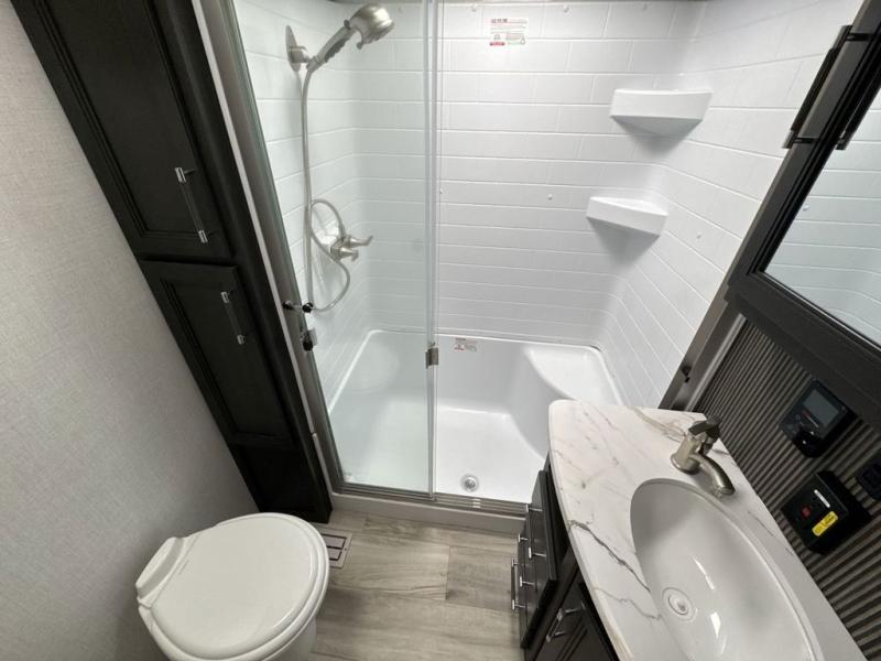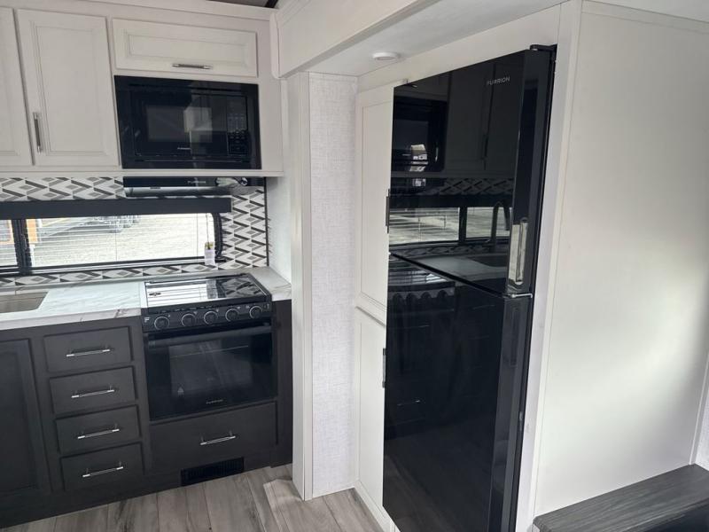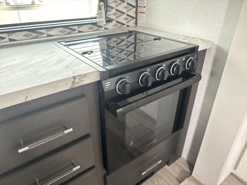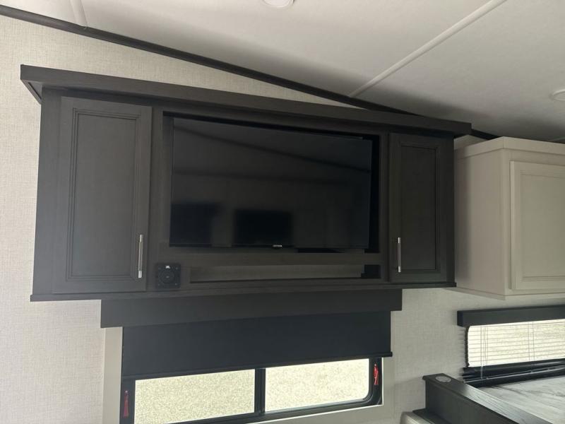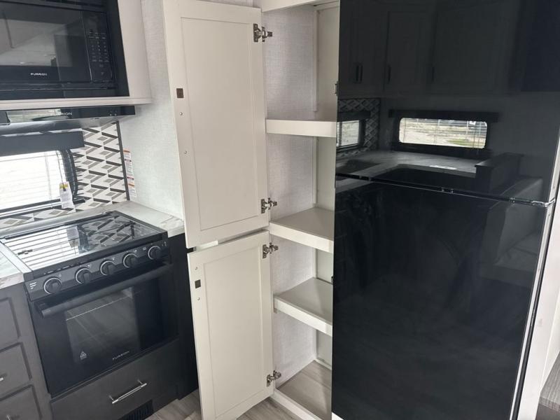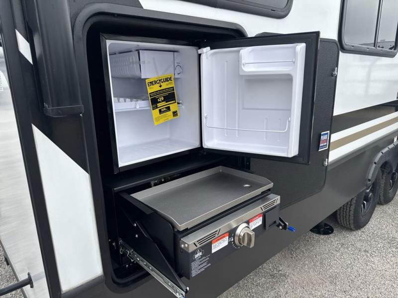 This rear kitchen fifth wheel is packed with features to make each trip memorable! Once you've arrived at the campground and set up the 21' electric awning, you can start lunch on the Grill-N-Chill outdoor kitchen before heading inside. If the weather isn't cooperating, you'll find a 21" Furrion range in the rear kitchen to whip up a meal. There is also a pantry and 12V "Solar Friendly" refrigerator for food storage. The theater seating will provide a place for you to relax in the evenings, and the full bath with a spacious shower means you can clean up before bed. Speaking of bedtime, the front private bedroom includes a queen bed for a great night's rest. There are also dual nightstands and a wardrobe slide to keep your space tidy!