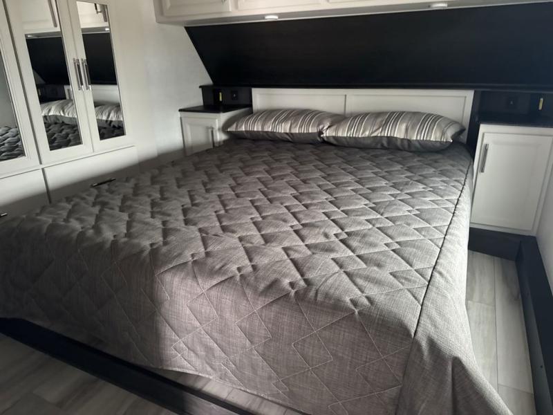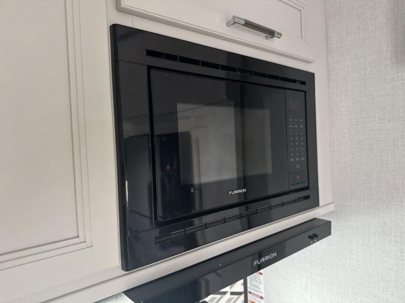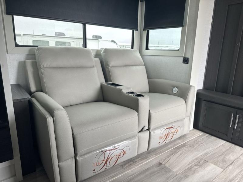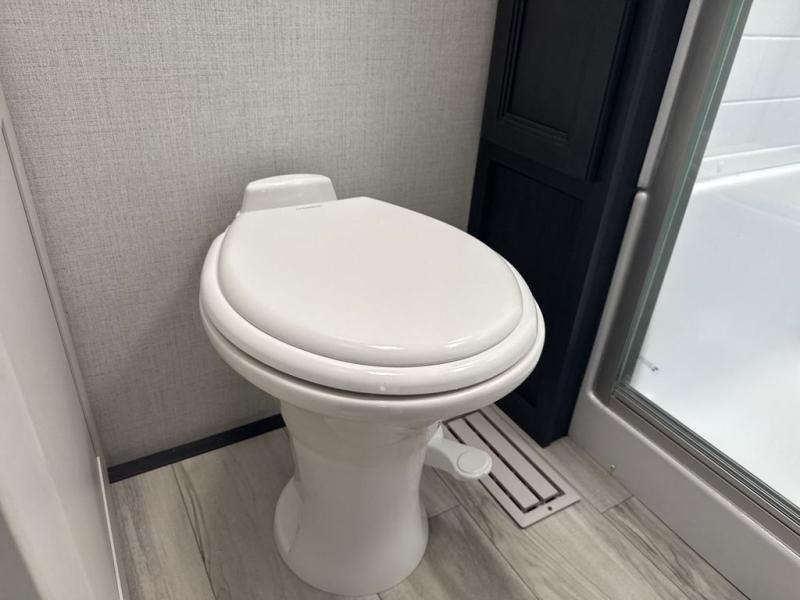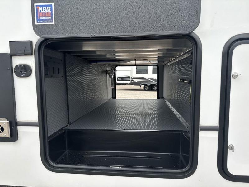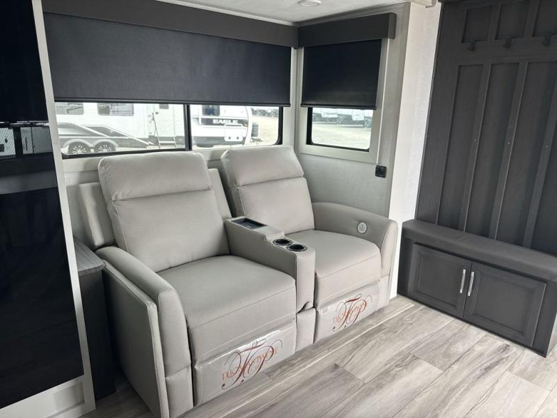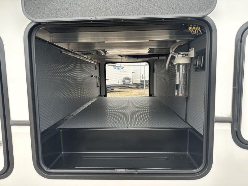This rear kitchen fifth wheel is packed with features to make each trip memorable! Once you've arrived at the campground and set up the 21' electric awning, you can start lunch on the Grill-N-Chill outdoor kitchen before heading inside. If the weather isn't cooperating, you'll find a 21" Furrion range in the rear kitchen to whip up a meal. There is also a pantry and 12V "Solar Friendly" refrigerator for food storage. The theater seating will provide a place for you to relax in the evenings, and the full bath with a spacious shower means you can clean up before bed. Speaking of bedtime, the front private bedroom includes a queen bed for a great night's rest. There are also dual nightstands and a wardrobe slide to keep your space tidy!