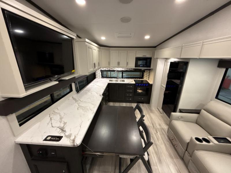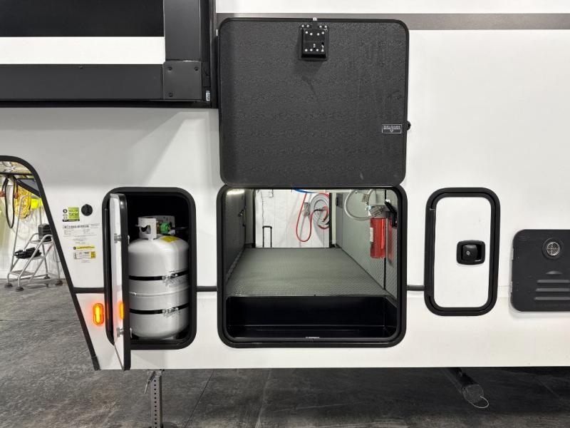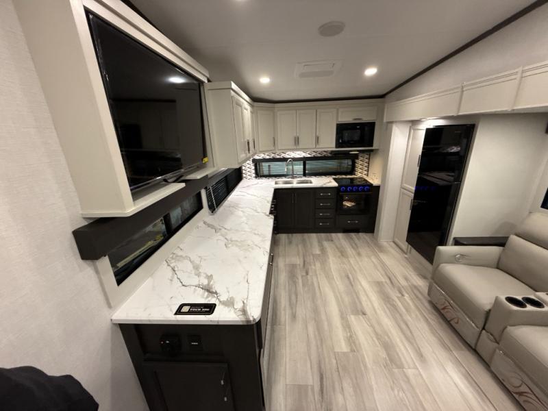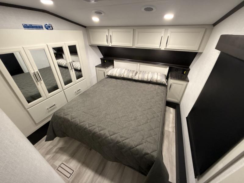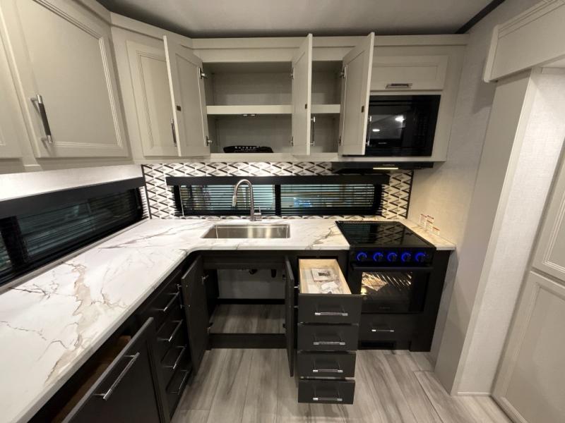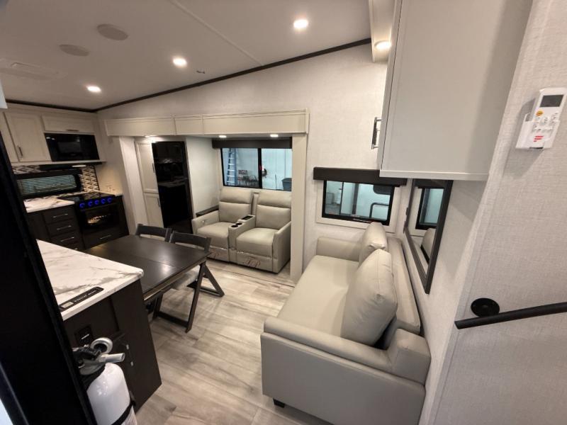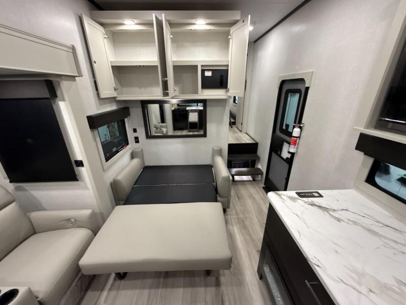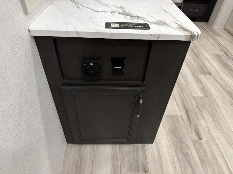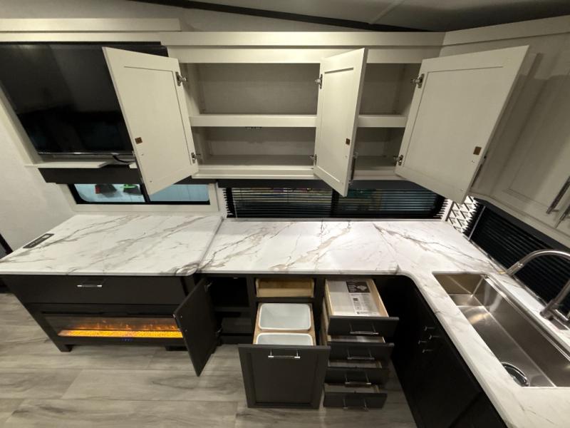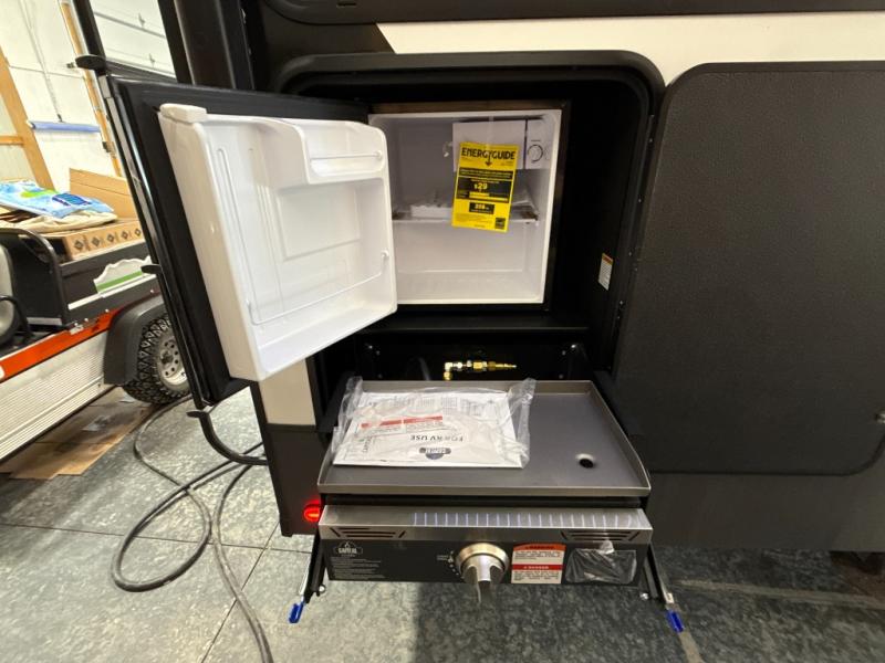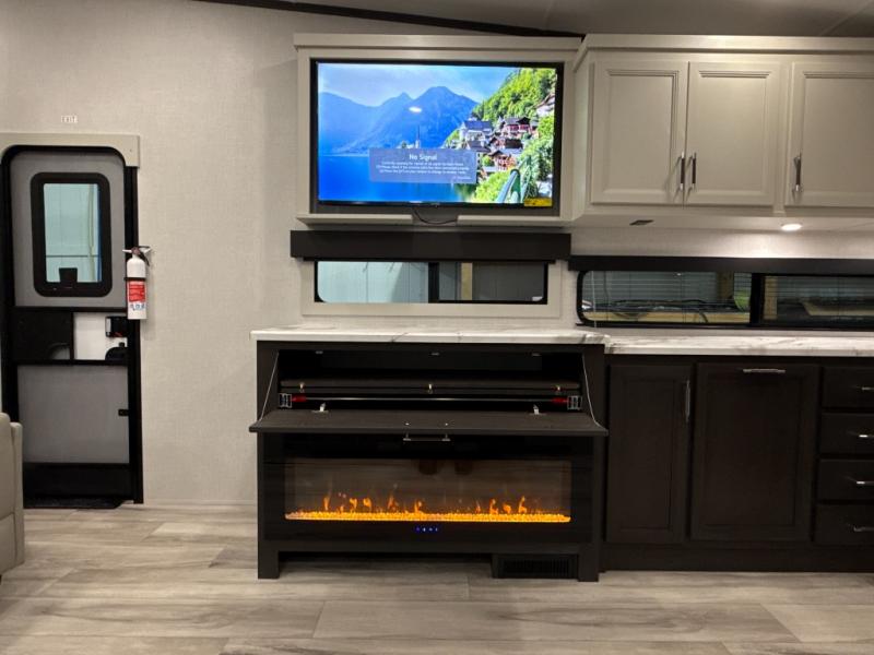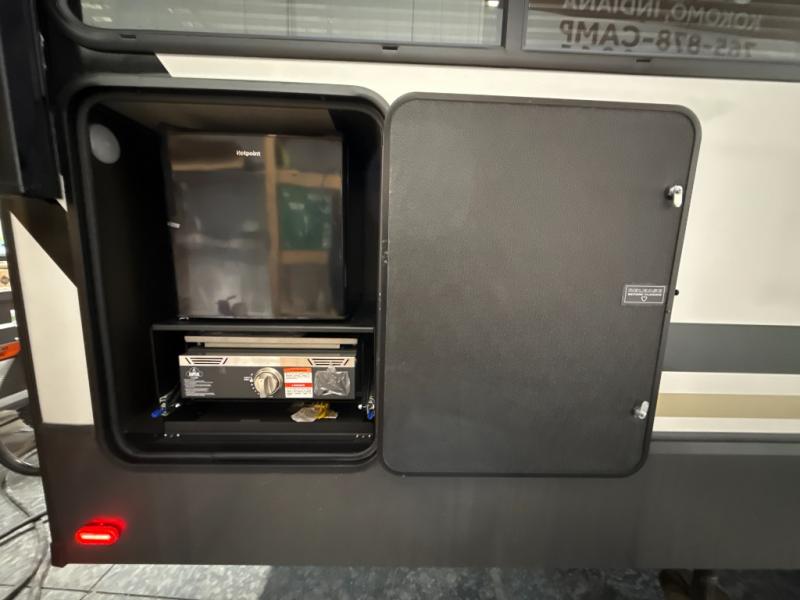 You're sure to love every minute spent in this rear kitchen fifth wheel! There is generous counter space to prep your best meals plus a pull-out dinette table where you can dine together. Additional seating space can be found on the theater seating and hide-a-bed sofa. There is even a fireplace to make this space more cozy. If you enjoy spending time outdoors, there is a Grill-N-Chill outdoor kitchen, 19' power awning, and Composite Stow Away solid steps. When it's time to call it a night, the queen bed in the private bedroom is sure to be calling your name!