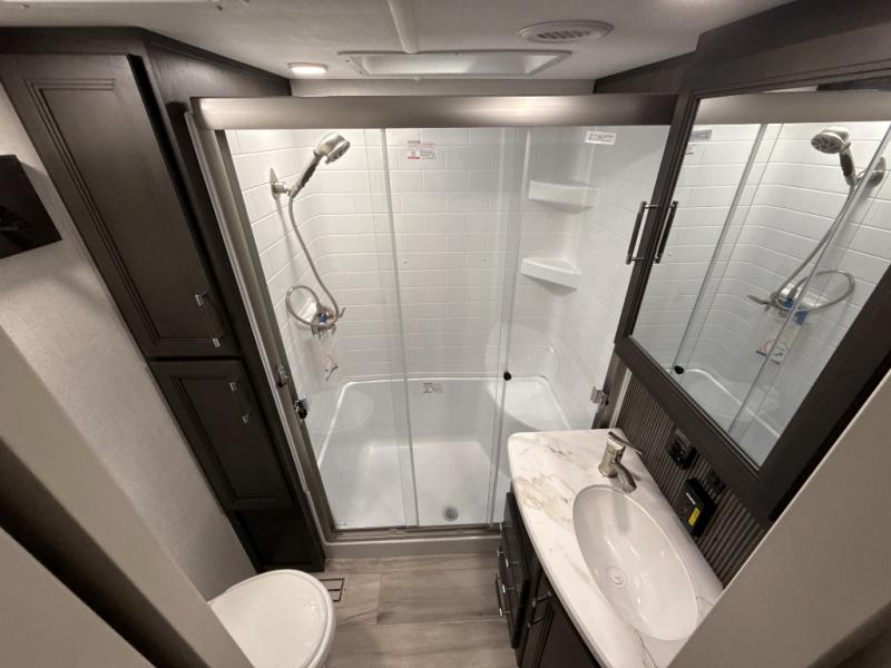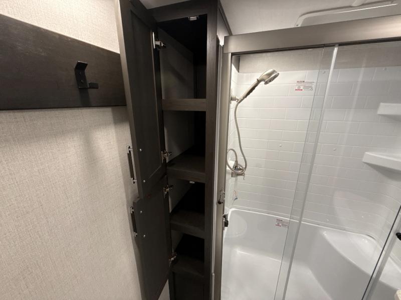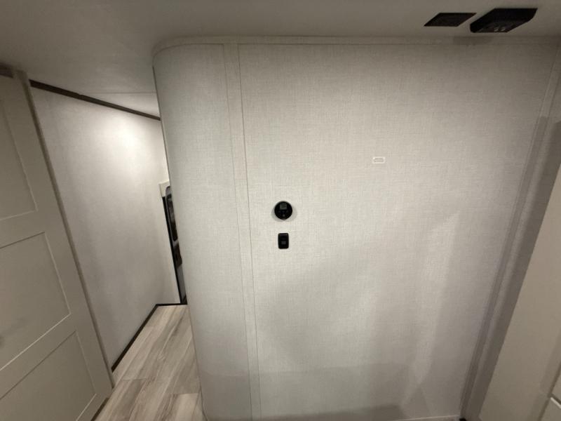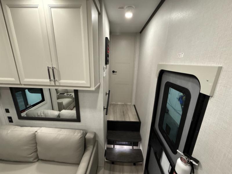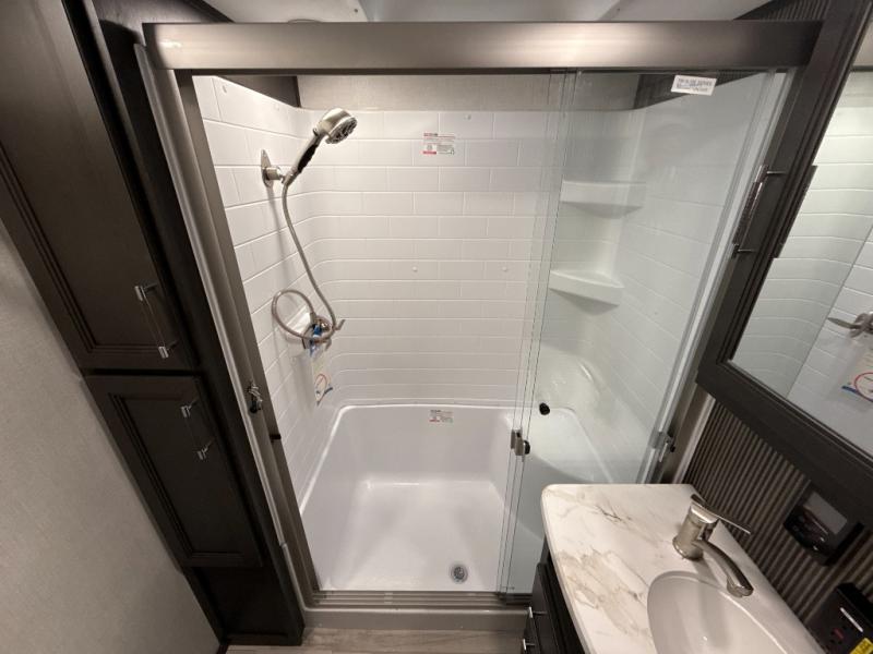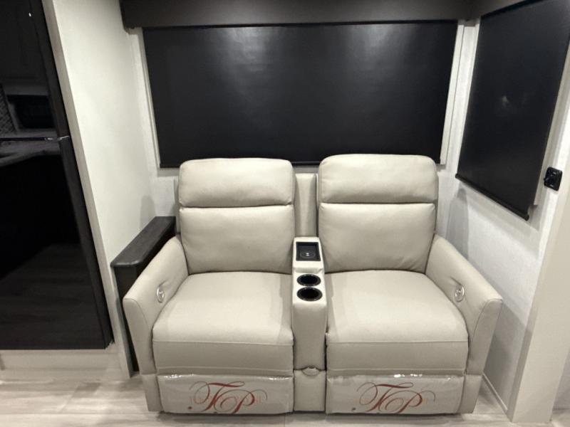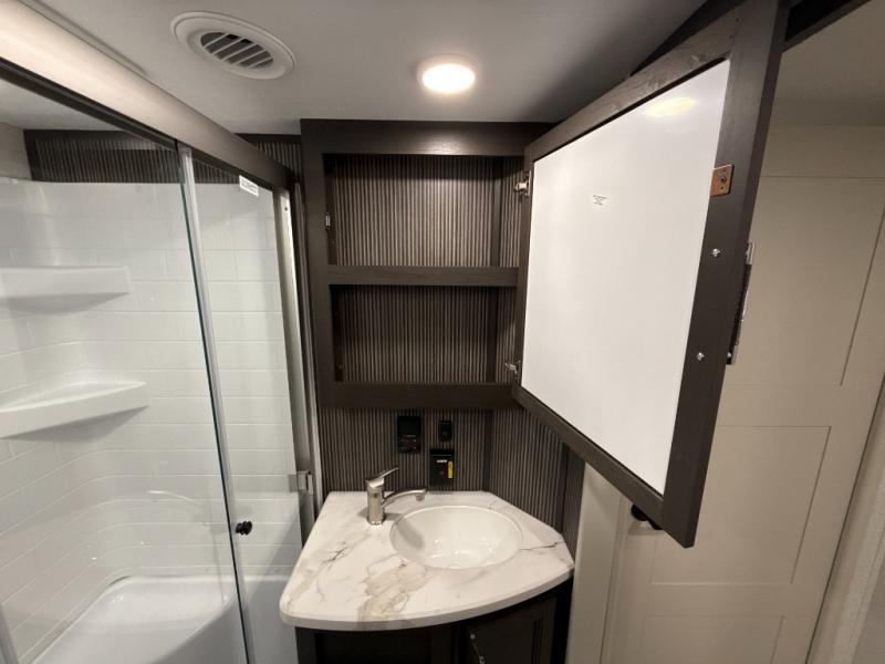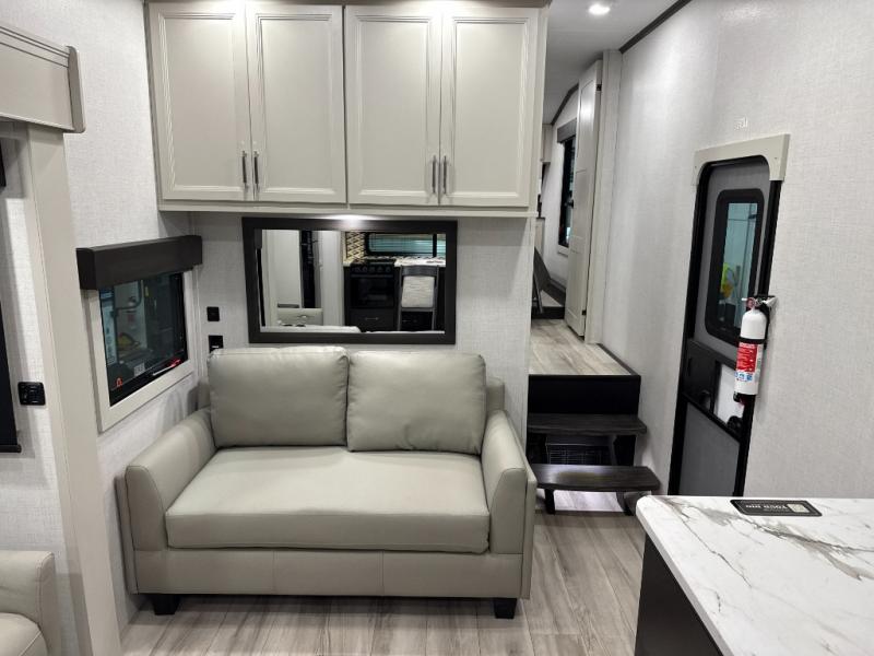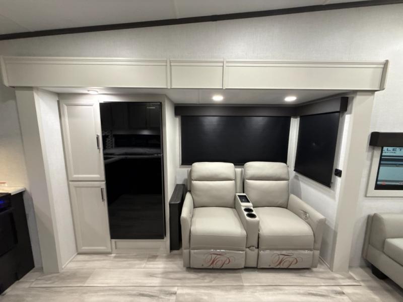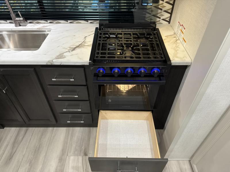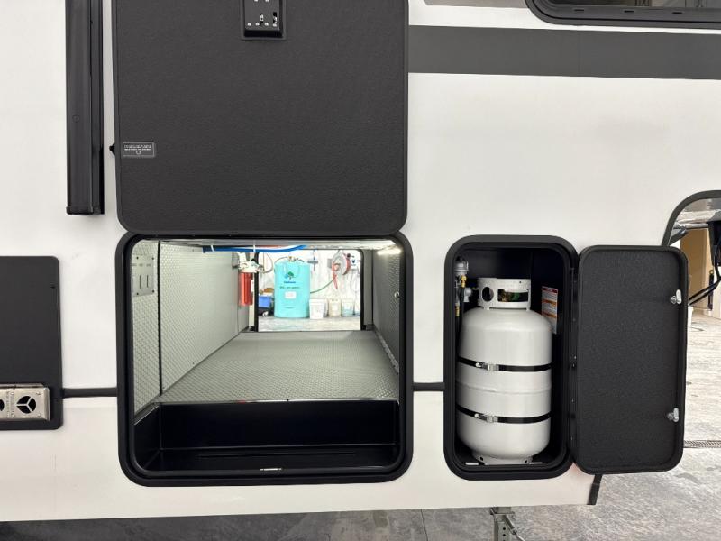 You're sure to love every minute spent in this rear kitchen fifth wheel! There is generous counter space to prep your best meals plus a pull-out dinette table where you can dine together. Additional seating space can be found on the theater seating and hide-a-bed sofa. There is even a fireplace to make this space more cozy. If you enjoy spending time outdoors, there is a Grill-N-Chill outdoor kitchen, 19' power awning, and Composite Stow Away solid steps. When it's time to call it a night, the queen bed in the private bedroom is sure to be calling your name!