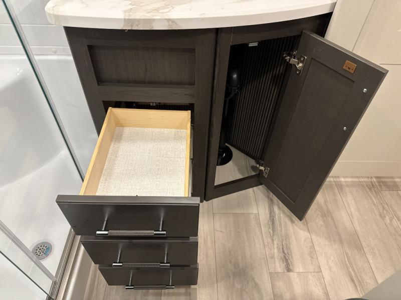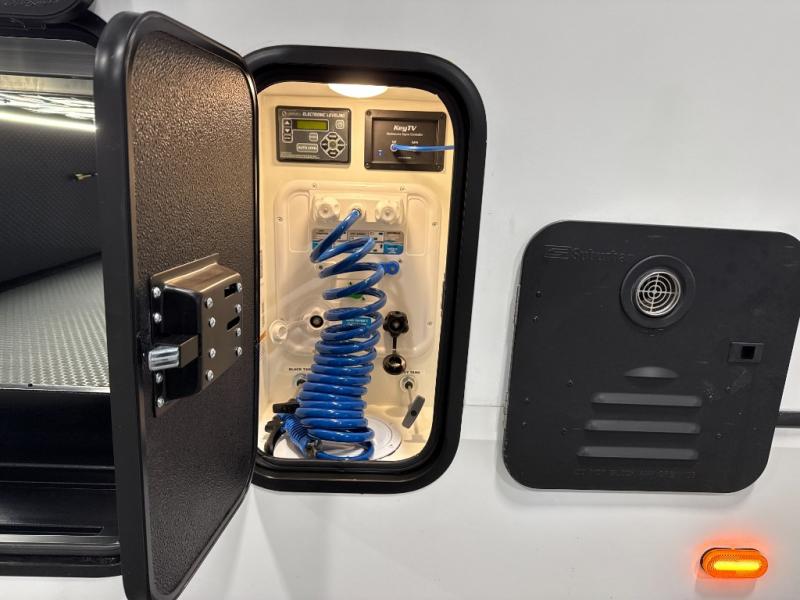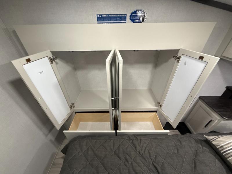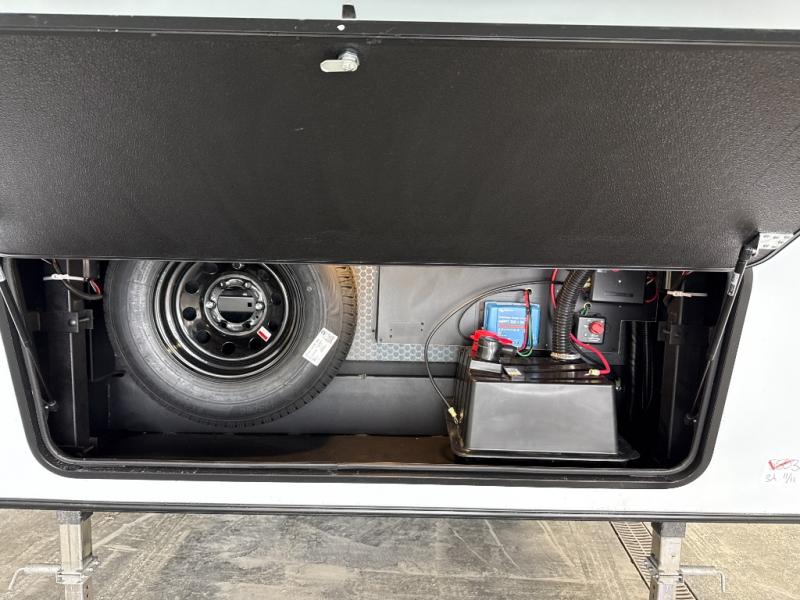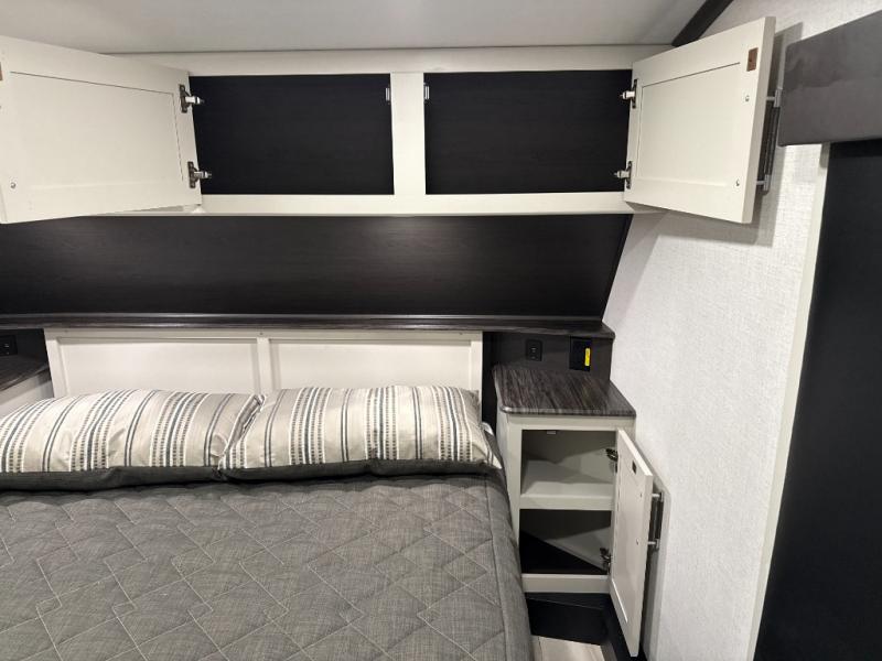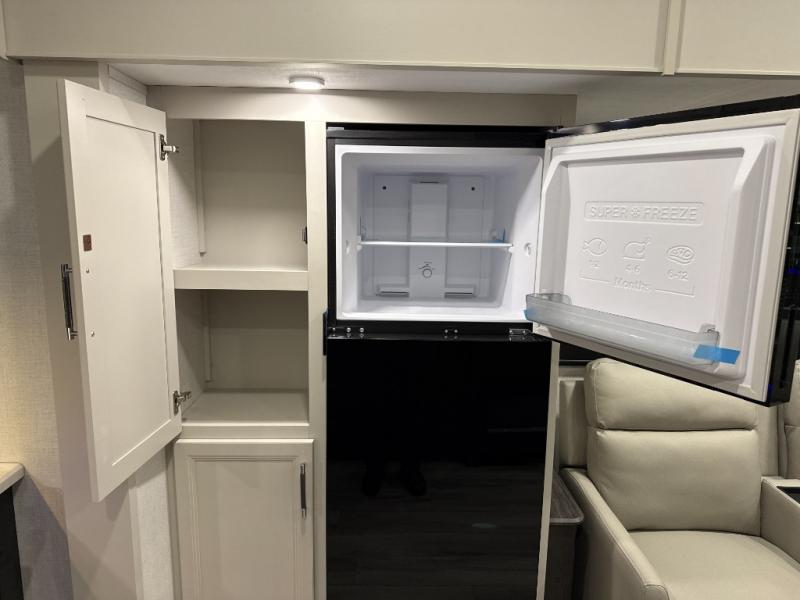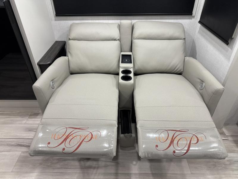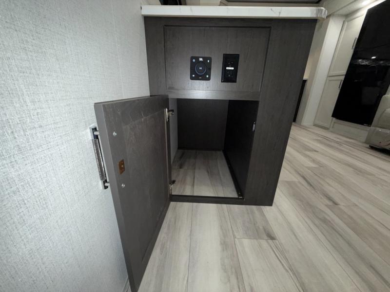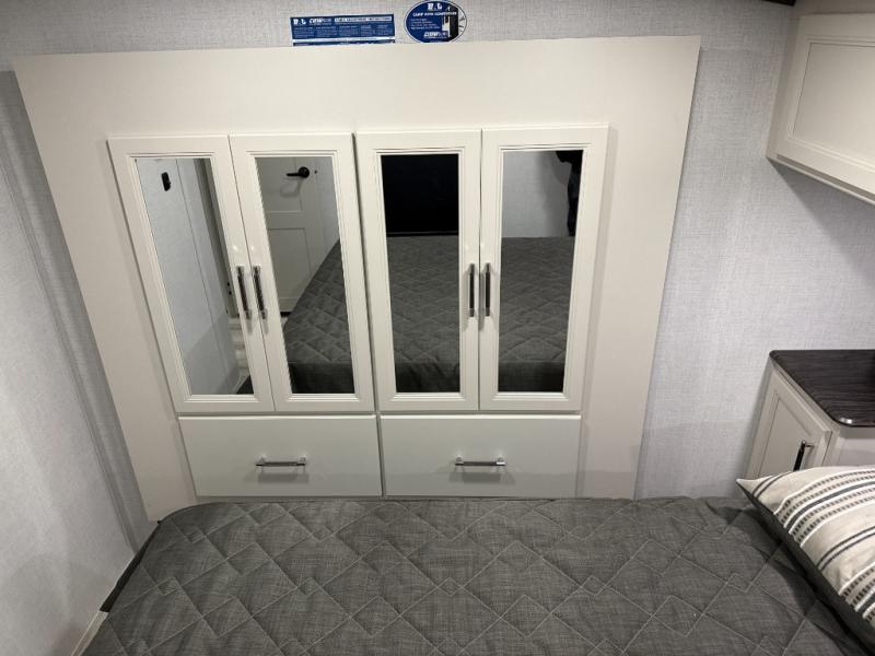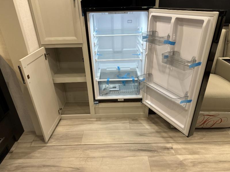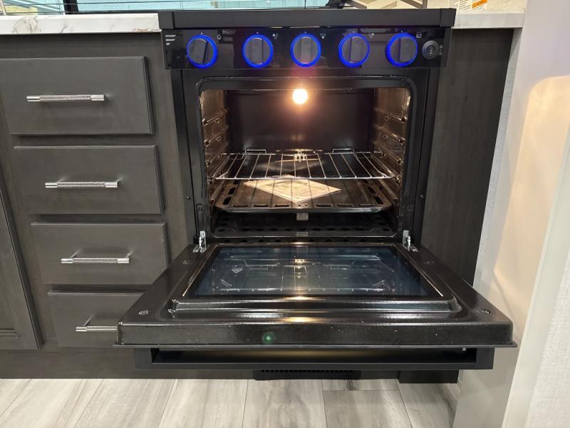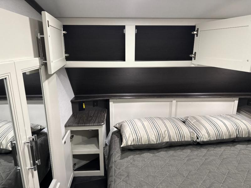 You're sure to love every minute spent in this rear kitchen fifth wheel! There is generous counter space to prep your best meals plus a pull-out dinette table where you can dine together. Additional seating space can be found on the theater seating and hide-a-bed sofa. There is even a fireplace to make this space more cozy. If you enjoy spending time outdoors, there is a Grill-N-Chill outdoor kitchen, 19' power awning, and Composite Stow Away solid steps. When it's time to call it a night, the queen bed in the private bedroom is sure to be calling your name!