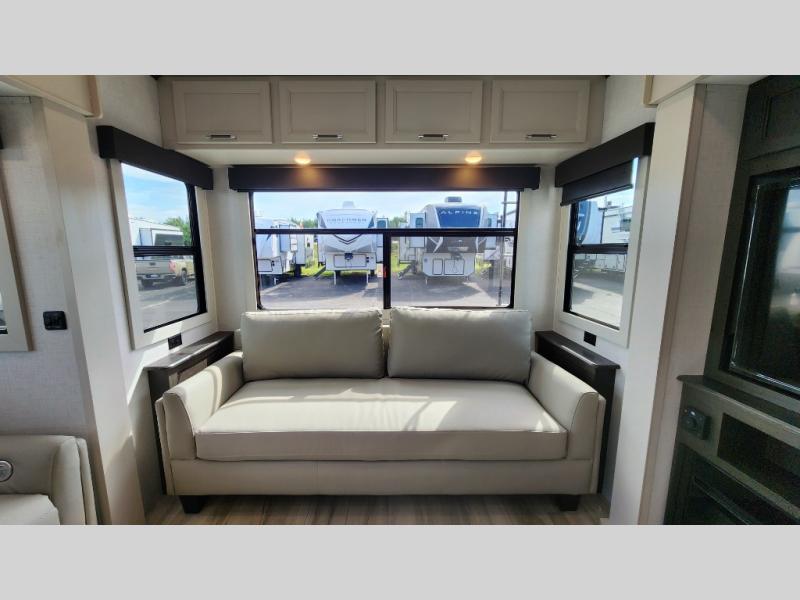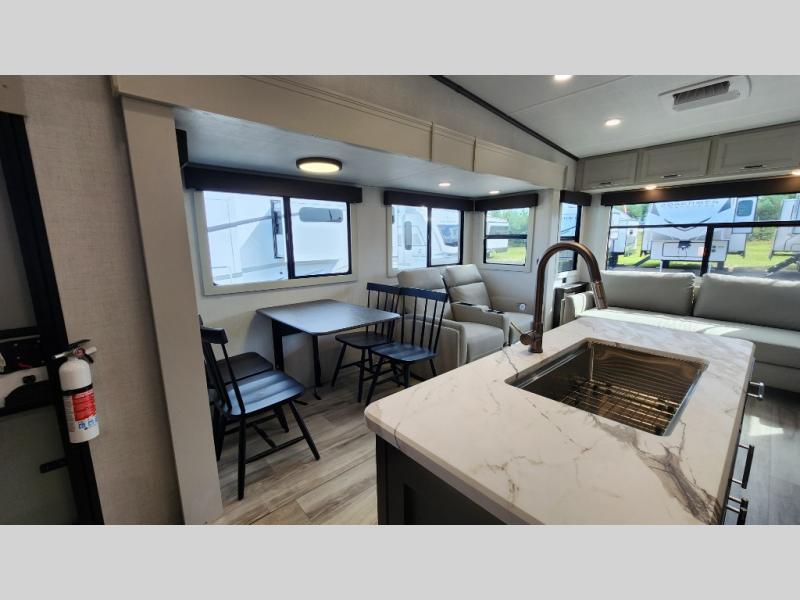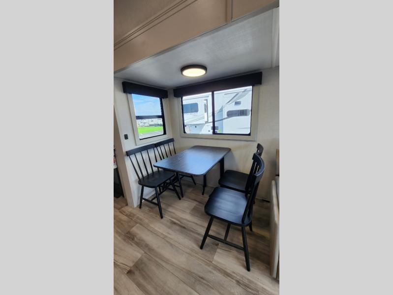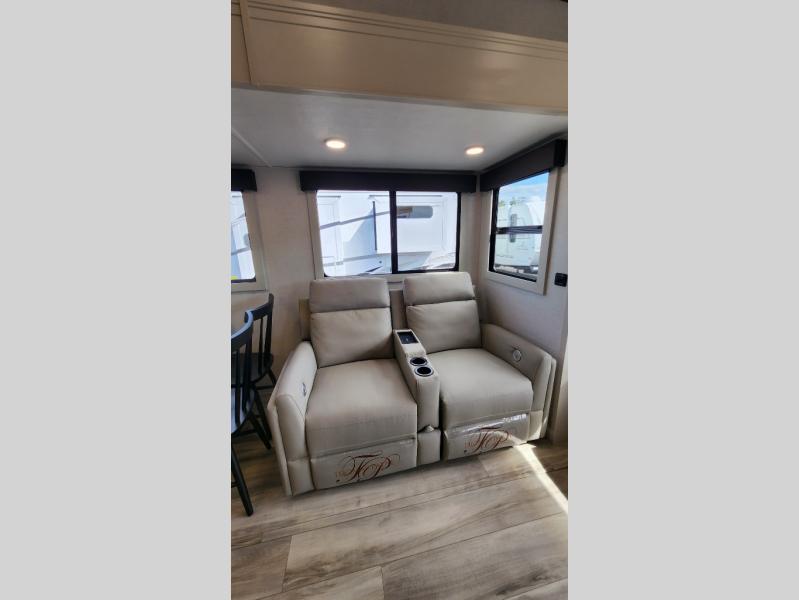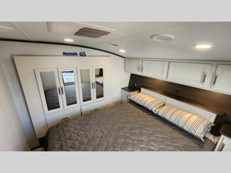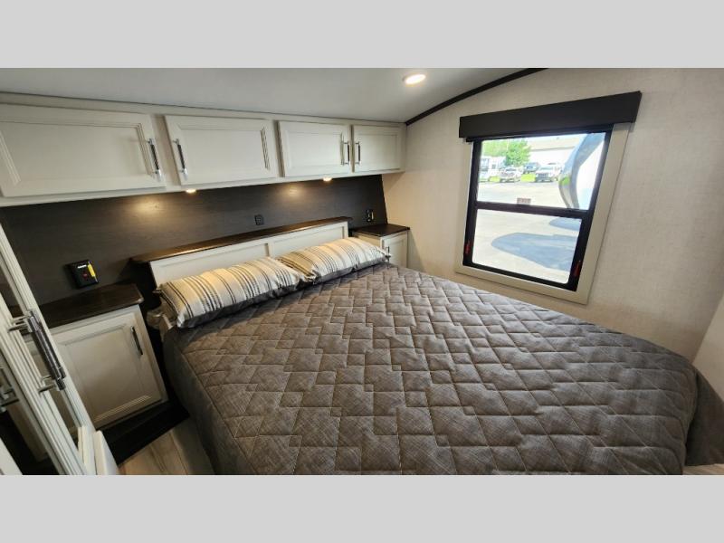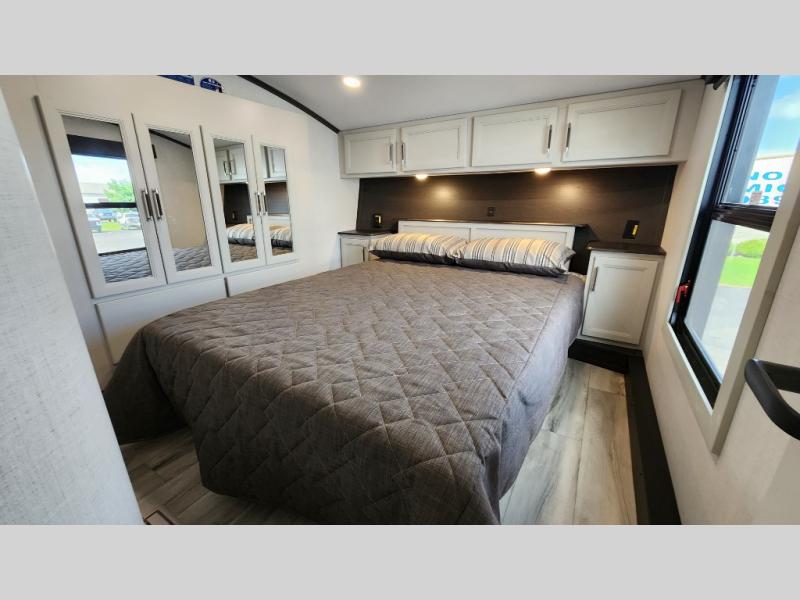 Make each camping trip complete with this fifth wheel in tow! The chef of your group will love making meals each day in the fully equipped kitchen that includes a kitchen island, a hutch, plus a pantry for food storage. The booth dinette will provide a place to dine each day, and the theater seating is right across from the TV with storage behind and a fireplace for easy viewing. And if you're not needing additional sleeping space you can switch out the booth dinette for the optional free-standing dinette! If you have guests, they can sleep on the rear XL sofa sleeper each night that extends to king-size, while you take the front private bedroom. Here, you'll find a queen bed, a wardrobe slide out, plus dual nightstands for your things.