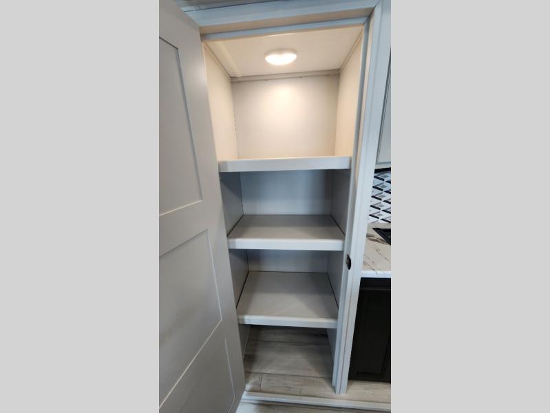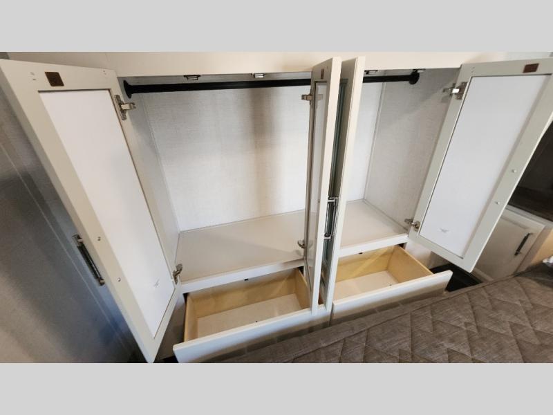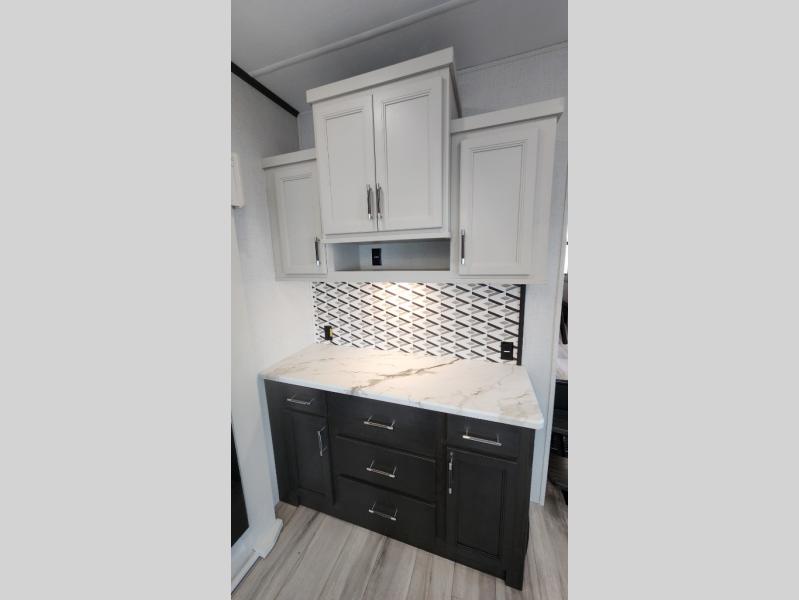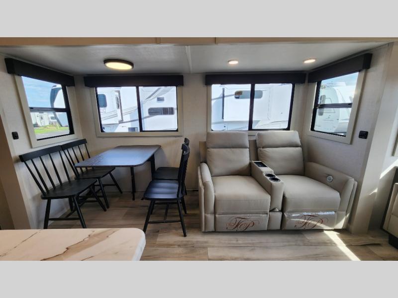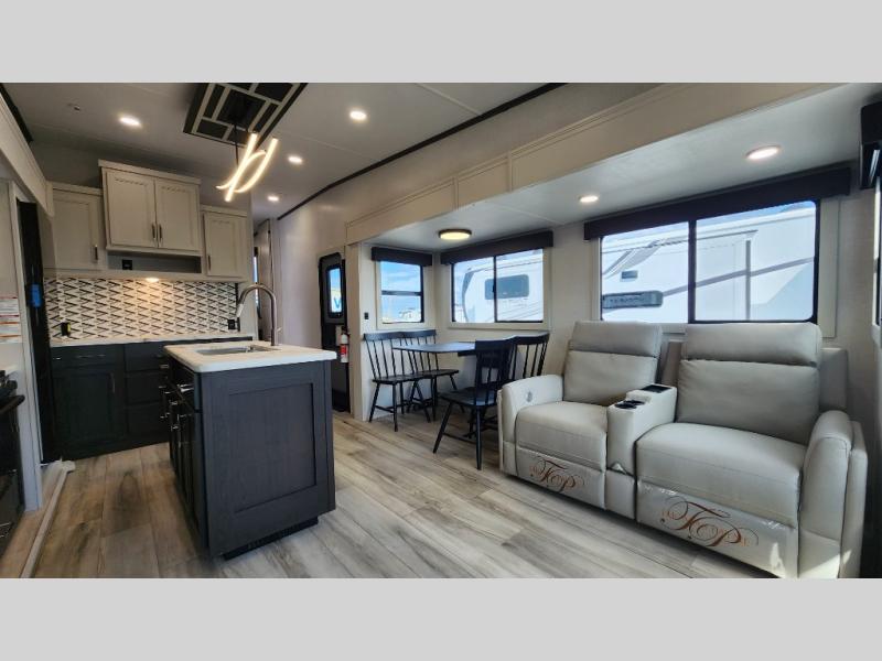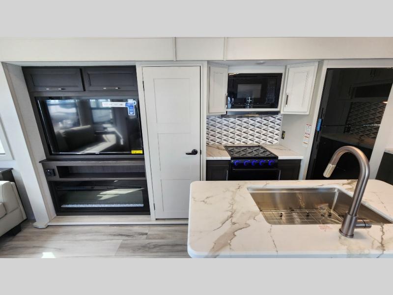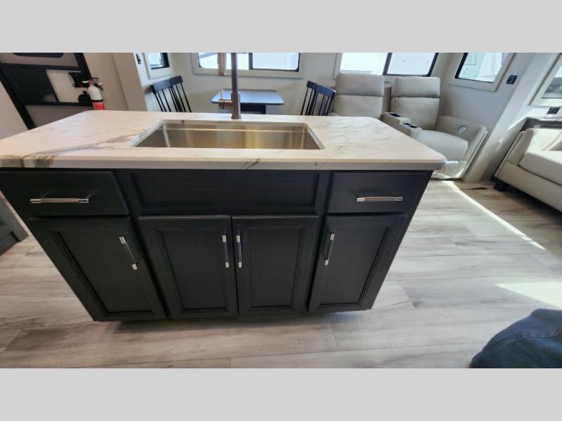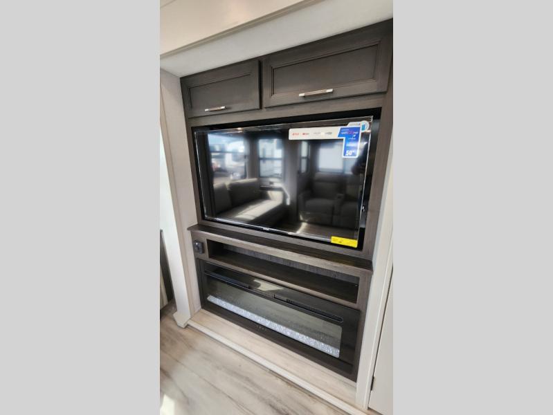Make each camping trip complete with this fifth wheel in tow! The chef of your group will love making meals each day in the fully equipped kitchen that includes a kitchen island, a hutch, plus a pantry for food storage. The booth dinette will provide a place to dine each day, and the theater seating is right across from the TV with storage behind and a fireplace for easy viewing. And if you're not needing additional sleeping space you can switch out the booth dinette for the optional free-standing dinette! If you have guests, they can sleep on the rear XL sofa sleeper each night that extends to king-size, while you take the front private bedroom. Here, you'll find a queen bed, a wardrobe slide out, plus dual nightstands for your things.