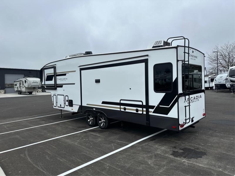 With any Arcadia Super Lite fifth wheel by Keystone, you will enjoy easy-to-tow lengths, unmatched storage, and plenty of windows to let the outdoor views in. The structural I-beam frame will provide a strong foundation to your RV, and the Full pass-through storage for all your equipment and camping gear. You will be able to camp in cold and hot climates thanks to the Peak Weather Package that includes a heated and enclosed underbelly, two Furrion A/C for cool temperatures in the summer, and Keystone's exclusive HyperDeck floor that adds an additional layer of insulation to your floor. The interior will make you feel at home with residential hardware, seamless pressed countertops, black roller shades, and ample storage space. Sometimes the best things come in smaller packages; choose a Arcadia Super Lite today!