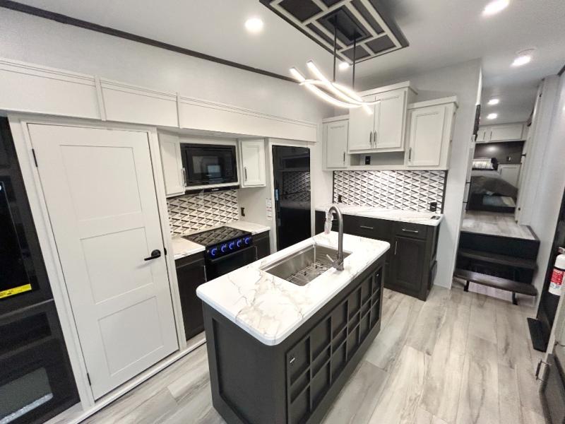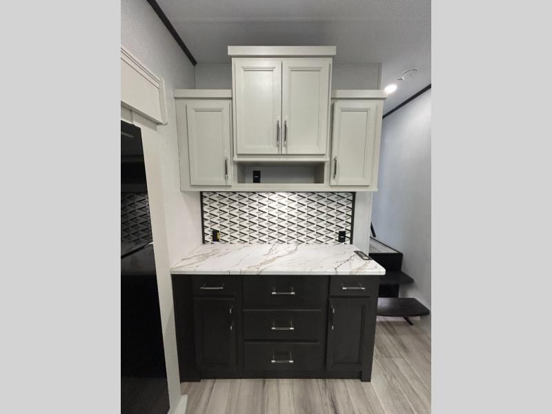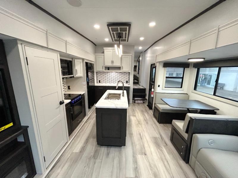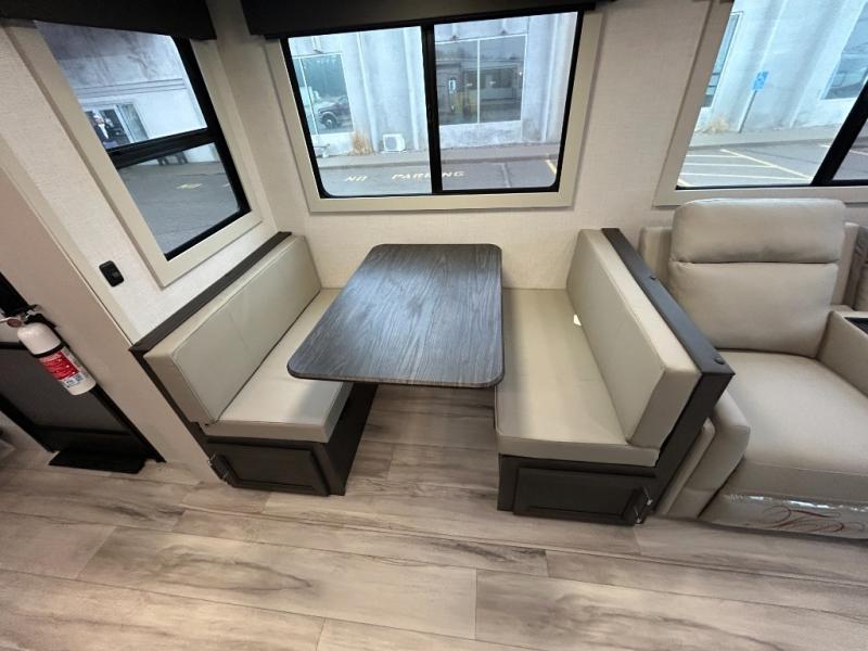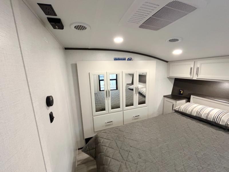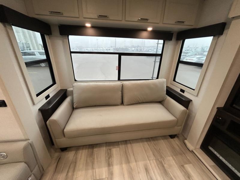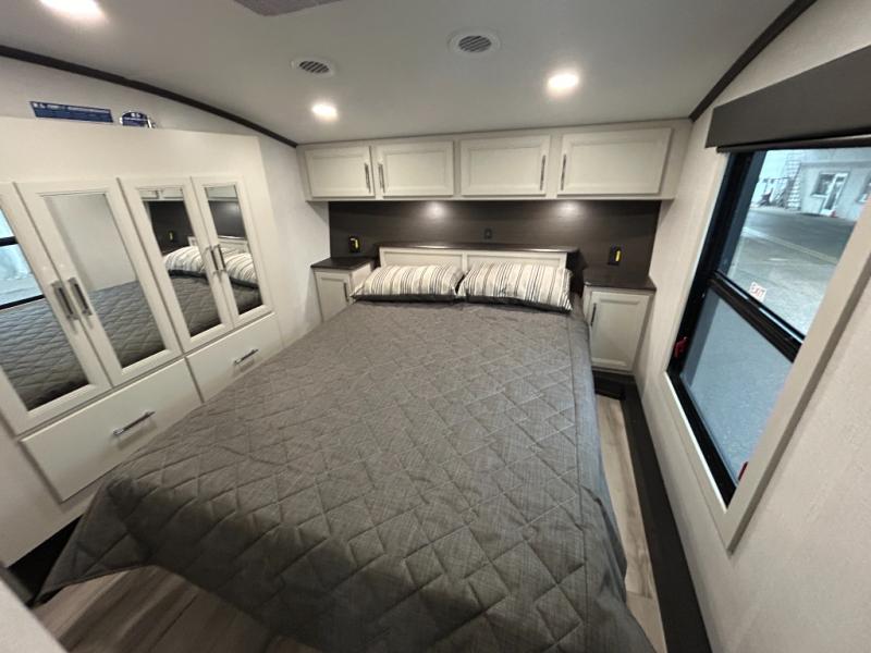 Make each camping trip complete with this fifth wheel in tow! The chef of your group will love making meals each day in the fully equipped kitchen that includes a kitchen island, a hutch, plus a pantry for food storage. The booth dinette will provide a place to dine each day, and the theater seating is right across from the TV with storage behind and a fireplace for easy viewing. And if you're not needing additional sleeping space you can switch out the booth dinette for the optional free-standing dinette! If you have guests, they can sleep on the rear XL sofa sleeper each night that extends to king-size, while you take the front private bedroom. Here, you'll find a queen bed, a wardrobe slide out, plus dual nightstands for your things.