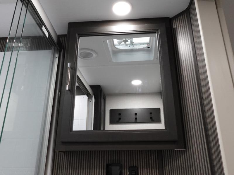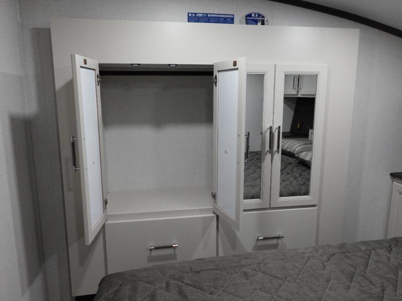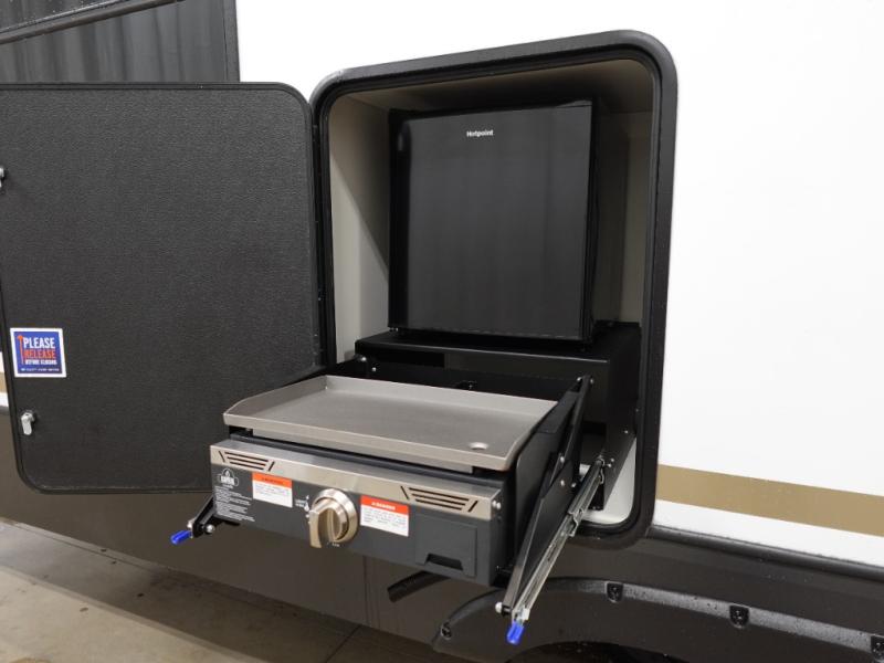 Camping is made easy in this fifth wheel! Once you arrive at the campground, you can enter in through the LCI solid entry steps and start cooking a delicious meal in the middle kitchen with the 21" Furrion range with Piezo ignition,10 cu. ft. 12V "Solar Friendly" refrigerator, and 0.9 cu. ft. microwave to pop a bag of popcorn for movie night. The rear living area offers a more at-home feel with a rear entertainment center with a fireplace, theater seating, and plenty of space to move about thanks to the opposing slide outs. There is also a free standing dinette to play card games and enjoy meals and an XL sofa sleeper that extends to a king-size sleeping space. The full bath includes a 48" x 30" shower with a glass door and a skylight for more standing space, and the front private bedroom includes a queen bed for a great night's rest. You'll also find a wardrobe slide here and an end table with an outlet and a USB port to charge your electronics.