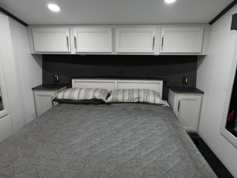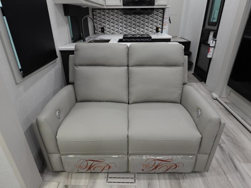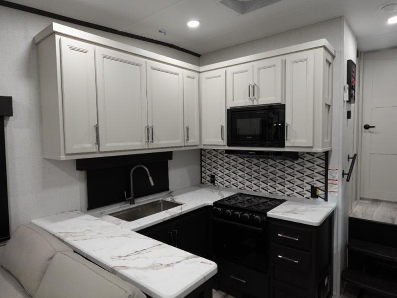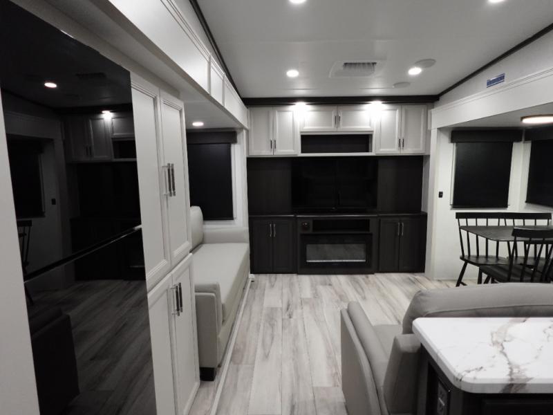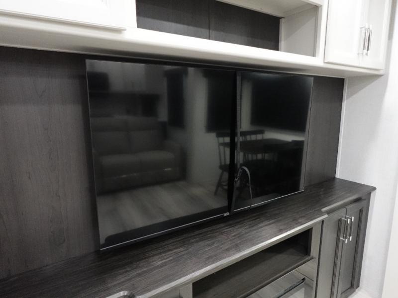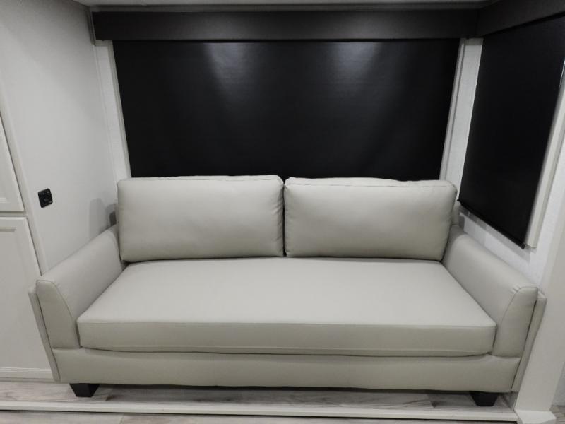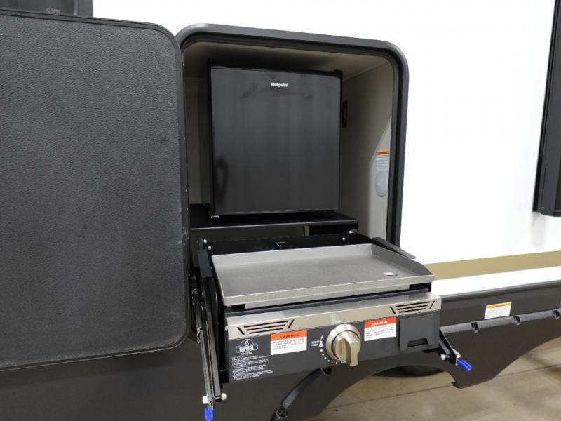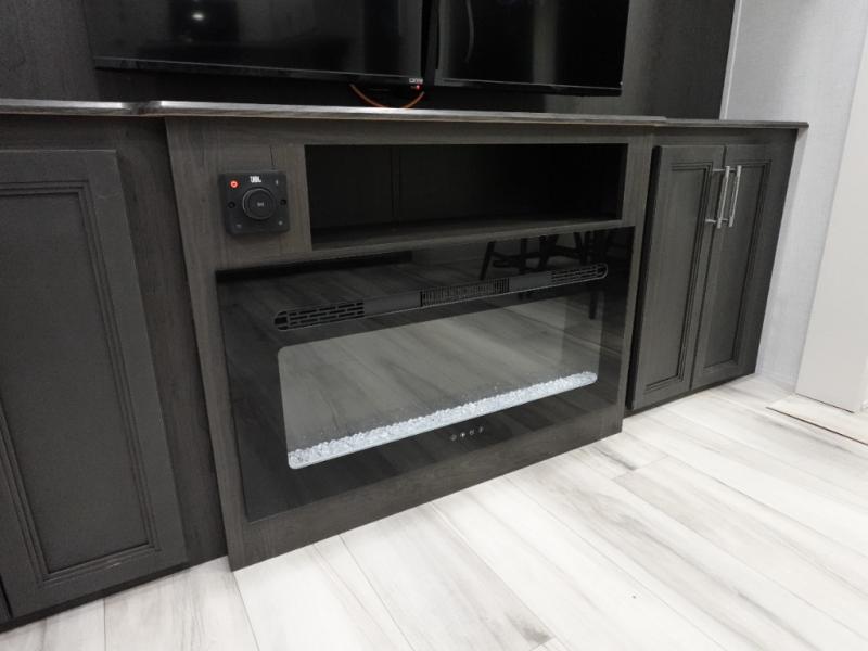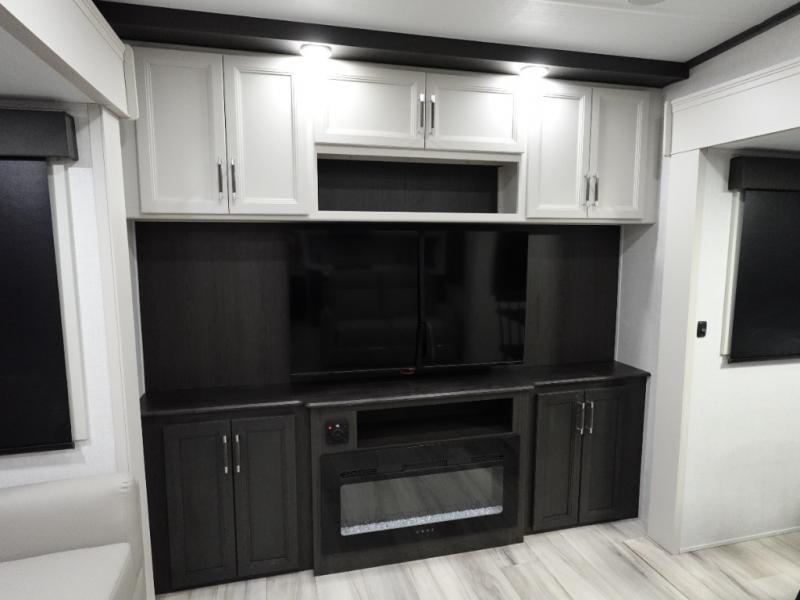 Camping is made easy in this fifth wheel! Once you arrive at the campground, you can enter in through the Composite Stow Away steps and start cooking a delicious meal in the middle kitchen with the 21" Furrion range with Piezo ignition,12V "Solar Friendly" refrigerator, and 0.9 cu. ft. microwave to pop a bag of popcorn for movie night. The rear living area offers a more at-home feel with a rear entertainment center with a fireplace, theater seating, and plenty of space to move about thanks to the opposing slide outs. There is also a free-standing dinette to play card games and enjoy meals and an XL sofa sleeper that extends to a king-size sleeping space. The full bath includes a 48" x 30" shower with a glass door and a skylight for more standing space, and the front private bedroom includes a queen bed for a great night's rest. You'll also find a wardrobe slide here and two two nightstands with an outlet to charge your electronics.