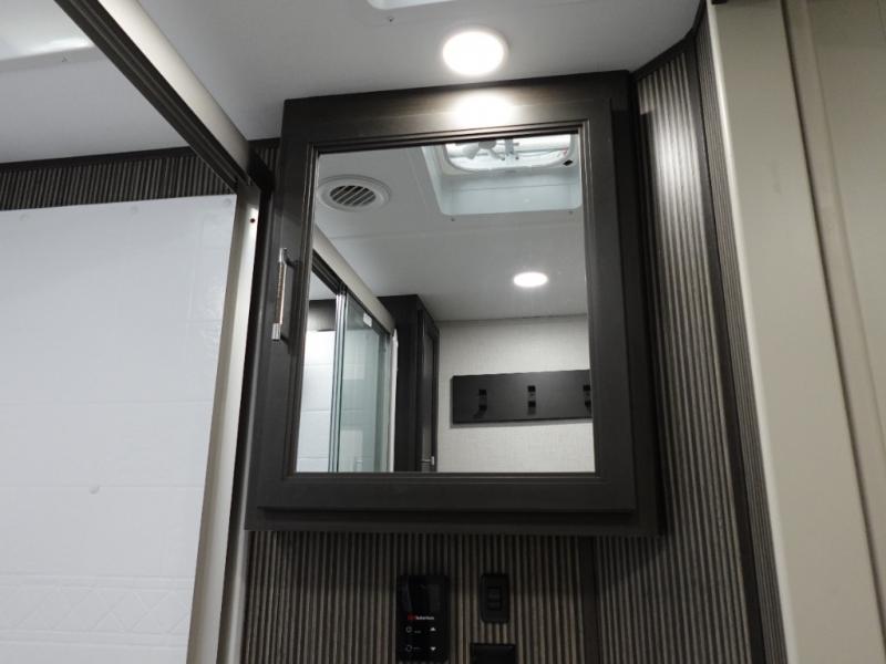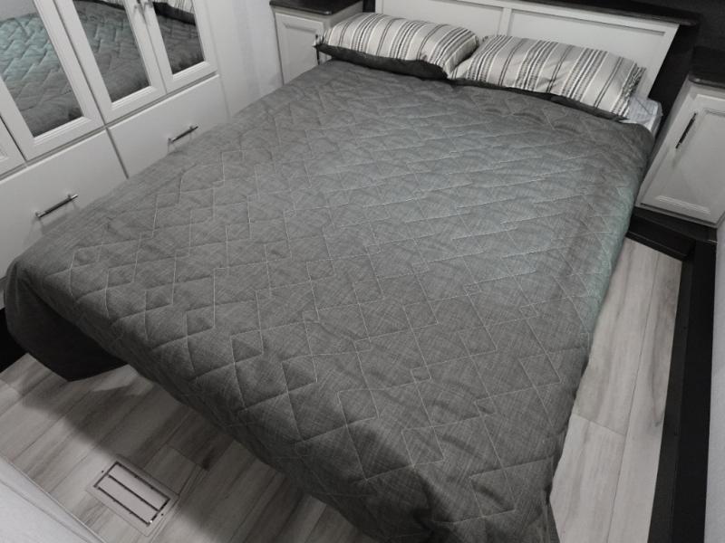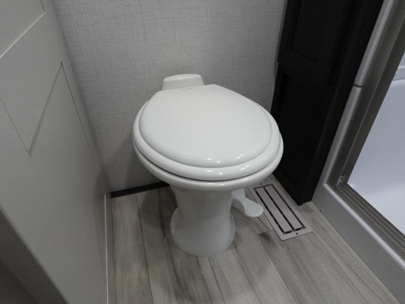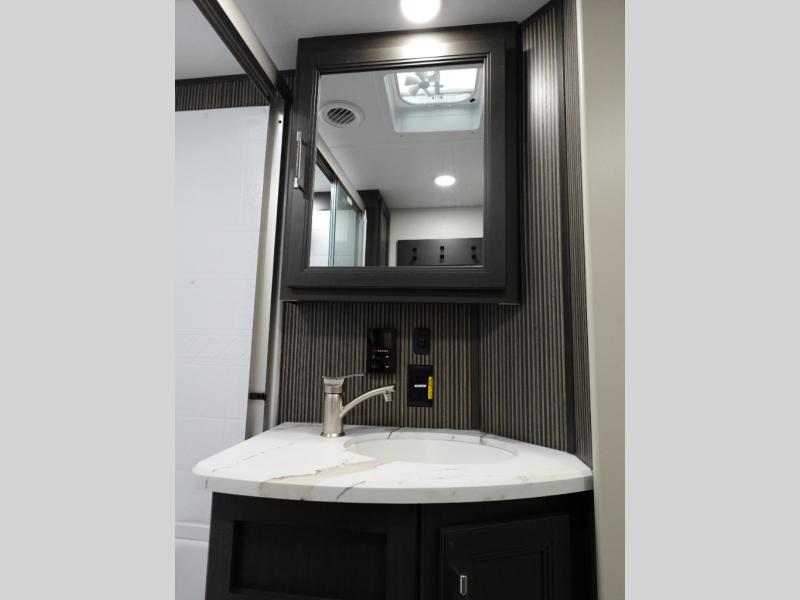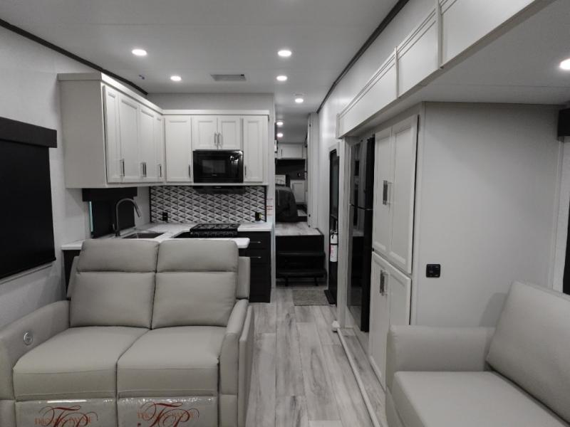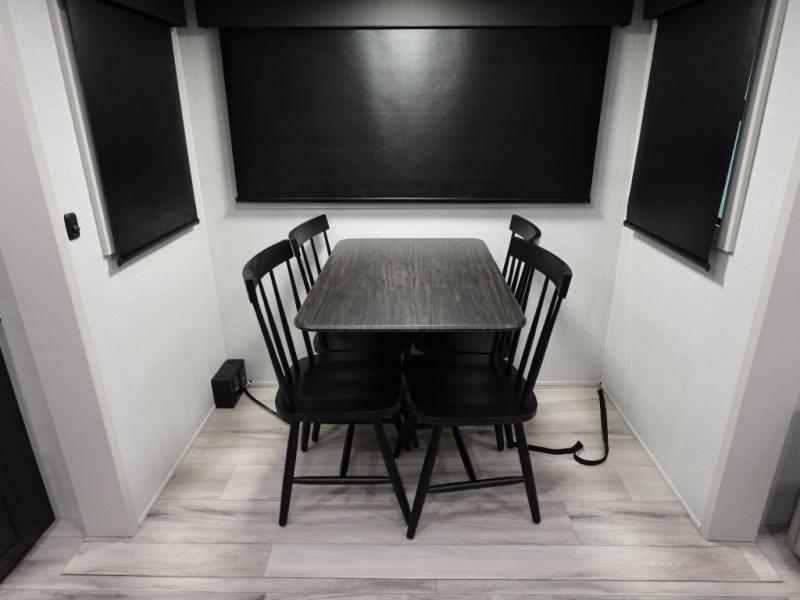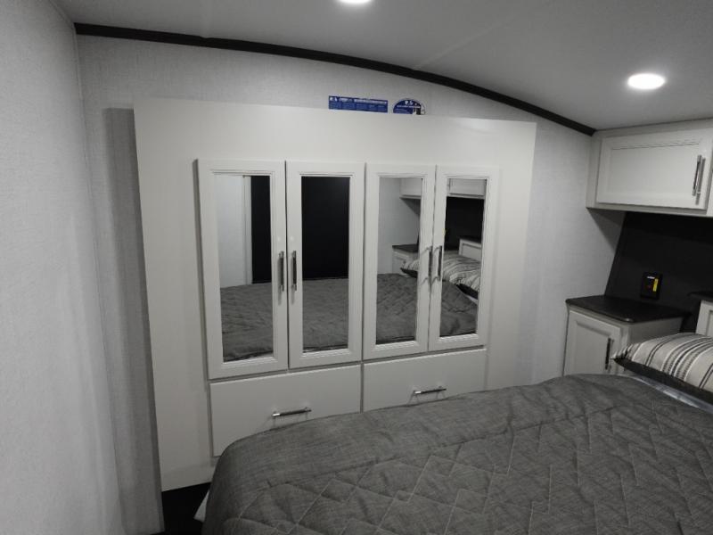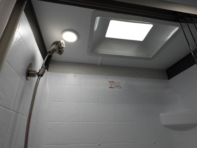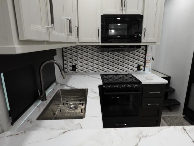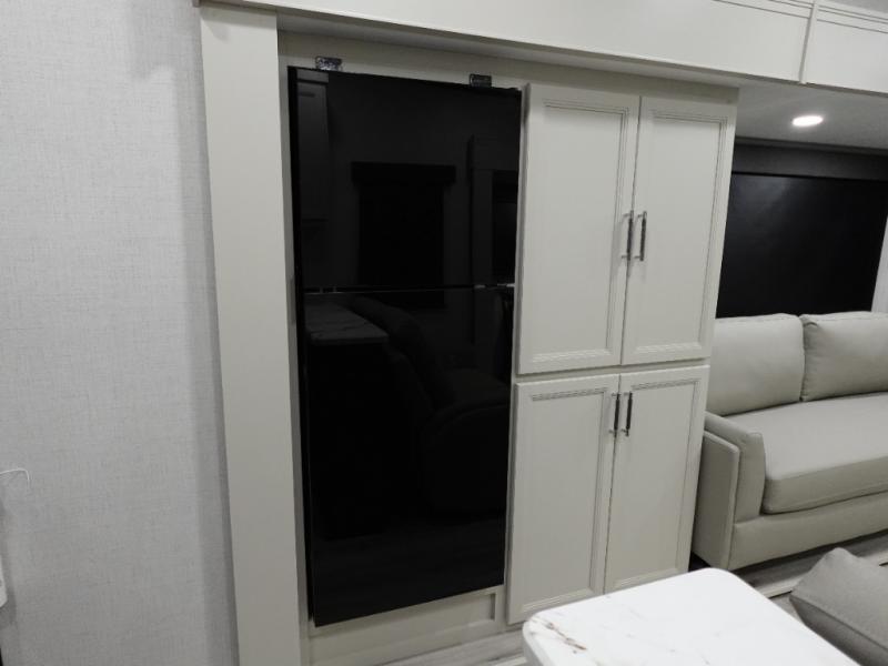 Camping is made easy in this fifth wheel! Once you arrive at the campground, you can enter in through the Composite Stow Away steps and start cooking a delicious meal in the middle kitchen with the 21" Furrion range with Piezo ignition,12V "Solar Friendly" refrigerator, and 0.9 cu. ft. microwave to pop a bag of popcorn for movie night. The rear living area offers a more at-home feel with a rear entertainment center with a fireplace, theater seating, and plenty of space to move about thanks to the opposing slide outs. There is also a free-standing dinette to play card games and enjoy meals and an XL sofa sleeper that extends to a king-size sleeping space. The full bath includes a 48" x 30" shower with a glass door and a skylight for more standing space, and the front private bedroom includes a queen bed for a great night's rest. You'll also find a wardrobe slide here and two two nightstands with an outlet to charge your electronics.