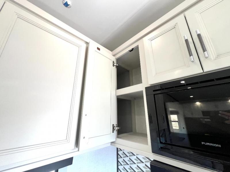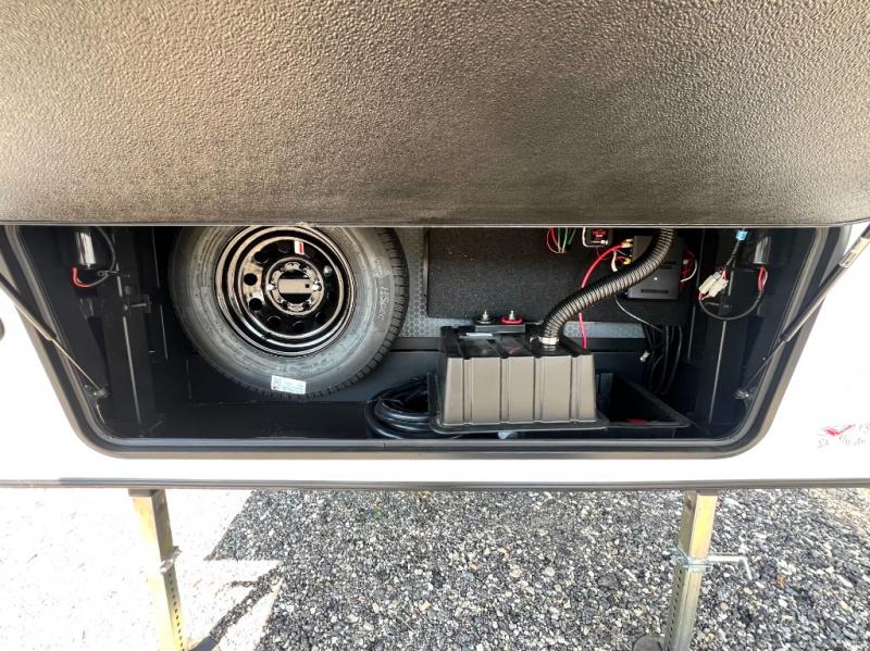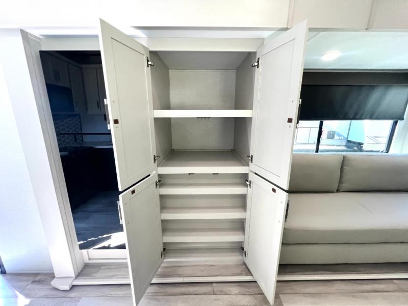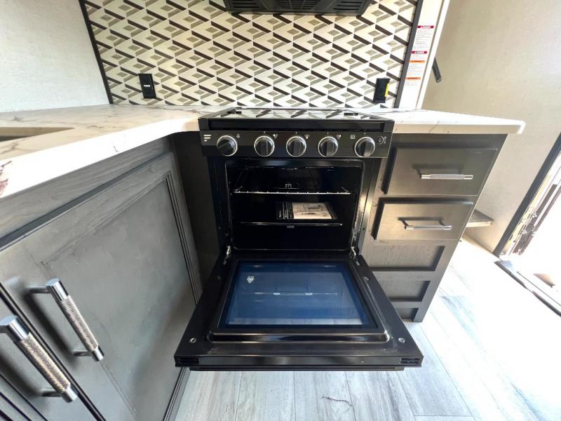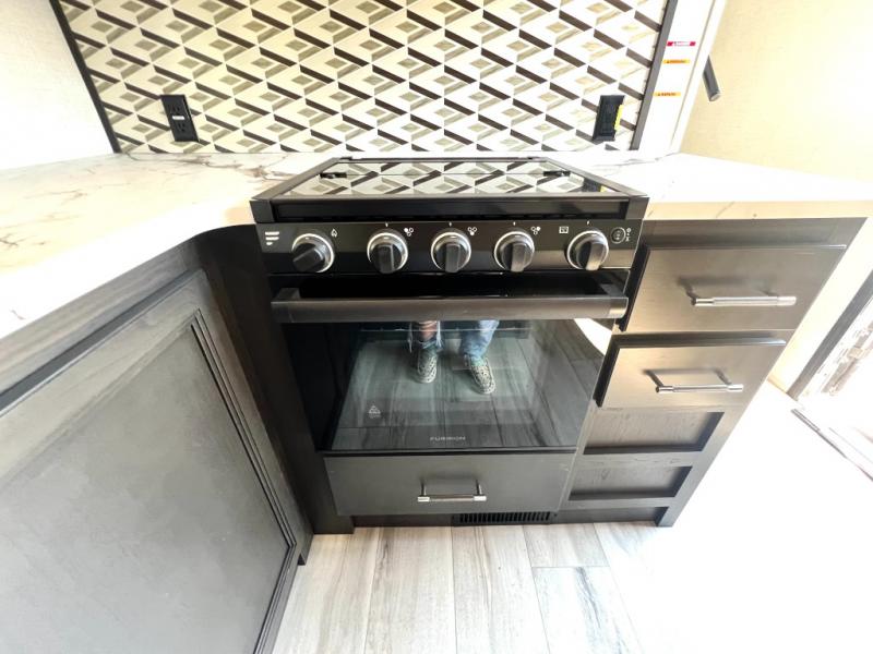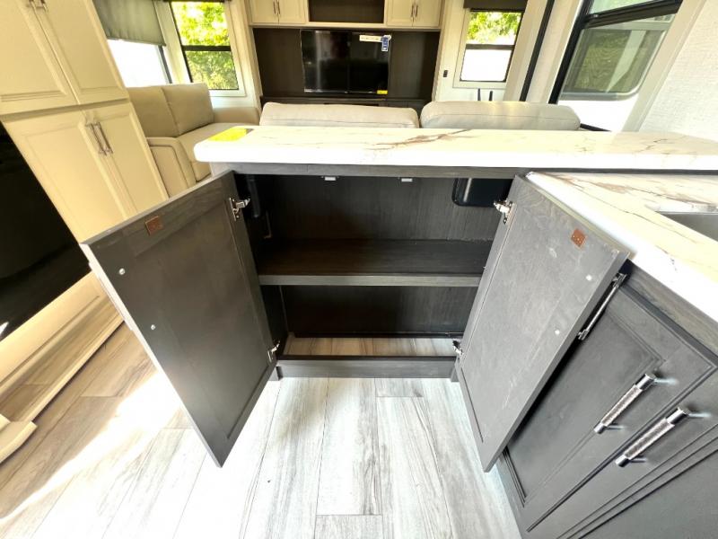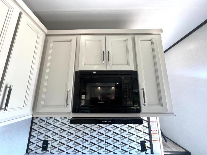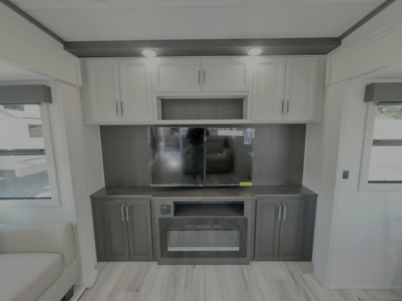 Camping is made easy in this fifth wheel! Once you arrive at the campground, you can enter in through the Composite Stow Away steps and start cooking a delicious meal in the middle kitchen with the 21" Furrion range with Piezo ignition,12V "Solar Friendly" refrigerator, and 0.9 cu. ft. microwave to pop a bag of popcorn for movie night. The rear living area offers a more at-home feel with a rear entertainment center with a fireplace, theater seating, and plenty of space to move about thanks to the opposing slide outs. There is also a free-standing dinette to play card games and enjoy meals and an XL sofa sleeper that extends to a king-size sleeping space. The full bath includes a 48" x 30" shower with a glass door and a skylight for more standing space, and the front private bedroom includes a queen bed for a great night's rest. You'll also find a wardrobe slide here and two two nightstands with an outlet to charge your electronics.