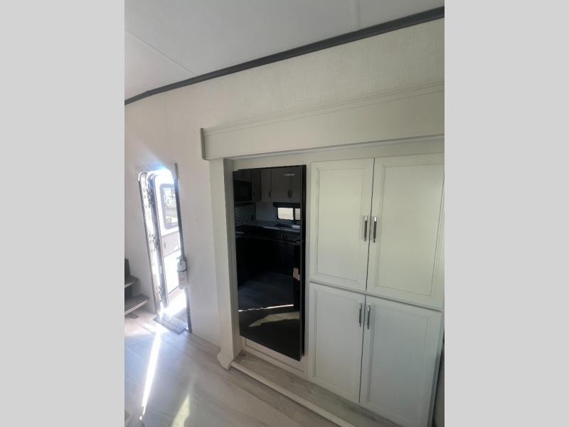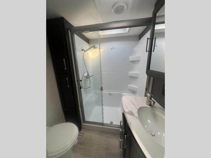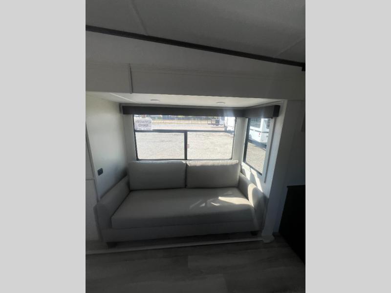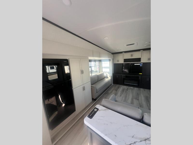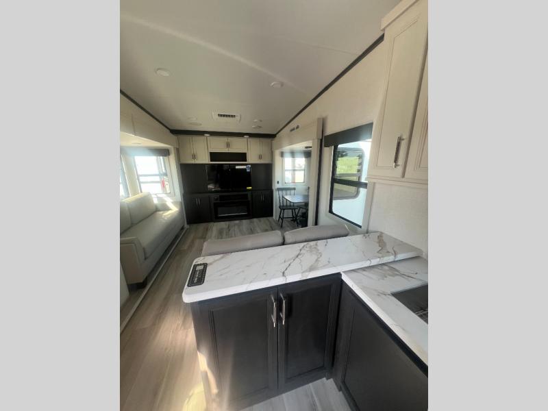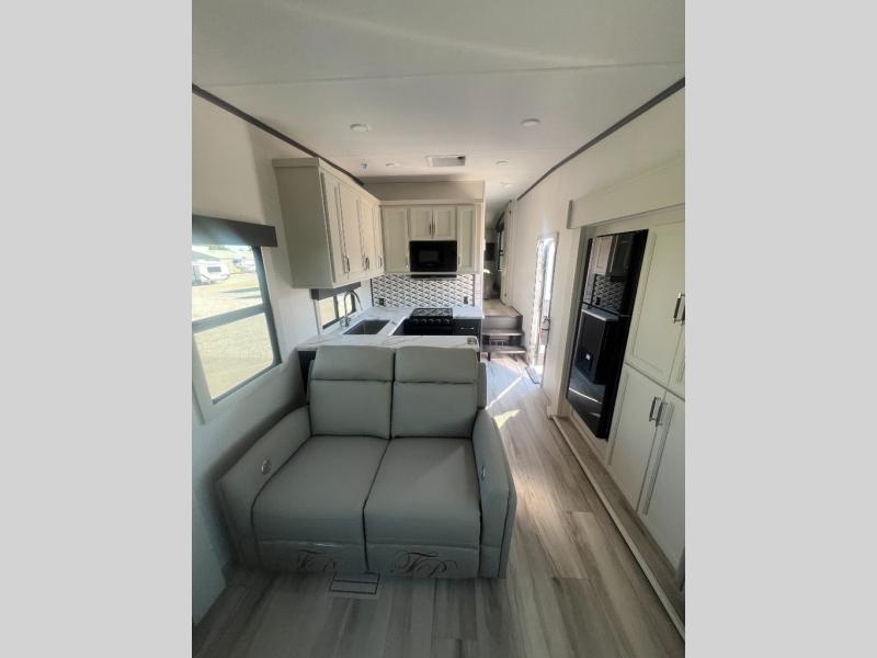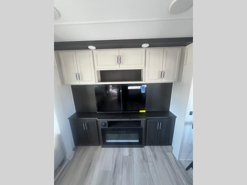 Camping is made easy in this fifth wheel! Once you arrive at the campground, you can enter in through the Composite Stow Away steps and start cooking a delicious meal in the middle kitchen with the 21" Furrion range with Piezo ignition,12V "Solar Friendly" refrigerator, and 0.9 cu. ft. microwave to pop a bag of popcorn for movie night. The rear living area offers a more at-home feel with a rear entertainment center with a fireplace, theater seating, and plenty of space to move about thanks to the opposing slide outs. There is also a free-standing dinette to play card games and enjoy meals and an XL sofa sleeper that extends to a king-size sleeping space. The full bath includes a 48" x 30" shower with a glass door and a skylight for more standing space, and the front private bedroom includes a queen bed for a great night's rest. You'll also find a wardrobe slide here and two two nightstands with an outlet to charge your electronics.