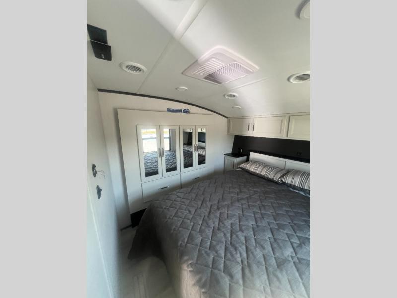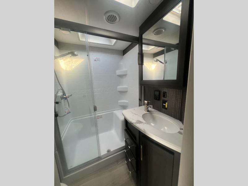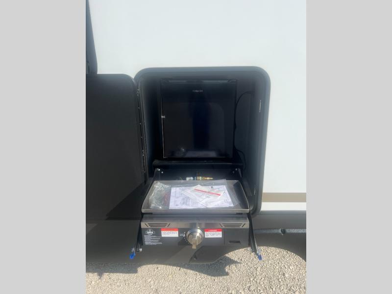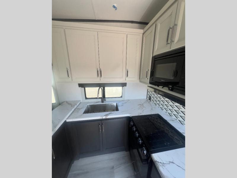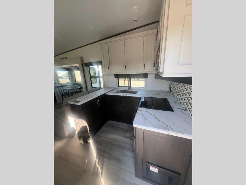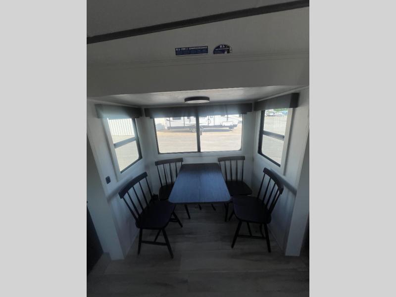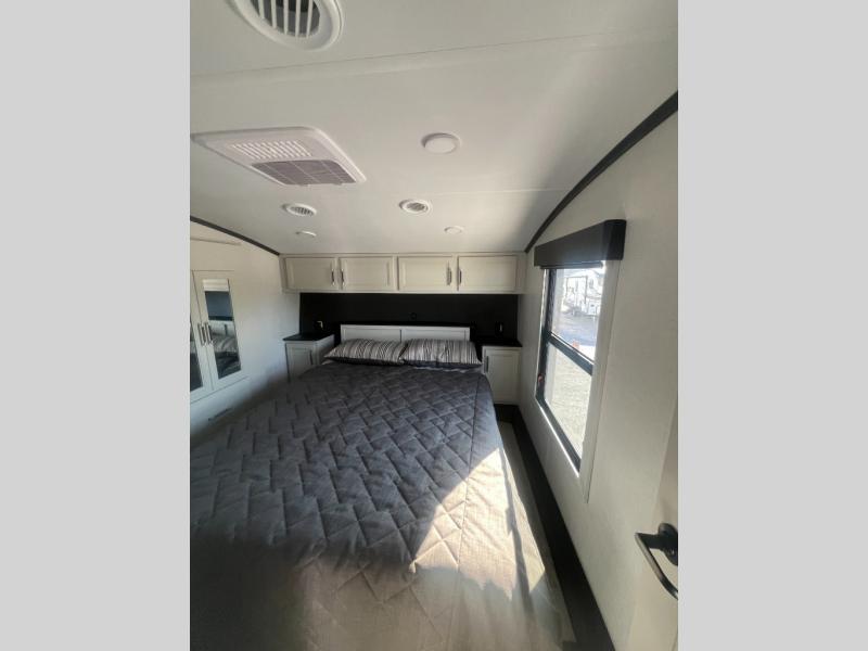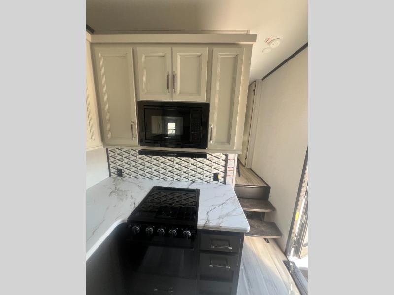 Camping is made easy in this fifth wheel! Once you arrive at the campground, you can enter in through the Composite Stow Away steps and start cooking a delicious meal in the middle kitchen with the 21" Furrion range with Piezo ignition,12V "Solar Friendly" refrigerator, and 0.9 cu. ft. microwave to pop a bag of popcorn for movie night. The rear living area offers a more at-home feel with a rear entertainment center with a fireplace, theater seating, and plenty of space to move about thanks to the opposing slide outs. There is also a free-standing dinette to play card games and enjoy meals and an XL sofa sleeper that extends to a king-size sleeping space. The full bath includes a 48" x 30" shower with a glass door and a skylight for more standing space, and the front private bedroom includes a queen bed for a great night's rest. You'll also find a wardrobe slide here and two two nightstands with an outlet to charge your electronics.
