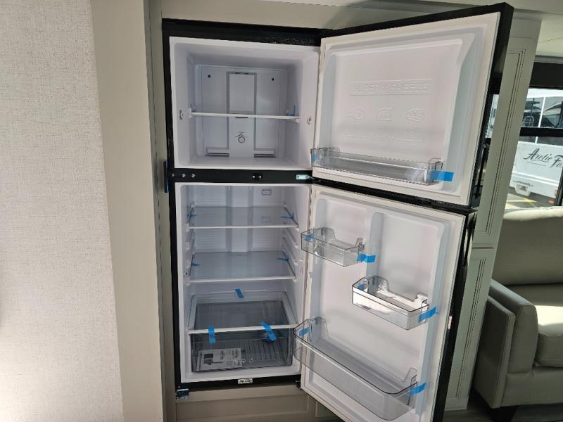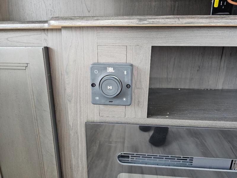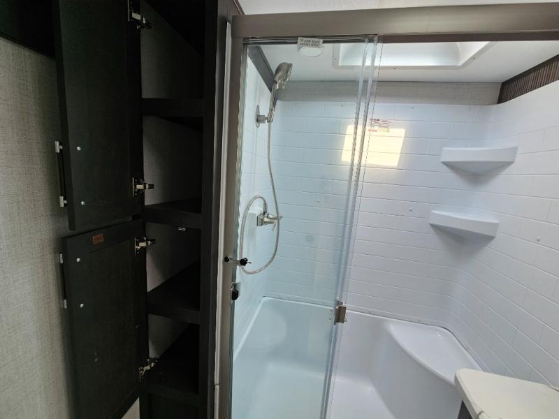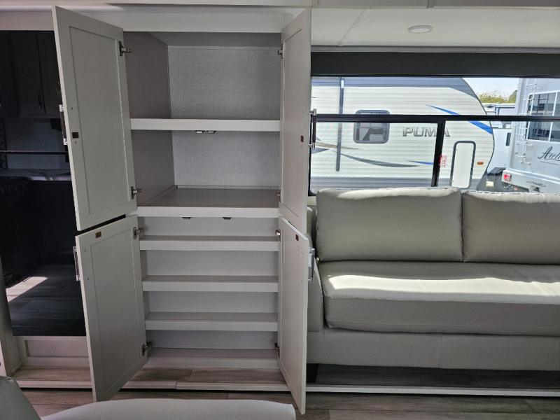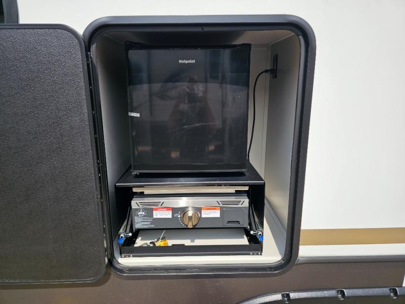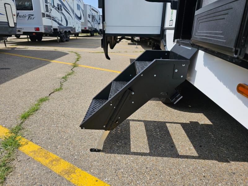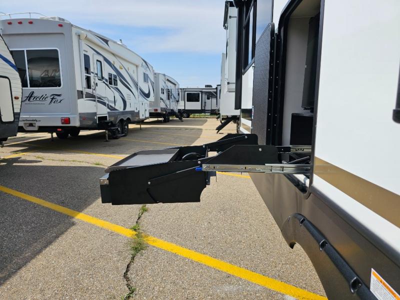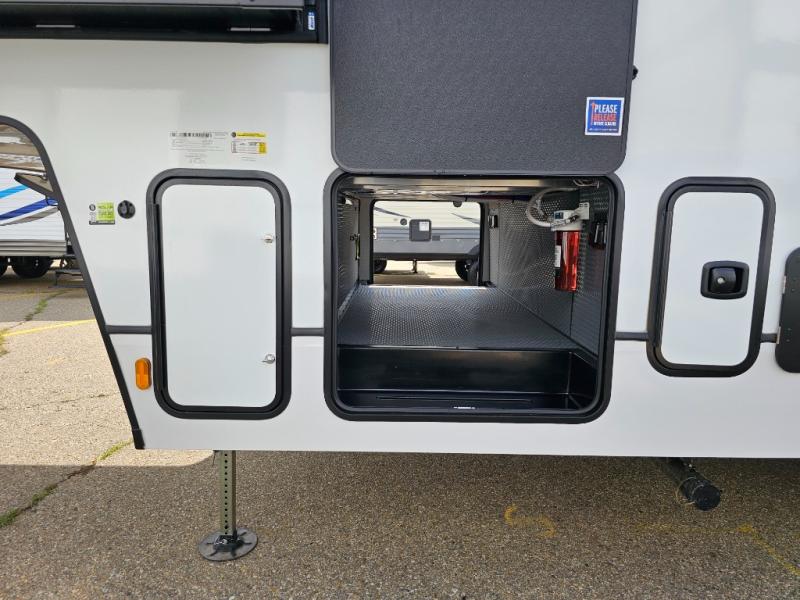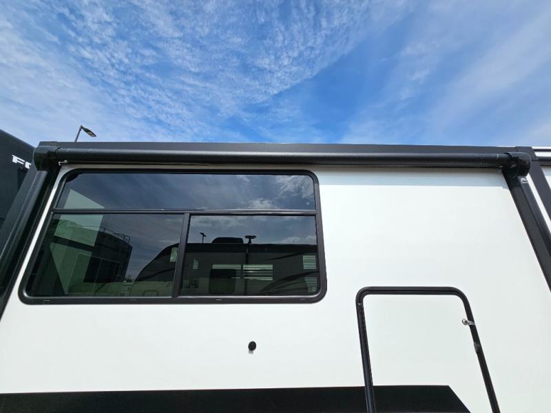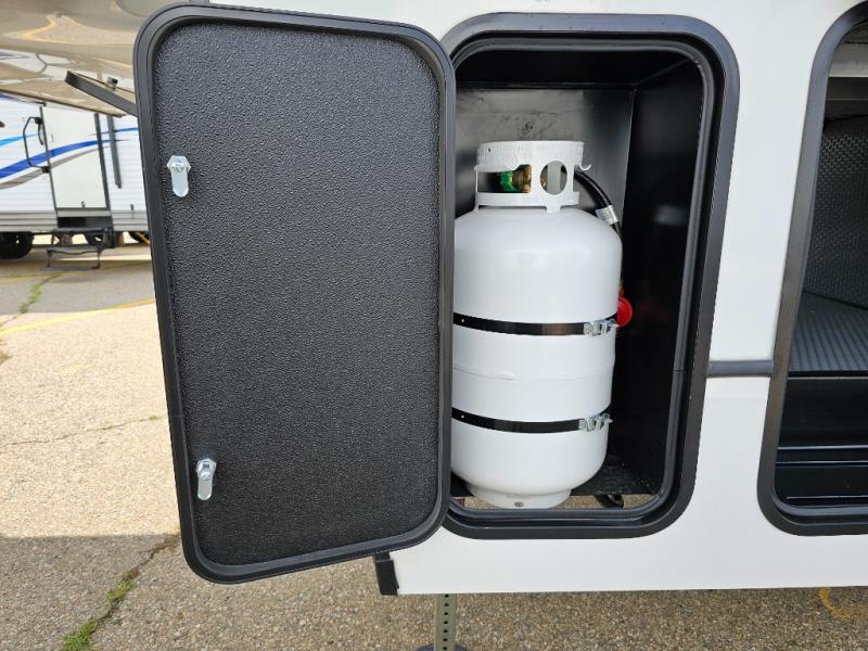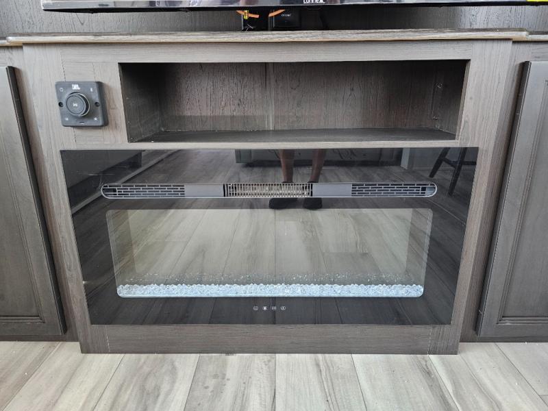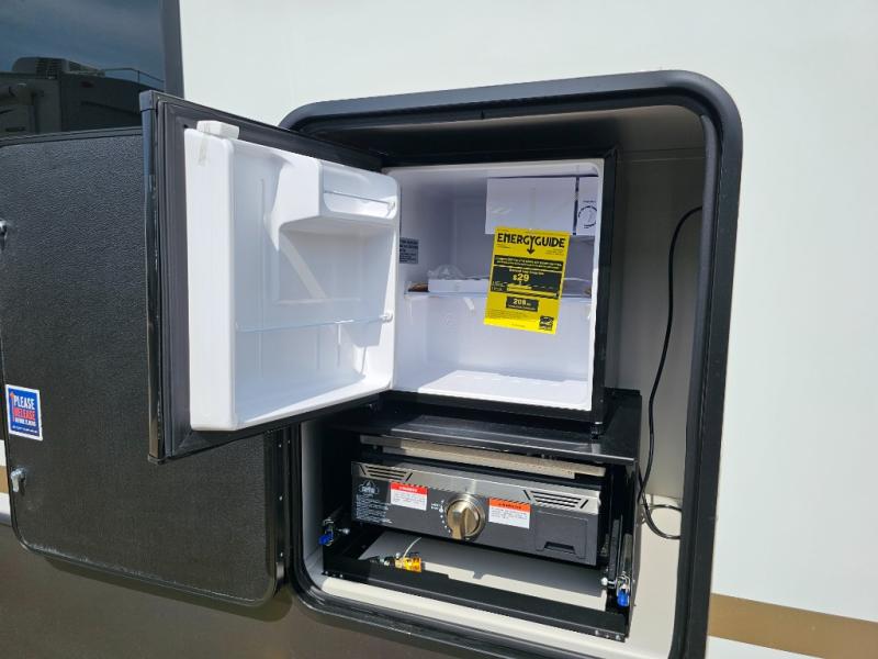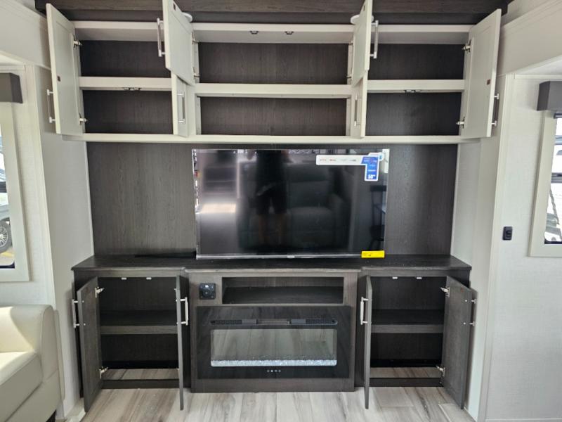Camping is made easy in this fifth wheel! Once you arrive at the campground, you can enter in through the Composite Stow Away steps and start cooking a delicious meal in the middle kitchen with the 21" Furrion range with Piezo ignition,12V "Solar Friendly" refrigerator, and 0.9 cu. ft. microwave to pop a bag of popcorn for movie night. The rear living area offers a more at-home feel with a rear entertainment center with a fireplace, theater seating, and plenty of space to move about thanks to the opposing slide outs. There is also a free-standing dinette to play card games and enjoy meals and an XL sofa sleeper that extends to a king-size sleeping space. The full bath includes a 48" x 30" shower with a glass door and a skylight for more standing space, and the front private bedroom includes a queen bed for a great night's rest. You'll also find a wardrobe slide here and two two nightstands with an outlet to charge your electronics.