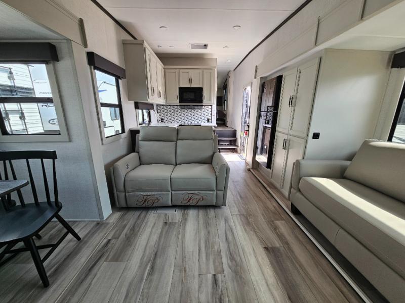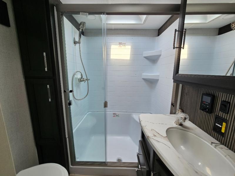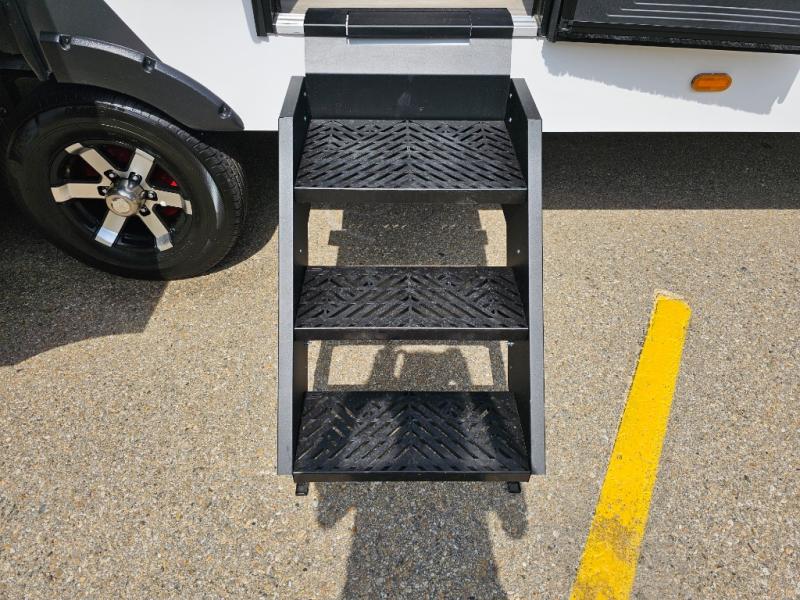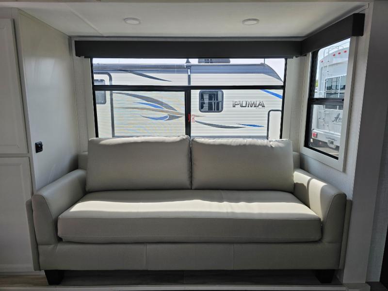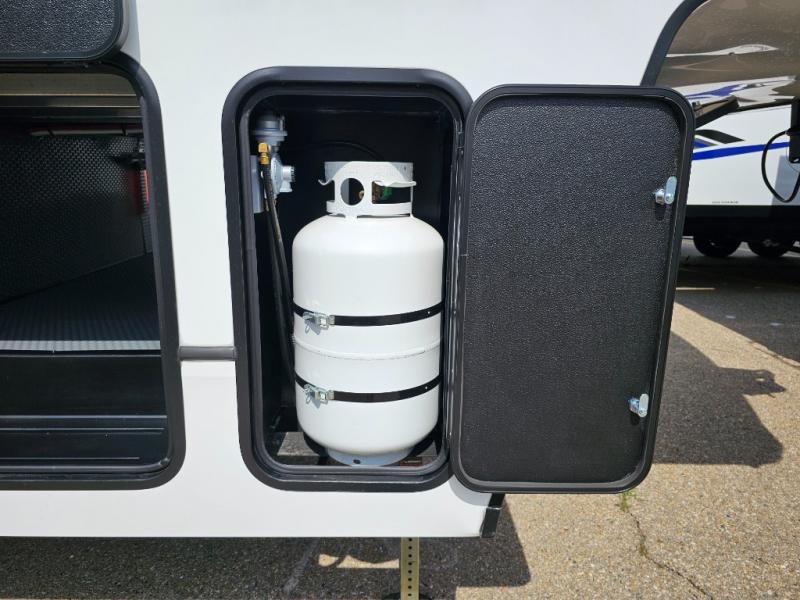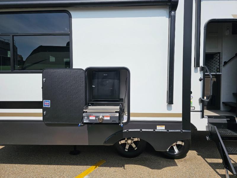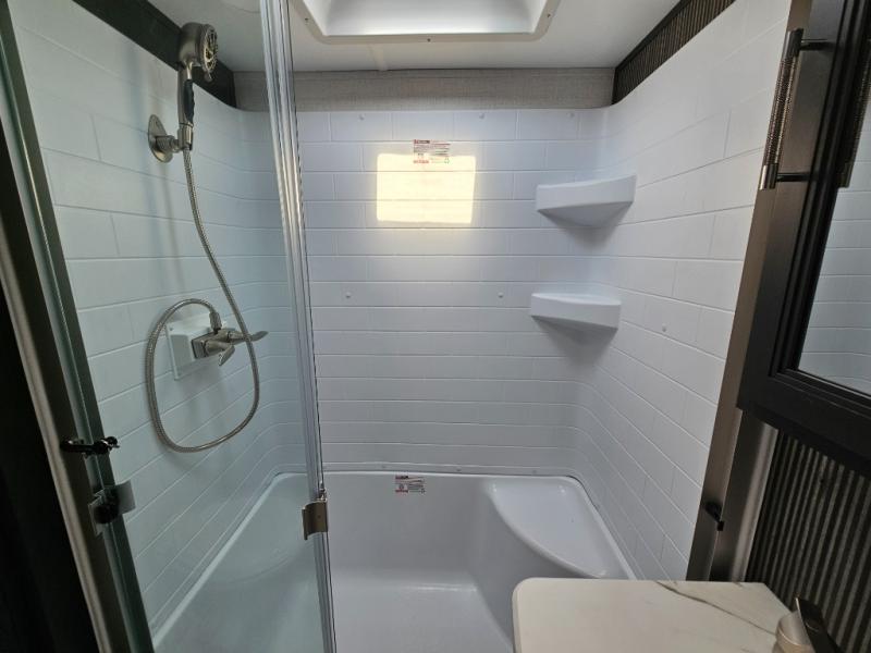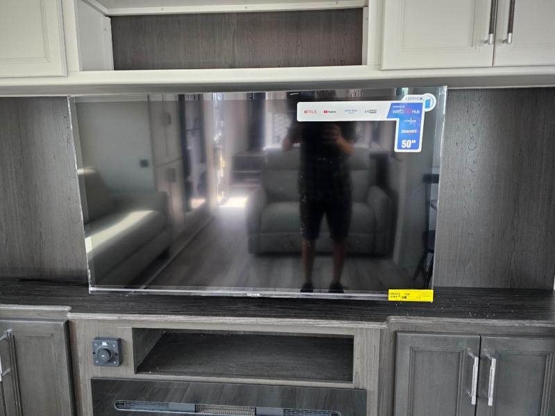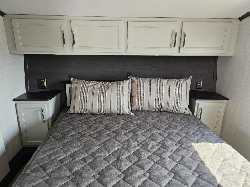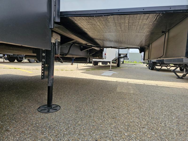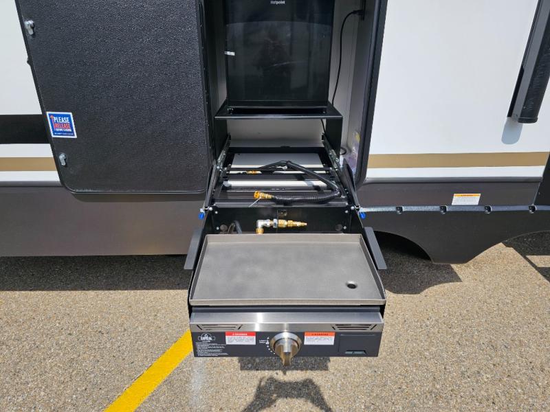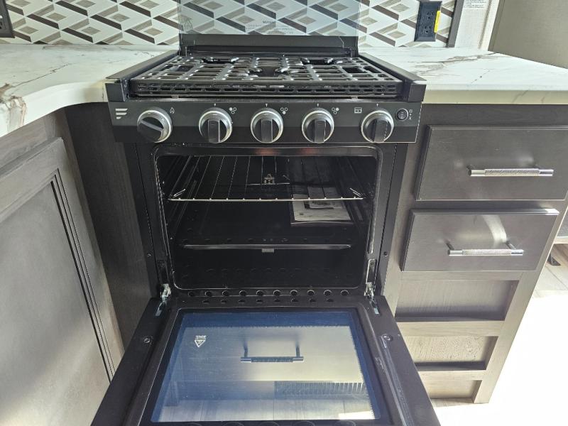 Camping is made easy in this fifth wheel! Once you arrive at the campground, you can enter in through the Composite Stow Away steps and start cooking a delicious meal in the middle kitchen with the 21" Furrion range with Piezo ignition,12V "Solar Friendly" refrigerator, and 0.9 cu. ft. microwave to pop a bag of popcorn for movie night. The rear living area offers a more at-home feel with a rear entertainment center with a fireplace, theater seating, and plenty of space to move about thanks to the opposing slide outs. There is also a free-standing dinette to play card games and enjoy meals and an XL sofa sleeper that extends to a king-size sleeping space. The full bath includes a 48" x 30" shower with a glass door and a skylight for more standing space, and the front private bedroom includes a queen bed for a great night's rest. You'll also find a wardrobe slide here and two two nightstands with an outlet to charge your electronics.