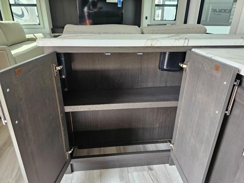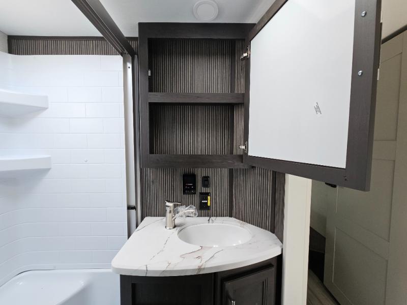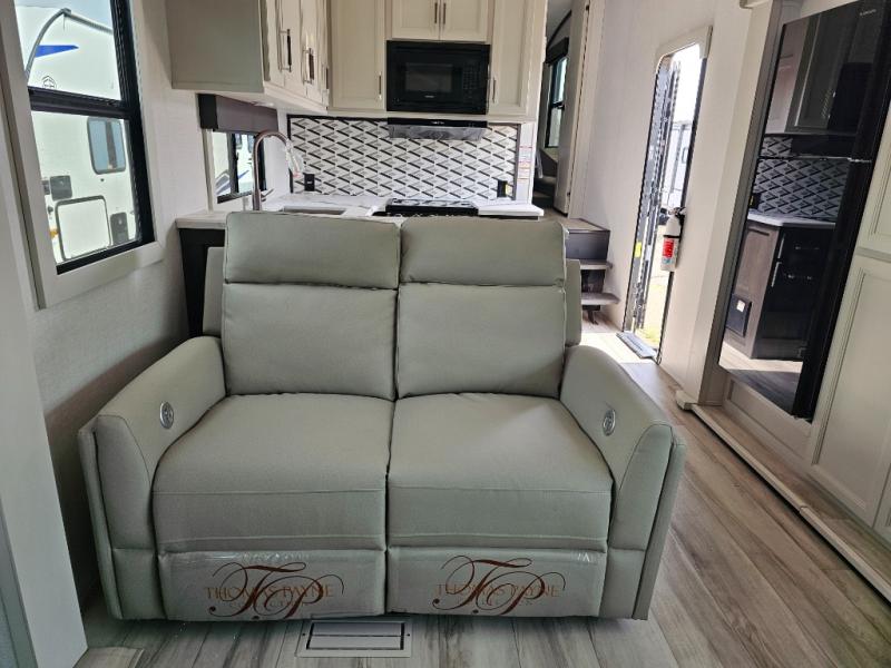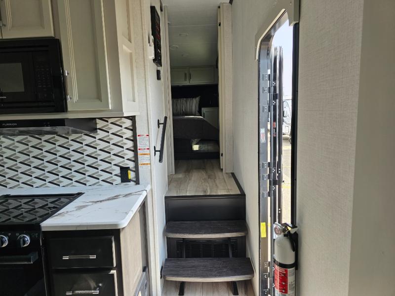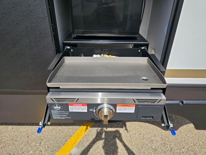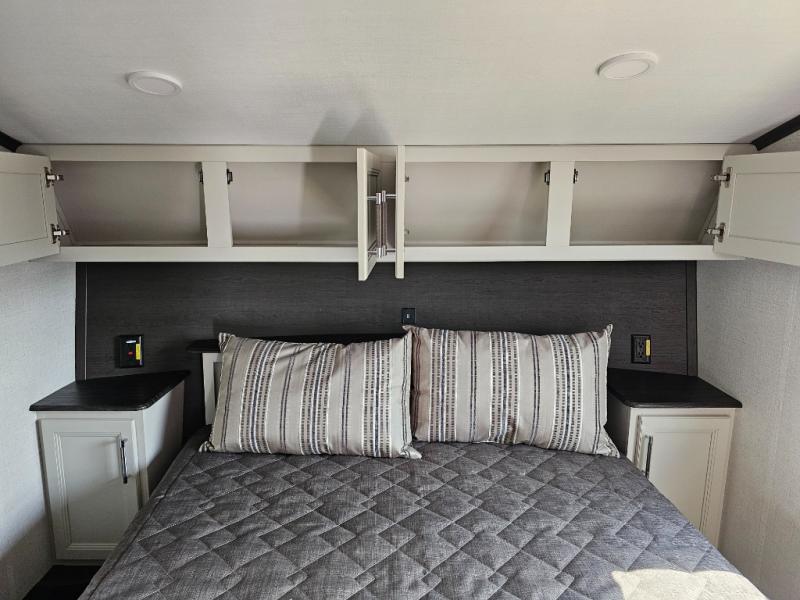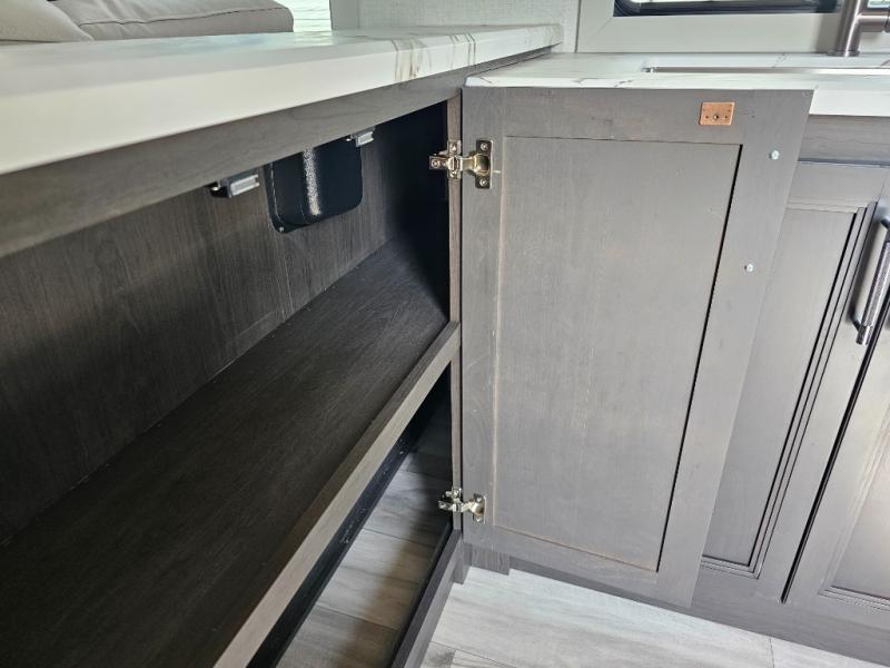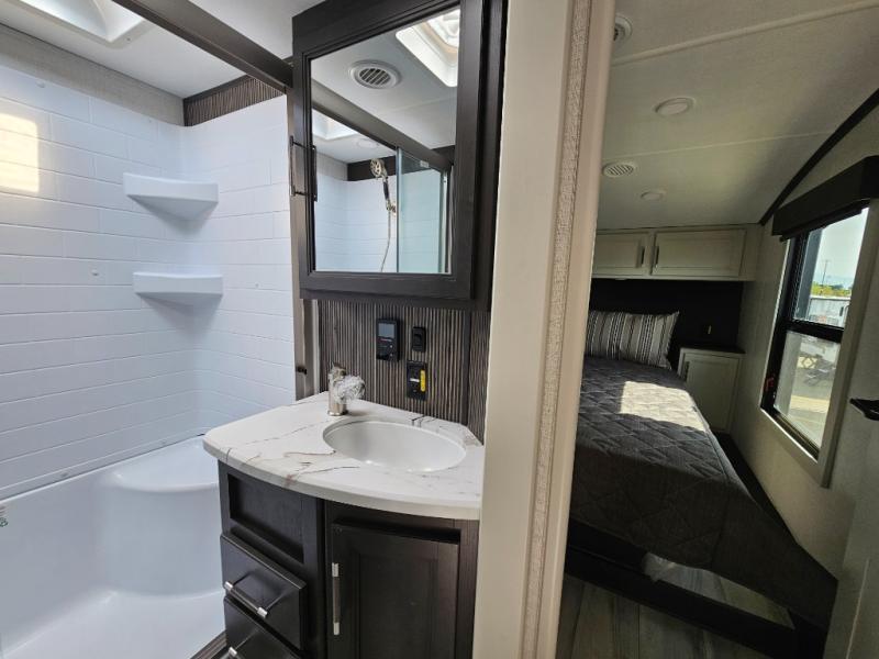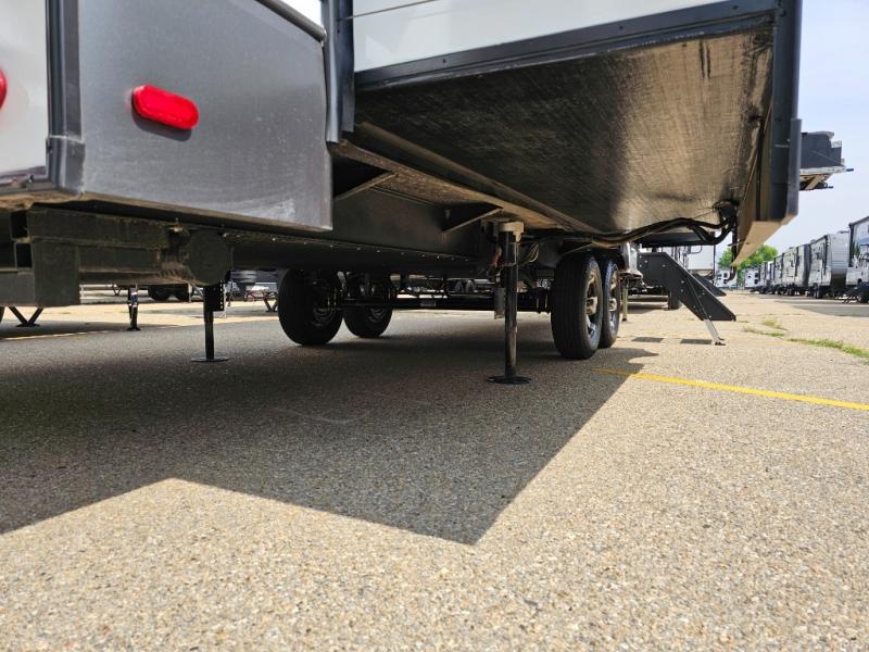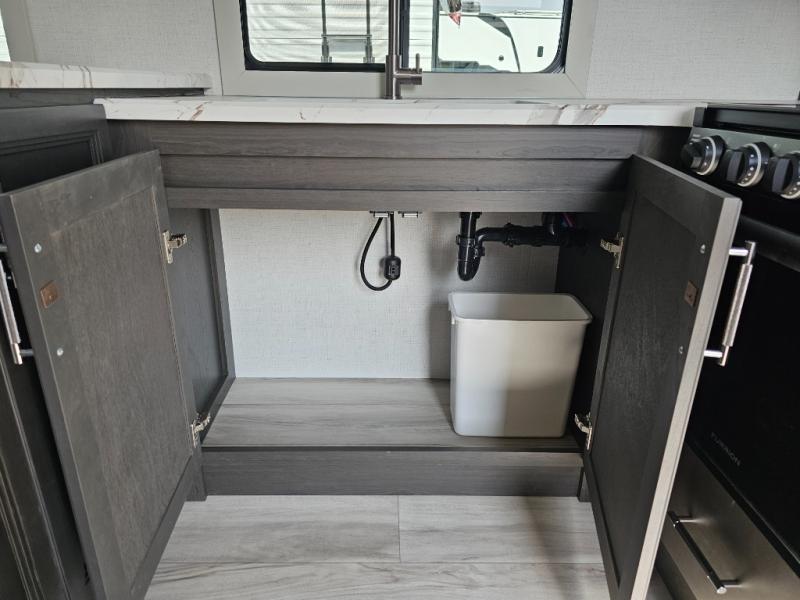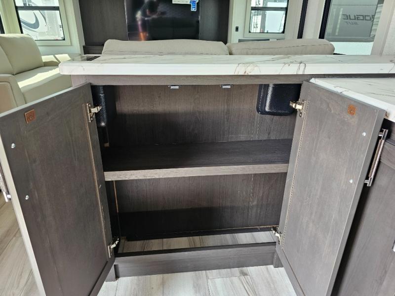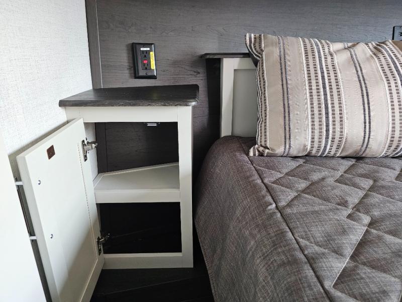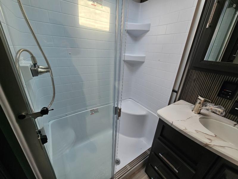 Camping is made easy in this fifth wheel! Once you arrive at the campground, you can enter in through the Composite Stow Away steps and start cooking a delicious meal in the middle kitchen with the 21" Furrion range with Piezo ignition,12V "Solar Friendly" refrigerator, and 0.9 cu. ft. microwave to pop a bag of popcorn for movie night. The rear living area offers a more at-home feel with a rear entertainment center with a fireplace, theater seating, and plenty of space to move about thanks to the opposing slide outs. There is also a free-standing dinette to play card games and enjoy meals and an XL sofa sleeper that extends to a king-size sleeping space. The full bath includes a 48" x 30" shower with a glass door and a skylight for more standing space, and the front private bedroom includes a queen bed for a great night's rest. You'll also find a wardrobe slide here and two two nightstands with an outlet to charge your electronics.